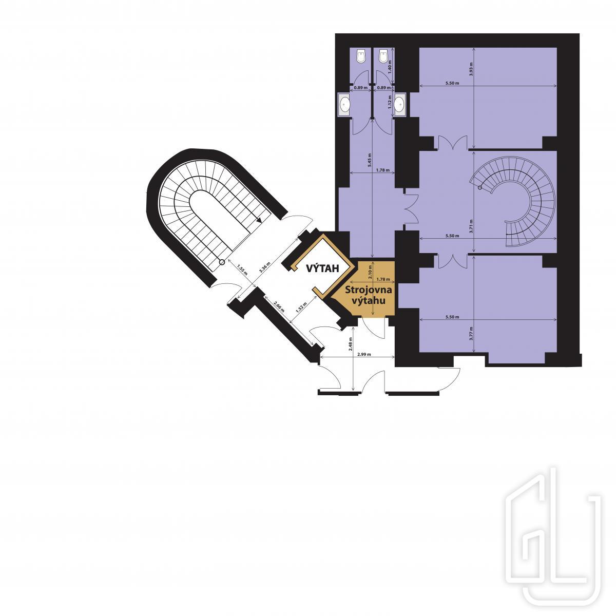 Dispozice: 7 samostatných pracovních místností, 2 kuchyňky, 6 toalet