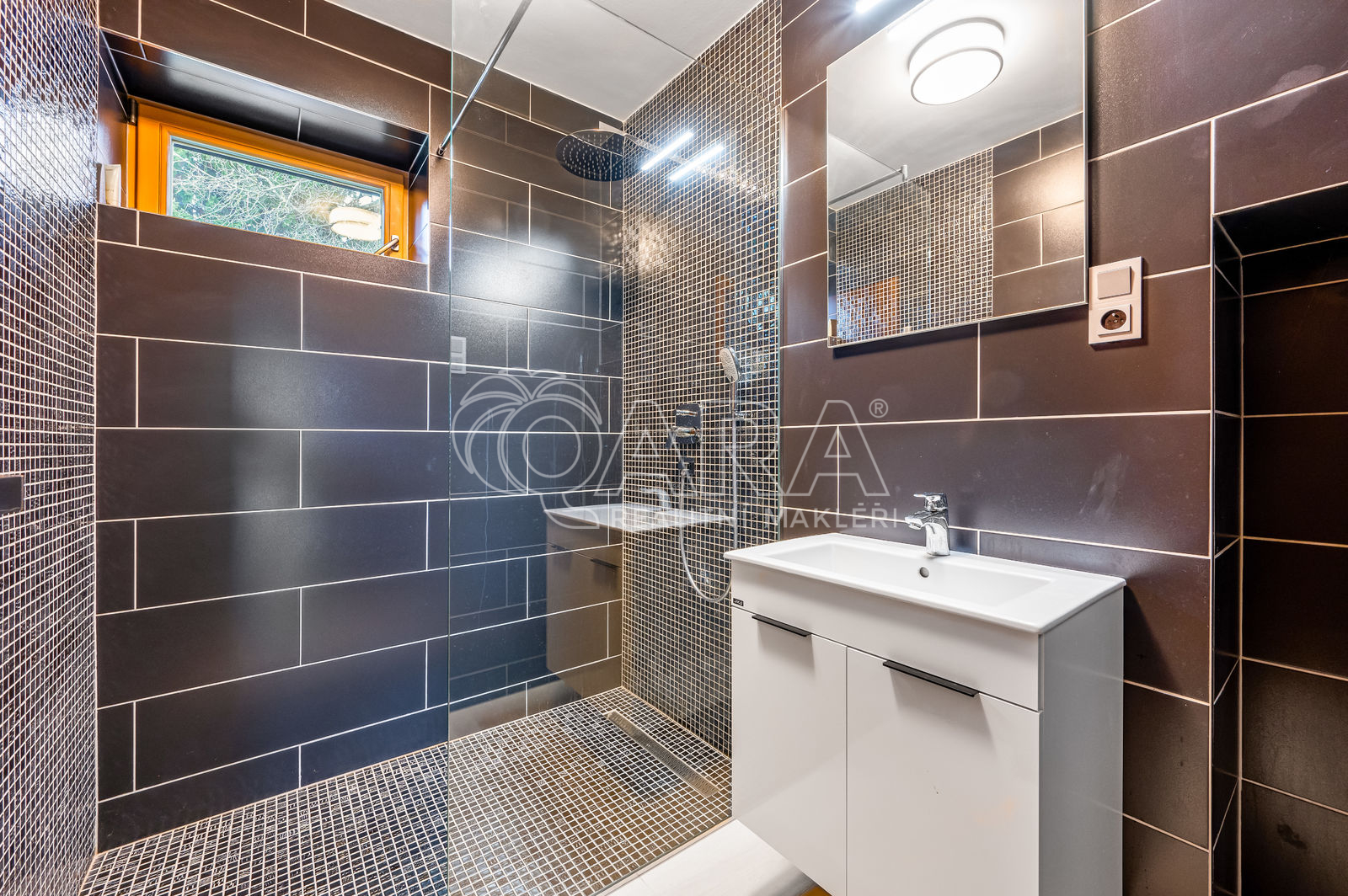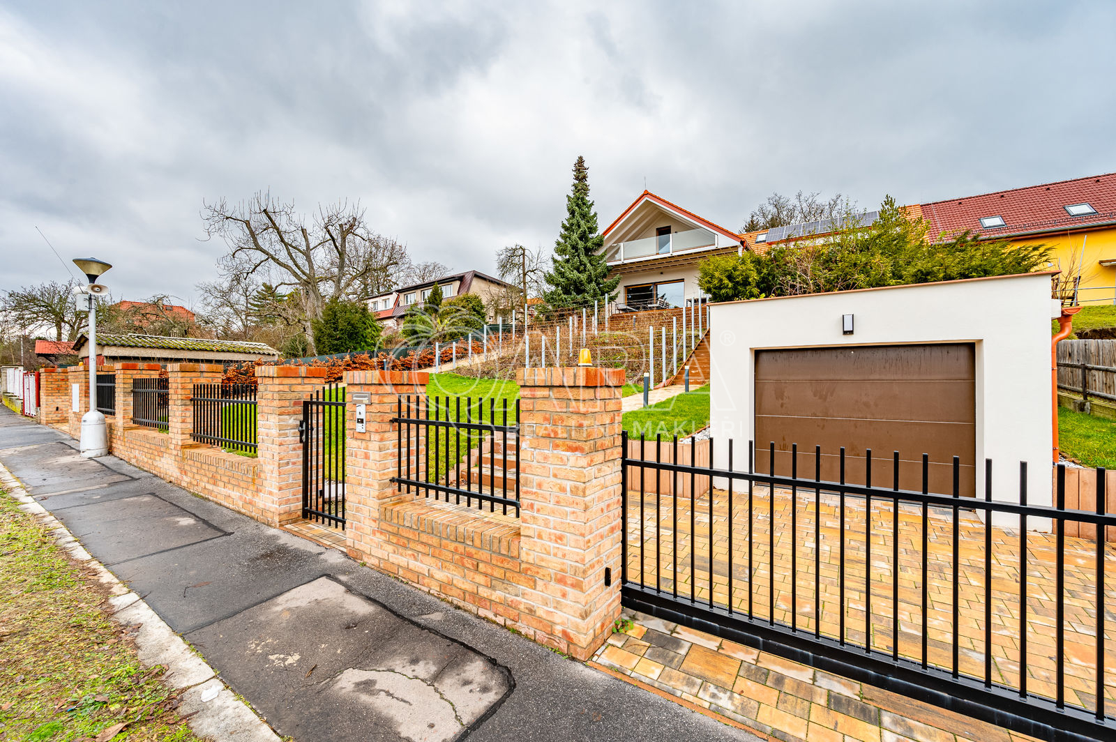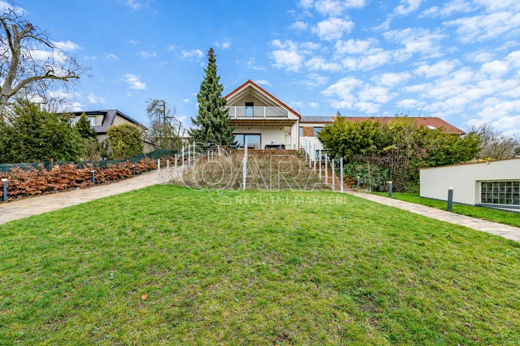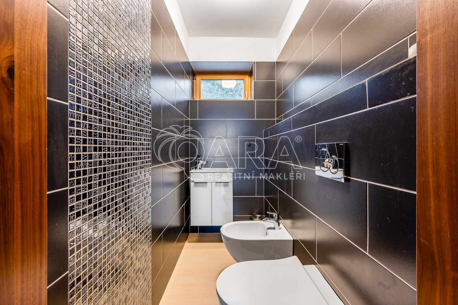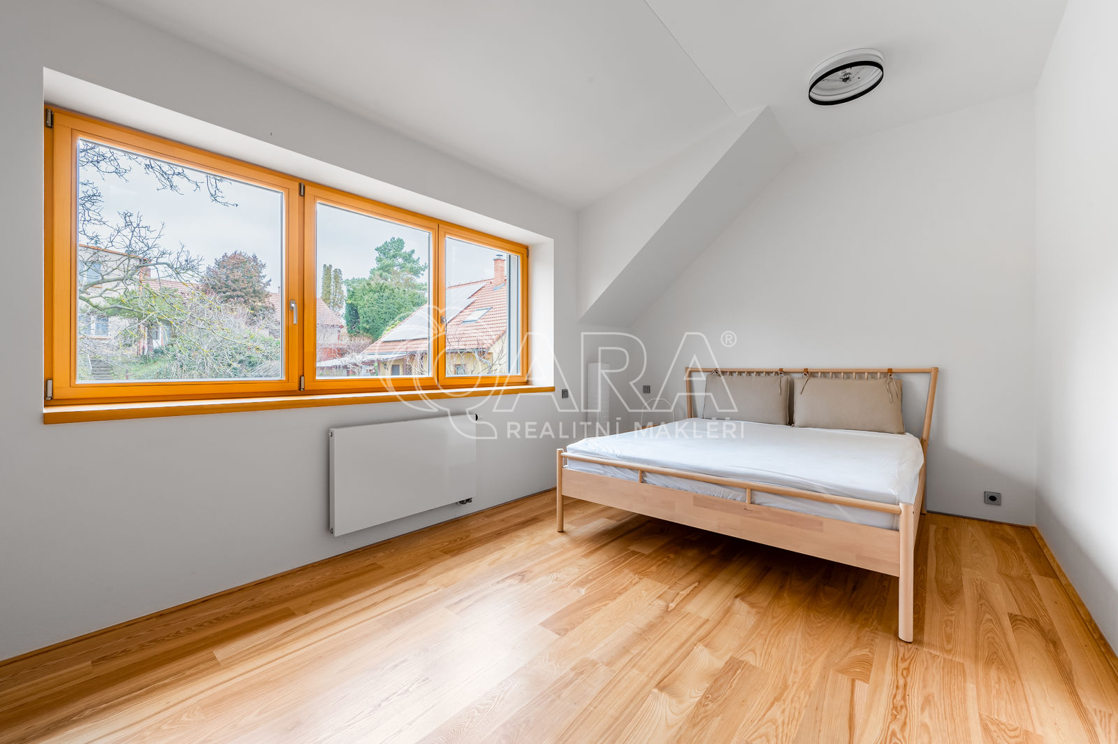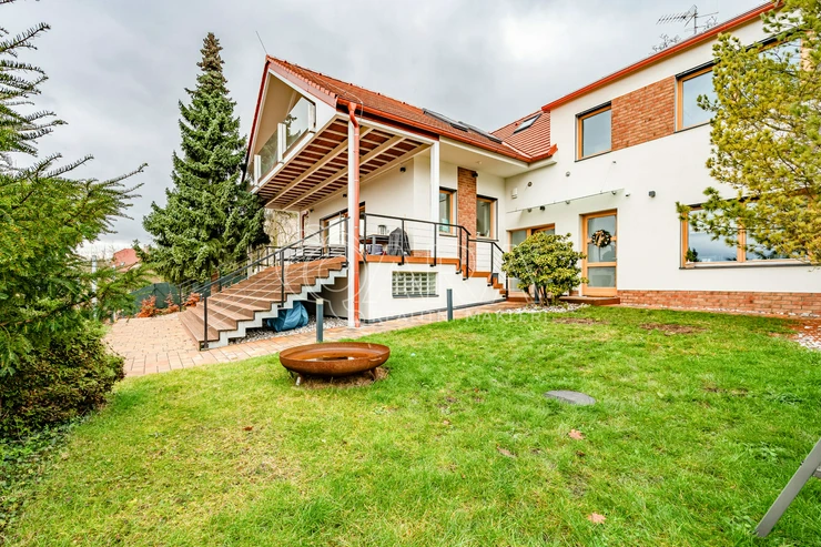 We offer for rent a high-standard, low-energy, representative new-built villa, suitable for use as offices or a company headquarters. The villa is situated on a separate plot and comprises two independent units with a total usable floor area of 393 sqm and a layout of 7 rooms with two kitchenettes (7+2kk). The property features three terraces, parking for up to 5 cars on the plot, and a unique view of the Tiché údolí valley and the northern part of Prague. An additional major advantage is the excellent accessibility to the city centre.