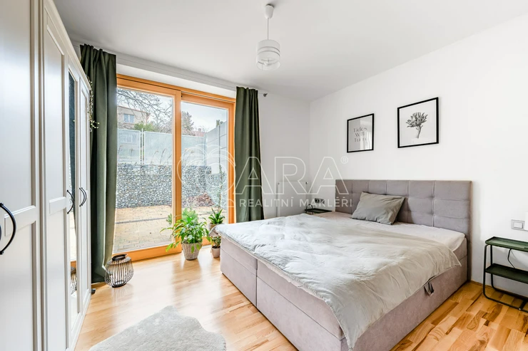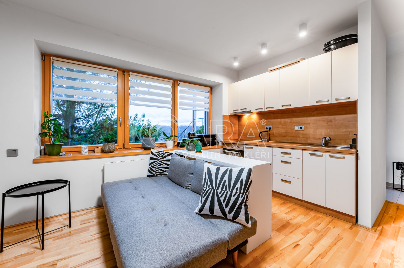 The property also includes a second independent unit with a separate entrance from the garden. The 2-room apartment with kitchenette (2+kk) consists of a living room with a kitchenette, a separate room with direct access to a private terrace, a bathroom, and a separate toilet. This unit is ideal for company management, staff facilities, or a private office.