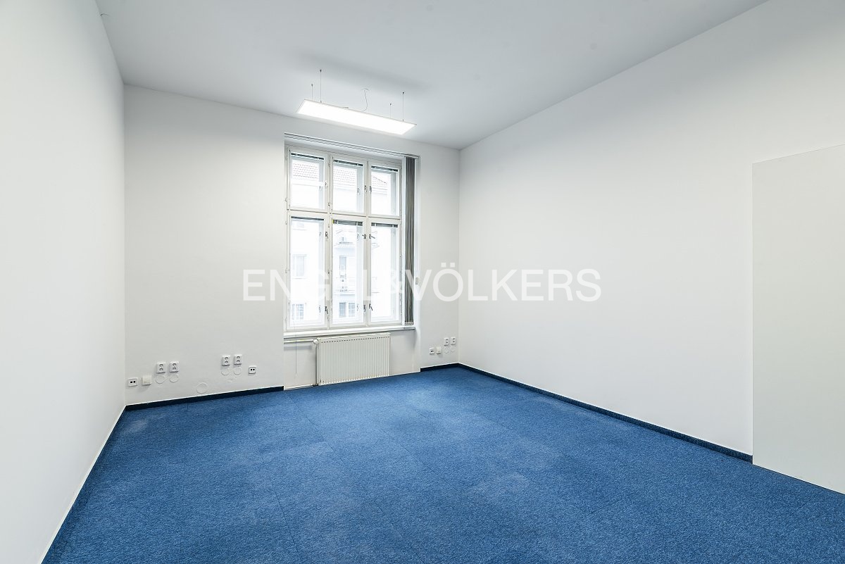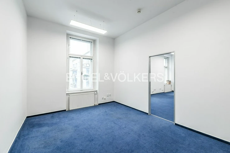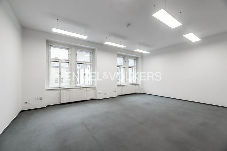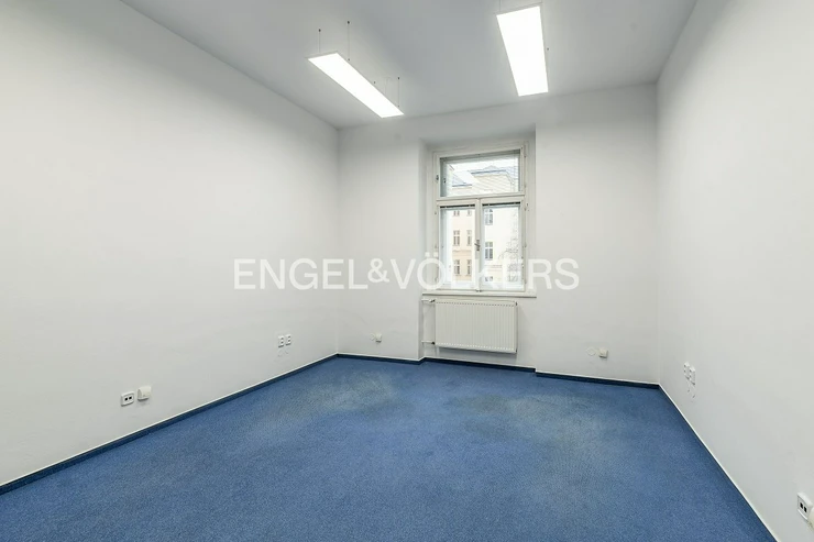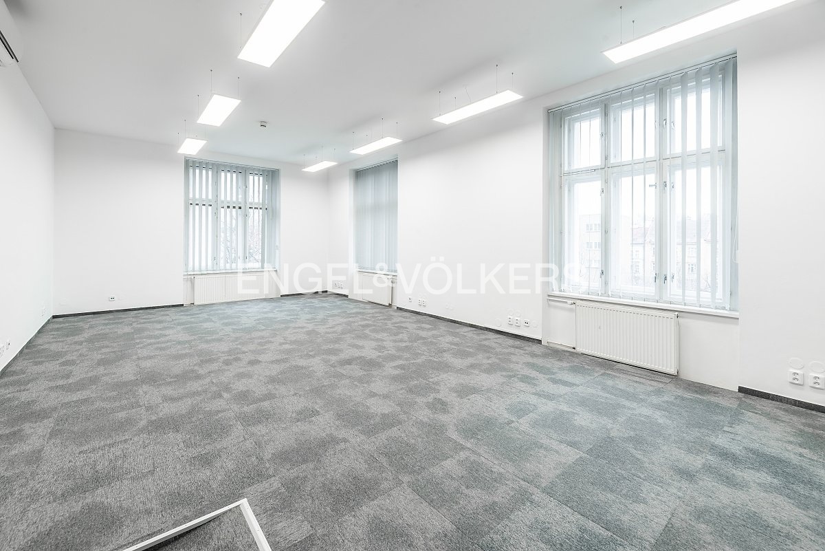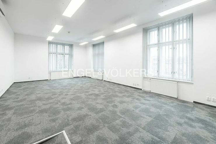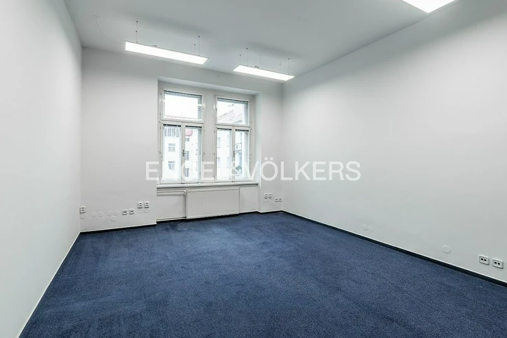 These prestigious office premises with a total area of 450,51 m², including a share of the common areas, are located in a renovated office building in an attractive part of Žižkov. The space is designed as two interconnected rooms, which can be used, for example, as a combination of work offices or an office and a smaller meeting room. Thanks to the casement windows, the interior has a bright and pleasant feel and offers plenty of daylight.