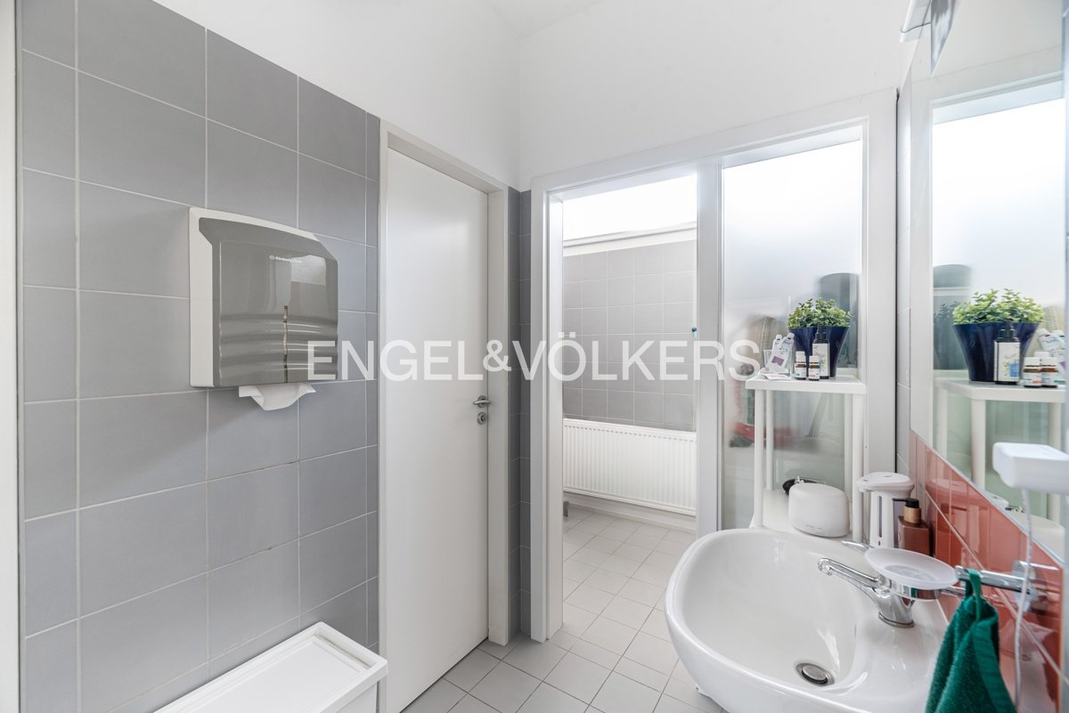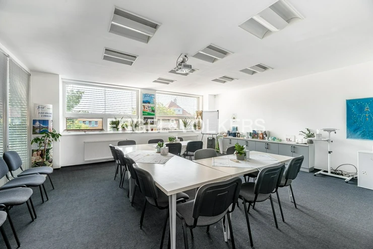 The first floor, with an area of 151.55 m², offers a separate office, a spacious meeting room, a kitchenette, and complete sanitary facilities. The total area of the space is approximately 251.55 m². The building is located in a quiet part of the city with excellent transport accessibility.