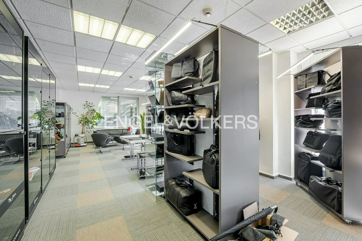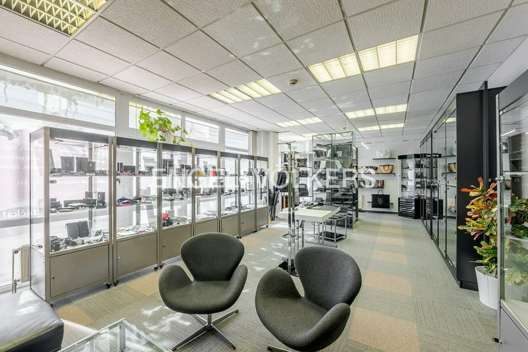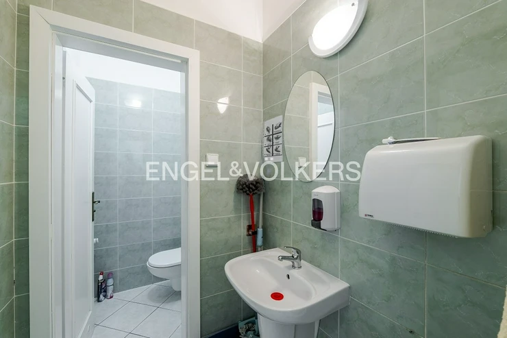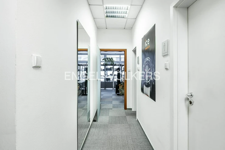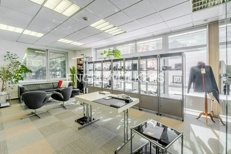 The interior of the space is designed with an emphasis on practicality and comfort. The floor is covered with a high-quality heavy-duty carpet; bright suspended ceilings combined with energy-efficient office lighting create a pleasant and well-lit environment for work and product presentation. The entire space is equipped with modern plastic double-glazed doors and openable windows, ensuring excellent thermal and acoustic insulation. The entrance room with a reception is complemented by three separate offices. The lease also includes facilities: a warehouse, two toilets, and a kitchenette.