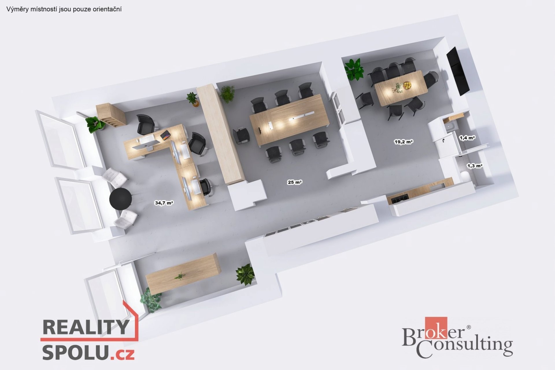 Prostory se nacházejí v přízemí s přímým vstupem z ulice a disponují velkými výlohami, které zajišťují výbornou viditelnost a dostatek přirozeného světla. Díky této kombinaci jsou ideální nejen pro kancelářské využití, ale také jako kontaktní místo pro klienty, showroom, poradenské služby či menší obchod.
