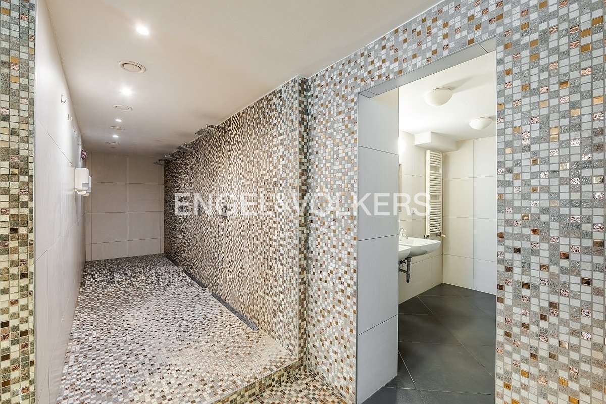 The total space consists of two spacious halls with a ceiling height of 2.9 m, separate changing rooms and showers, private sanitary facilities, and a kitchenette. Ventilation (HVAC), central heating, and chip access are standard features.