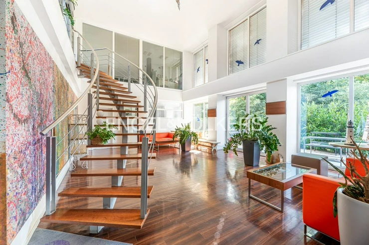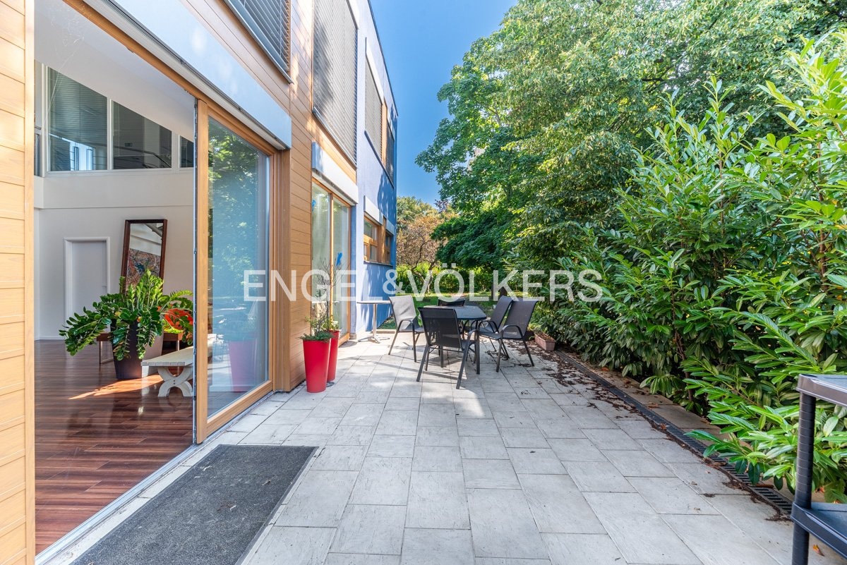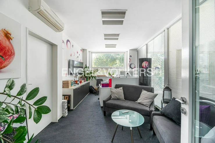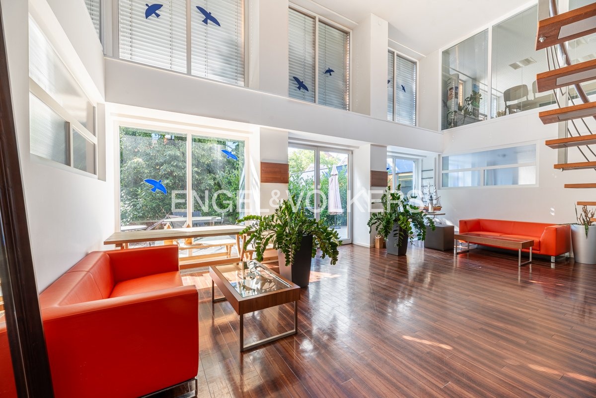The ground floor, with an area of approximately 100 m², features a meeting room suitable for business meetings, presentations, or meetings with clients. This part of the building has direct access to the terrace, which provides a pleasant space for informal meetings.