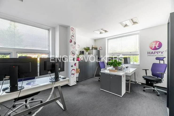 The first floor, with an area of 151.55 m², offers a separate office, a spacious meeting room, a kitchenette, and complete sanitary facilities. The total area of the space is approximately 251.55 m². The building is located in a quiet part of the city with excellent transport accessibility.