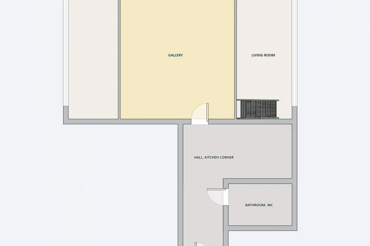 Hall 44.8m2, gallery 18.3m2, facilities 3.2m2, reception 12.30m2.