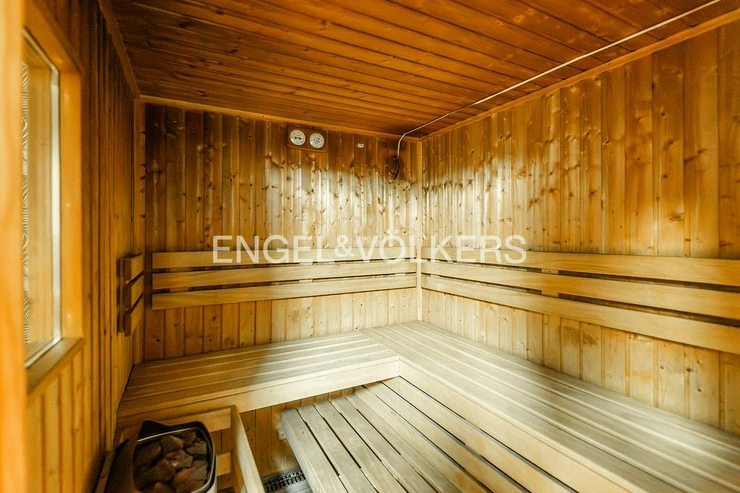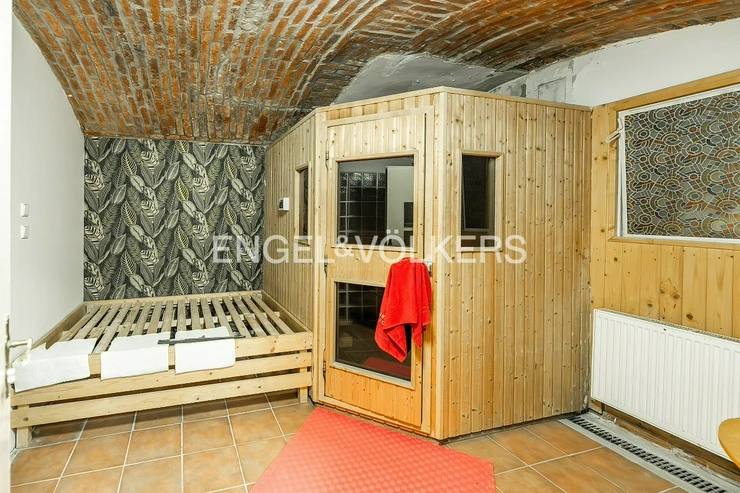 The interior is functionally divided into six separate rooms, complemented by two storage rooms and complete sanitary facilities, including a toilet with a sink, shower, and equipped kitchenette. The floor coverings are a combination of tiles, linoleum, and heavy-duty carpets, which guarantee durability and easy maintenance in various parts of the premises. The premises have their own sauna.