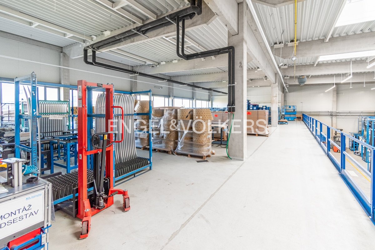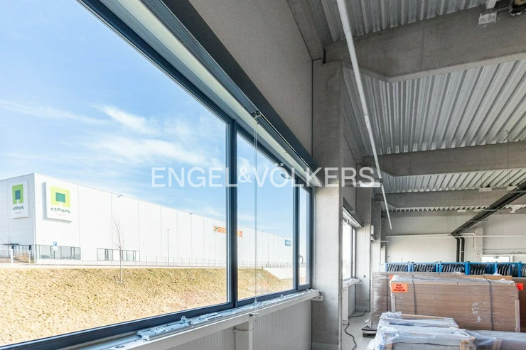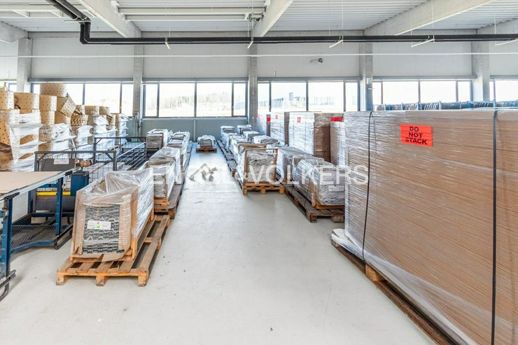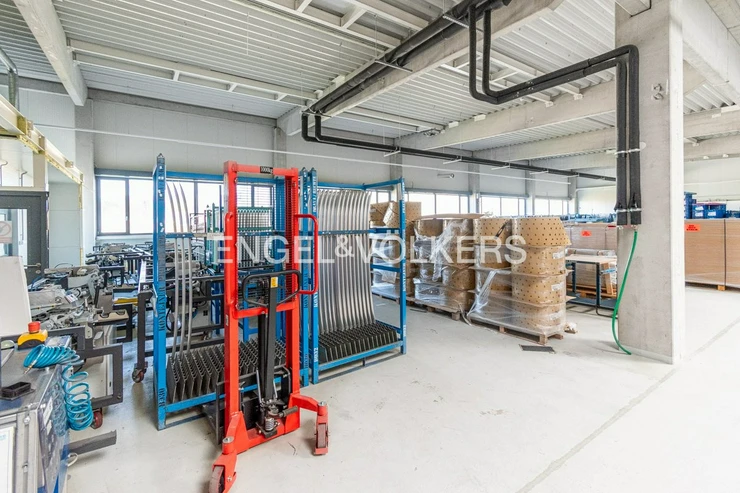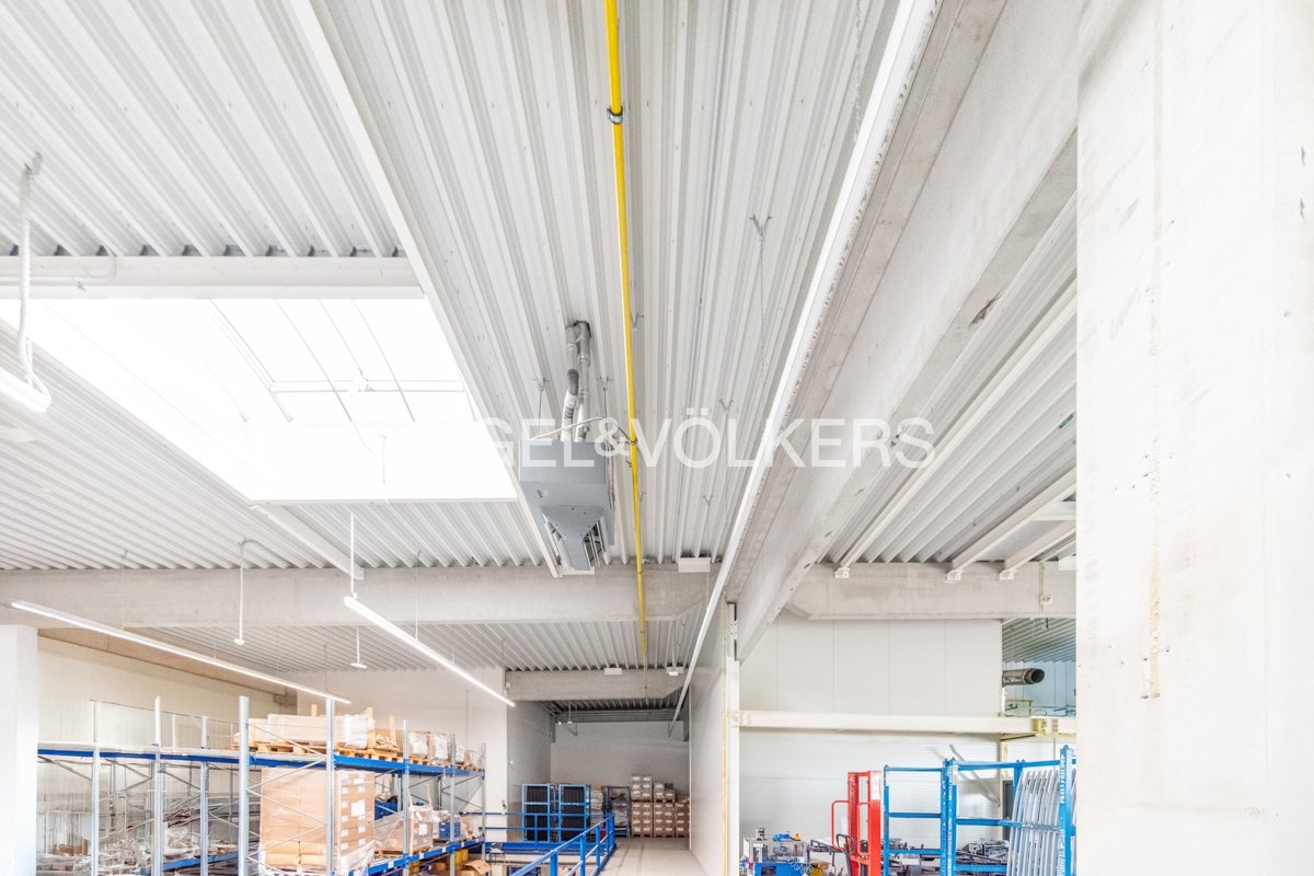 The warehouse section has a clear ceiling height of 4 m and column spacing of 6 m. The floors have a load-bearing capacity of up to 500 kg/m². The space is heated by Sahara units. A freight elevator is available for easy handling of goods.