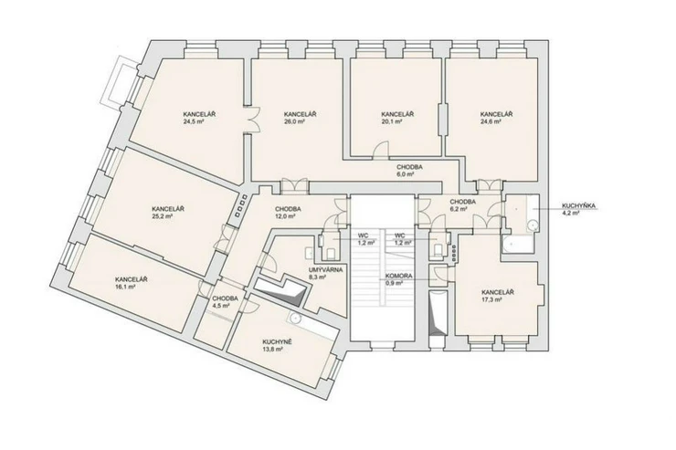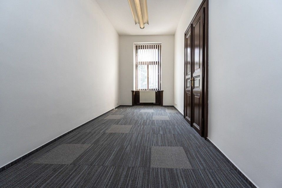 The complex consists of 7 separate offices, a server room, 2 kitchenettes and 2 toilets (see plan on photo). Air conditioning units are installed in 2/3 of the space. The offices are equipped with data and telephone wiring. Optical internet, alarm and smoke detectors are available. The windows are wooden, with blinds, there are carpets on the floors. The house is camera-secured.