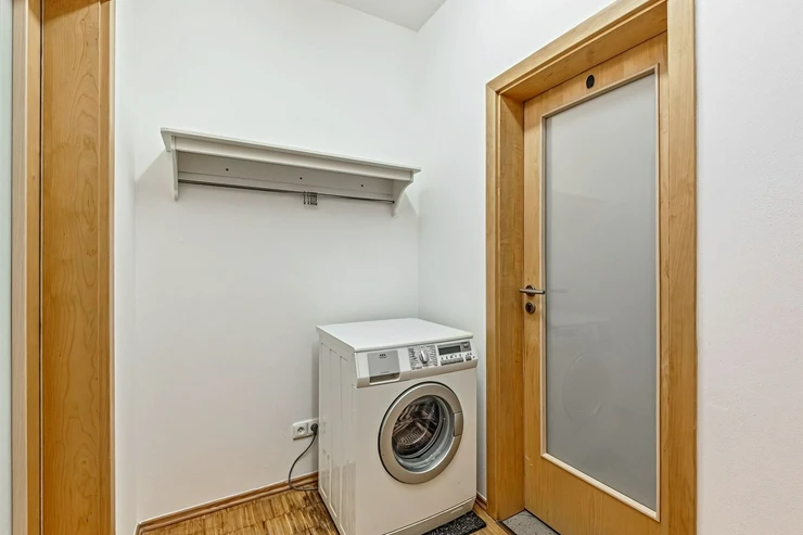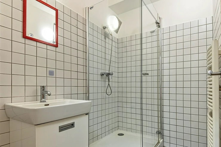 The space is very bright, with plenty of natural light thanks to French windows in both the room and the kitchenette. It features an entrance hall, a spacious office, a separate kitchenette, a bathroom, and a separate toilet. The kitchenette includes a modern kitchen unit equipped with a fridge-freezer, a ceramic hob, an electric and microwave oven, a dishwasher, and an extractor hood. The bathroom has a shower enclosure. A washing machine is installed in the hallway. The floors are wooden, combined with tiles.