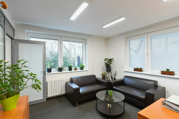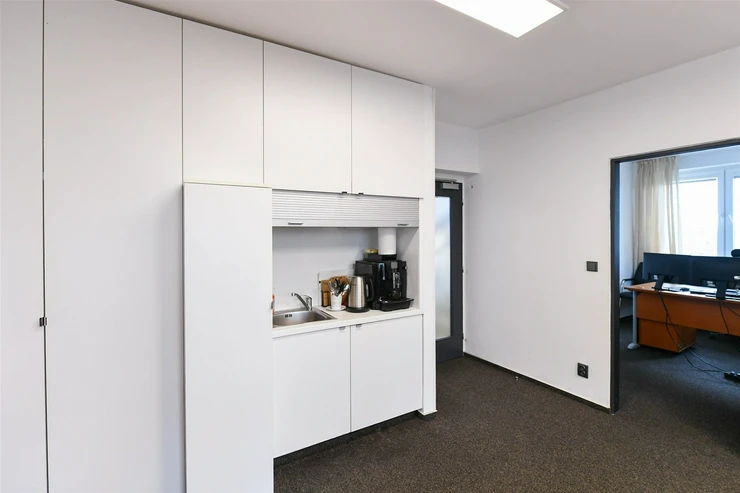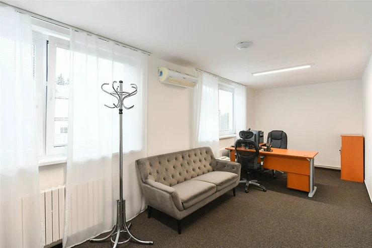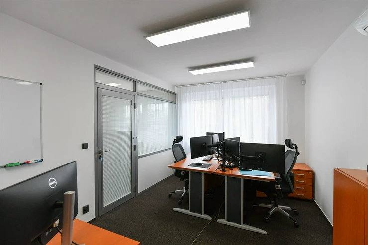 A four-story building, 24 offices allow flexible division of the building (up to 10 separate circuits), in perfect condition, with both southern and northern entrances, security cameras, chips, coding throughout the house, Jablotron, air conditioning throughout, O2 internet connection, reception, available for rent with or without furniture, ample bathrooms and kitchens, dining area, server room, storage etc.