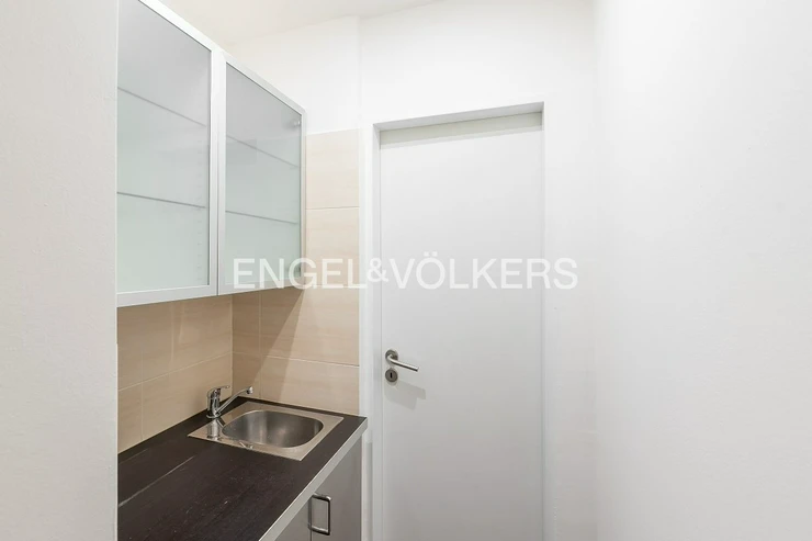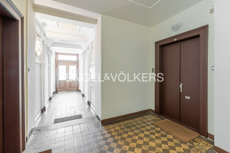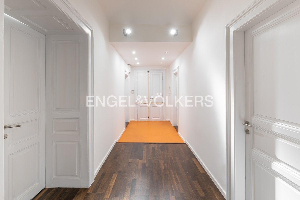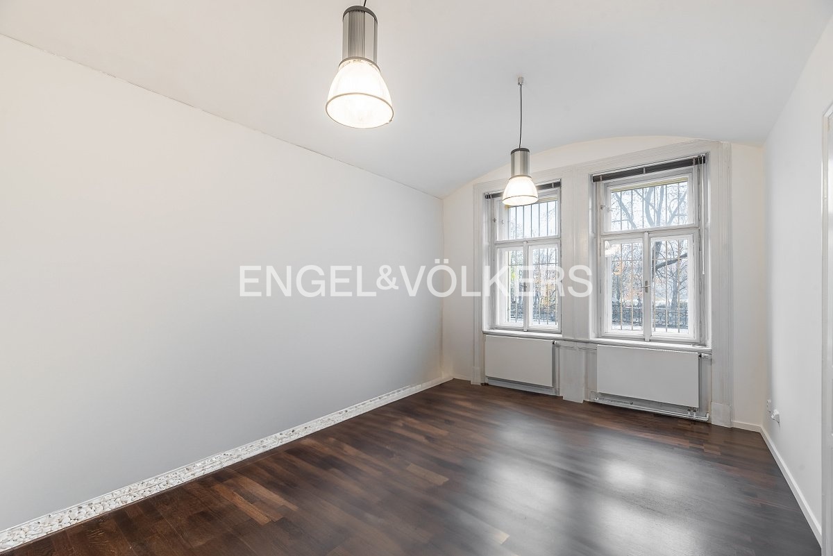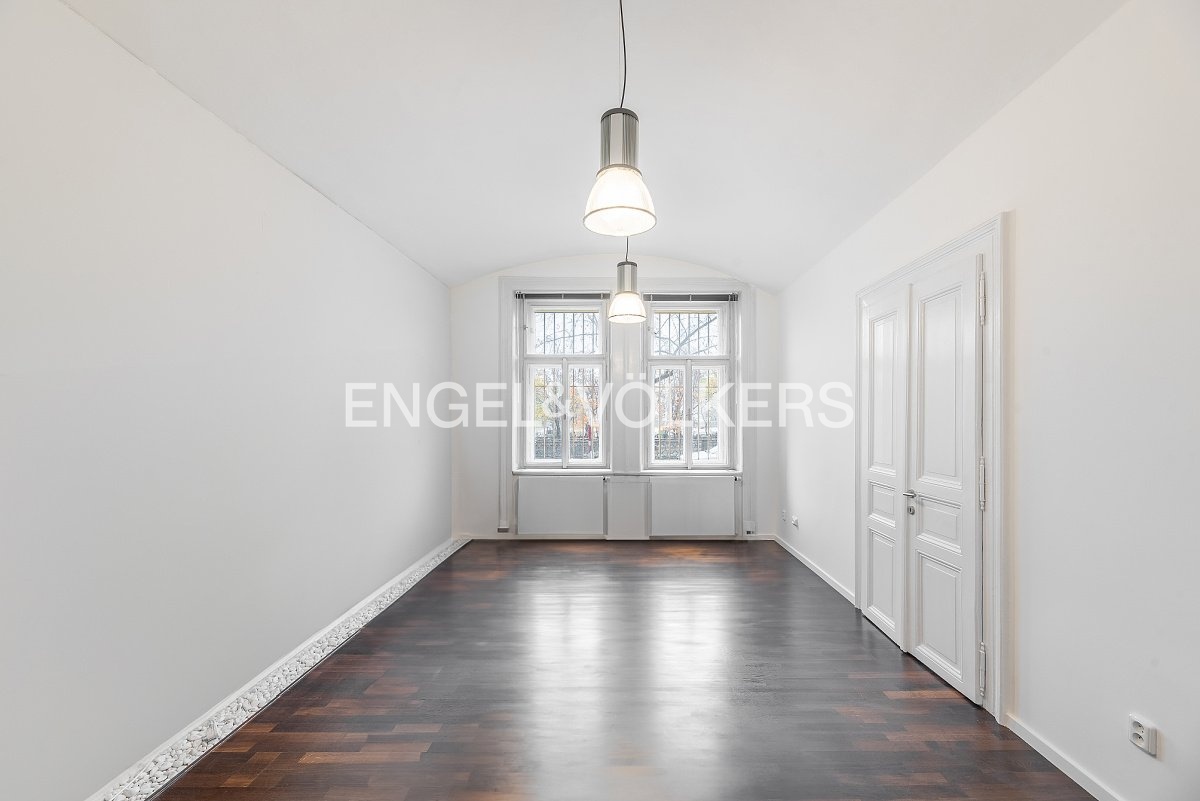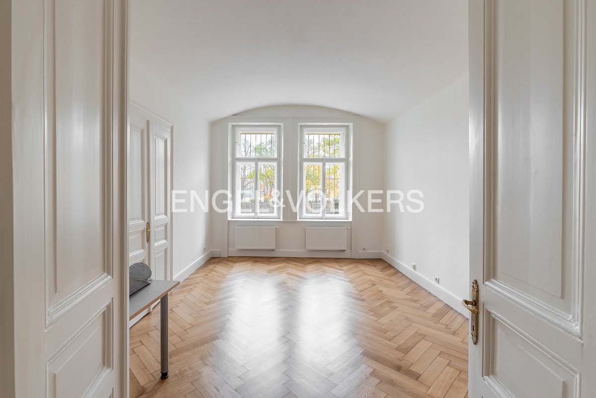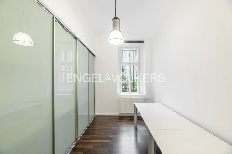 The premises are located on the ground floor of a historic apartment building with access from the corridor. Two pass-through rooms are facing the street and two separate offices face a quiet courtyard. There is a small tea kitchen with a fridge, storage space in the form of built-in cupboards and a separate toilet.