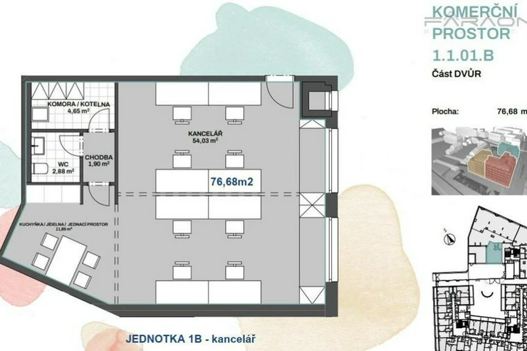 We offer for rent new office space (77 m2) + garage parking in the upcoming project of a new residential building Anilinka (250 apartments), project completion date 4Q 2027, Strašnice, Prague 10.