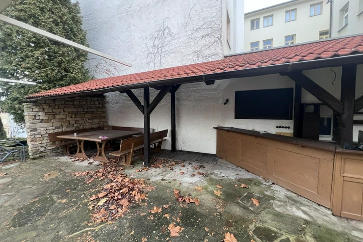 Prostor zabírá celé přízemí domu. Nabízí se přímý vstup z Velkého náměstí a ze společné chodby domu. Vlastník taky nabízí zvlášť velkou zahrádku s barem ve vnitrobloku, která se také muže stát předmětem pronájmu. Za zahrádkou se nachází ještě tři rozlehlé terasy a lze na nich pořádat různé společenské akce. Zahrádku lze zastřešit a využívat celoročně.
