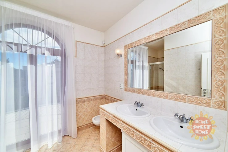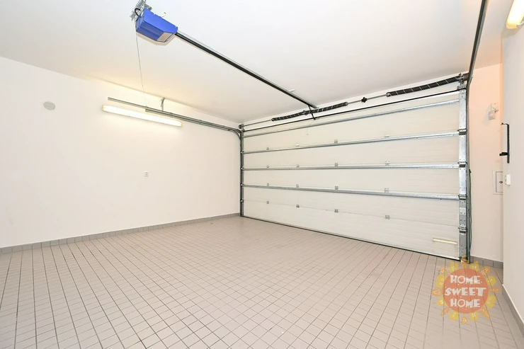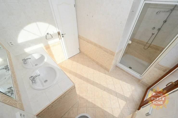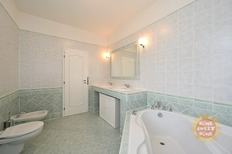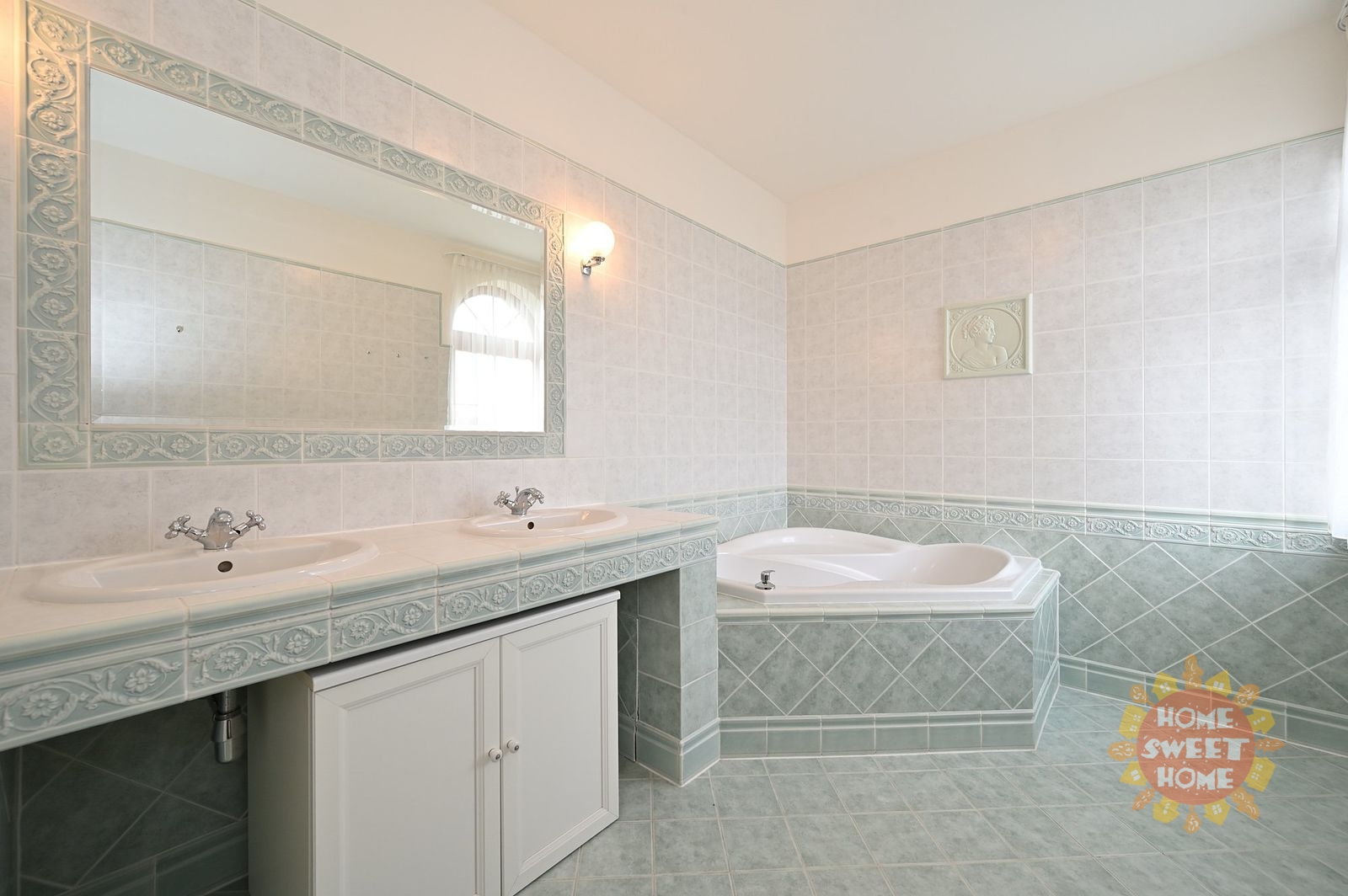 On the ground floor there is an entrance hall, spacious living room with fireplace and fully equipped kitchenette, toilet, dressing room and spacious garage. On the first floor there are four bedrooms and three bathrooms. The main bathroom has access to the terrace. The swimming pool has dimensions of 5x3x1,5 m with underwater lighting, countercurrent and comfortable stairs. It is covered with a solar sheet and has sand filtration. The spacious terrace accessible from the living room is equipped with an electrically operated awning. The house is rented unfurnished. The price includes professional care for the swimming pool and garden.