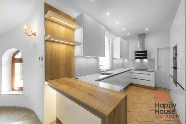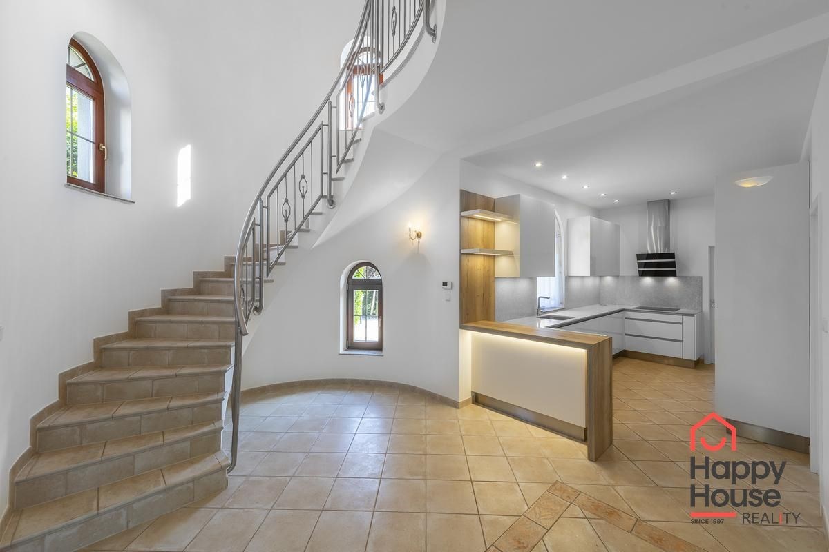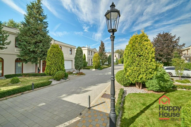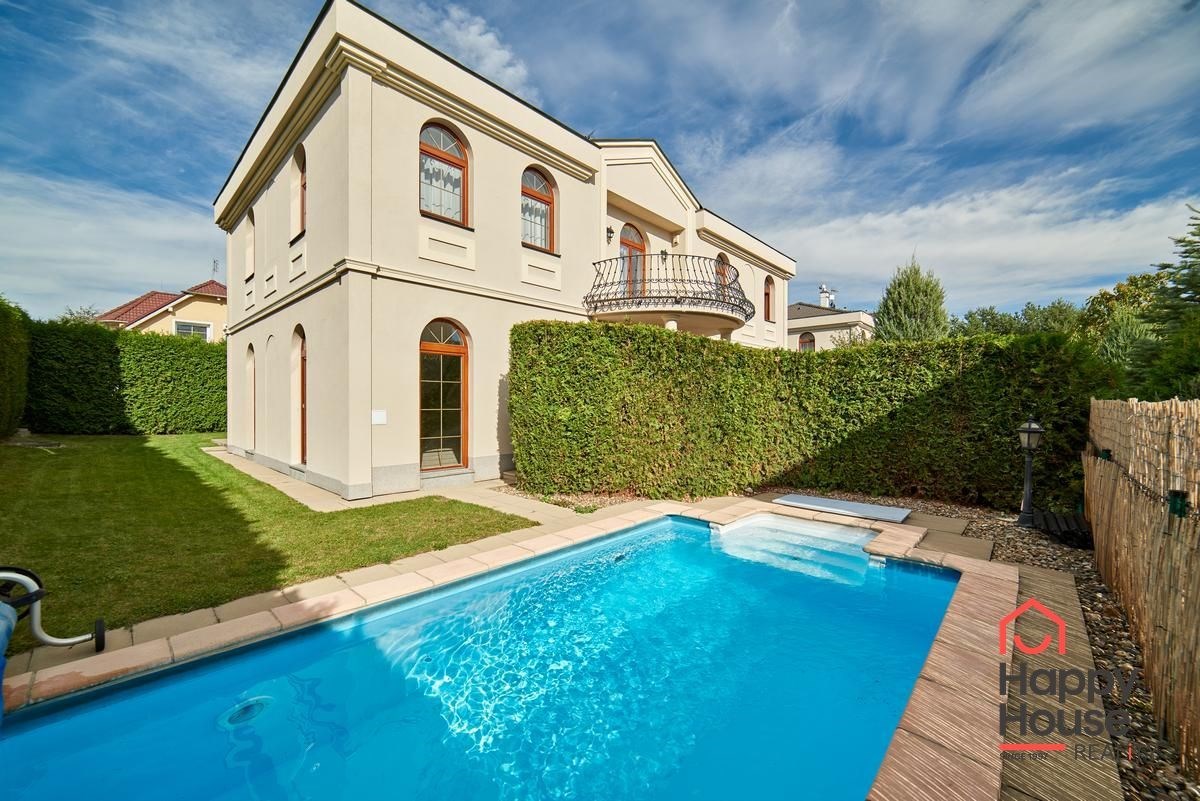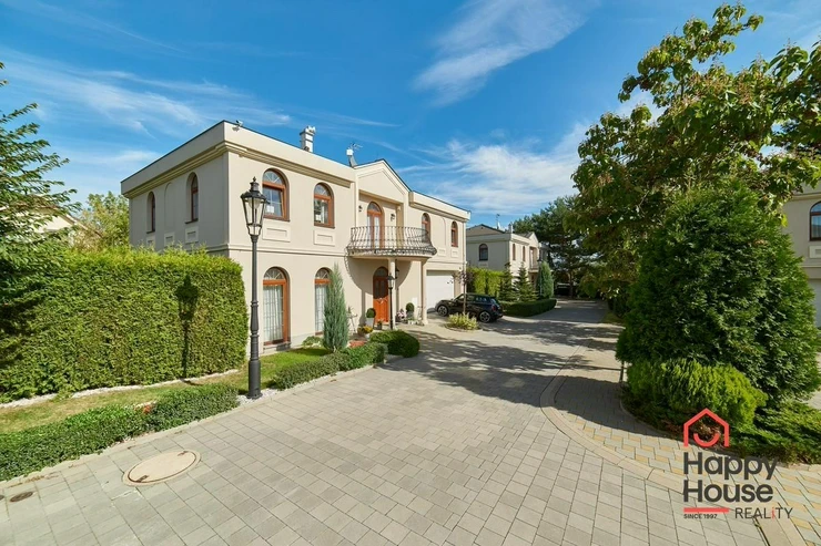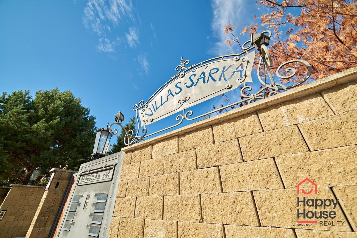 We offer you this luxurious two-storey brick family villa with a garden and swimming pool in the secured area of Villas Šárka in Nebušice. In the luxurious gated area of Villas Šárka, which spans an area of 5,500 sqm, there are seven family villas.