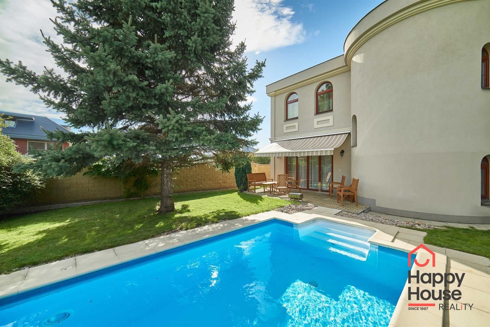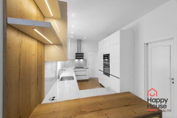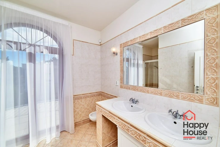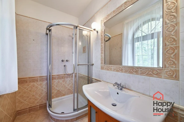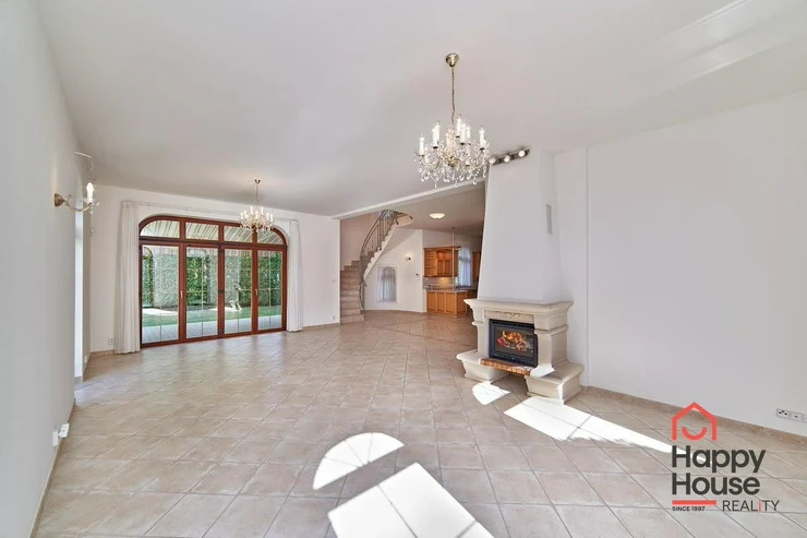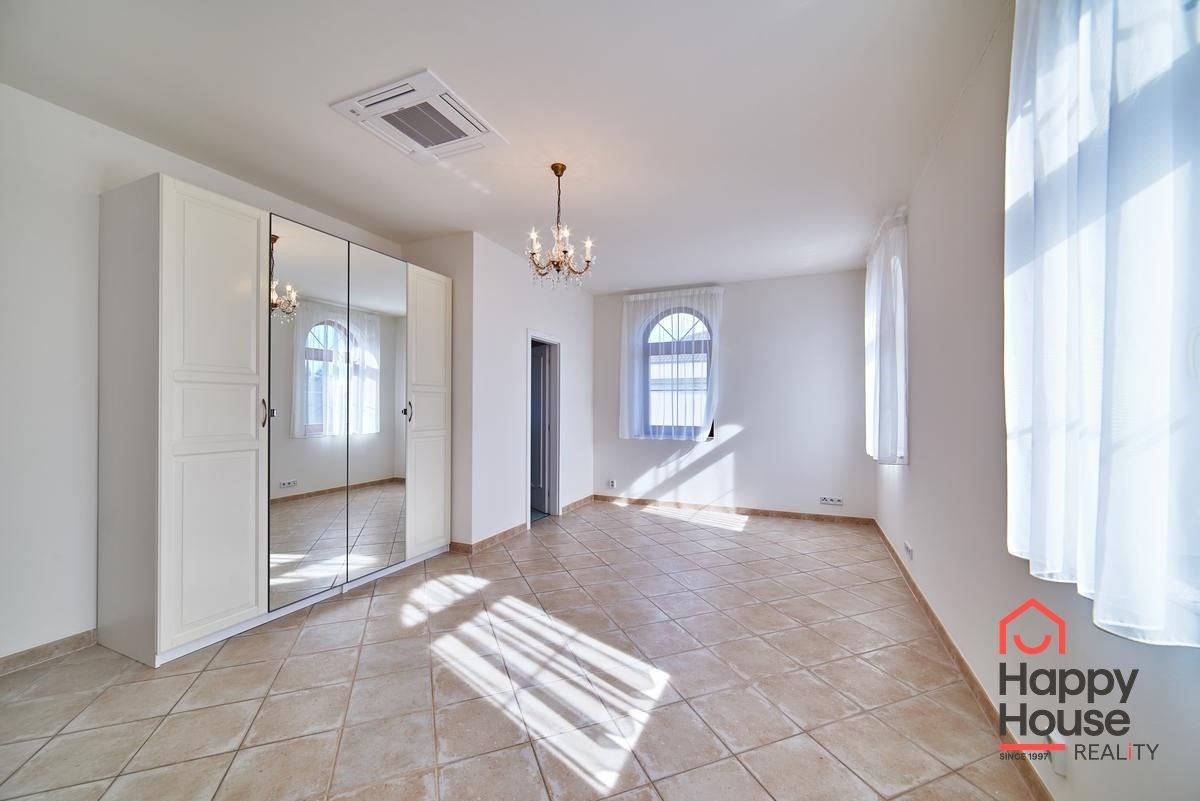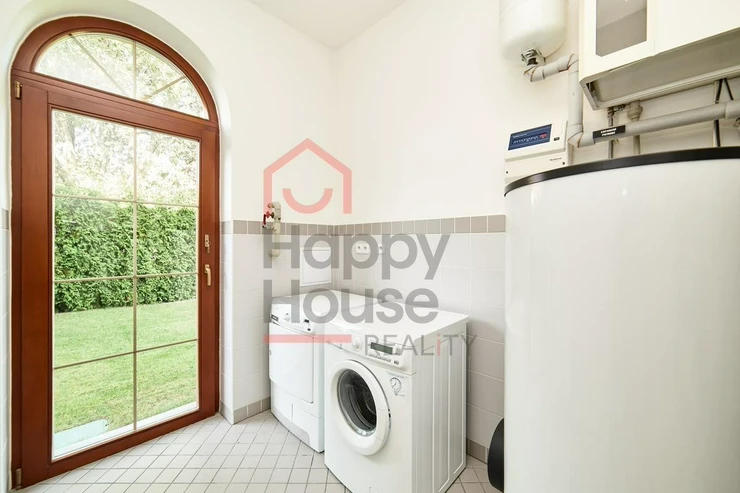 A video intercom connected with the entrance to the area. Tiled flooring with underfloor heating and air conditioning throughout the house, wooden windows with insulating double glazing. Maintenance of the garden (automatic irrigation) and pool is taken care of by the owner and included in the price. Comfortable living in close vicinity to The International School of Prague.