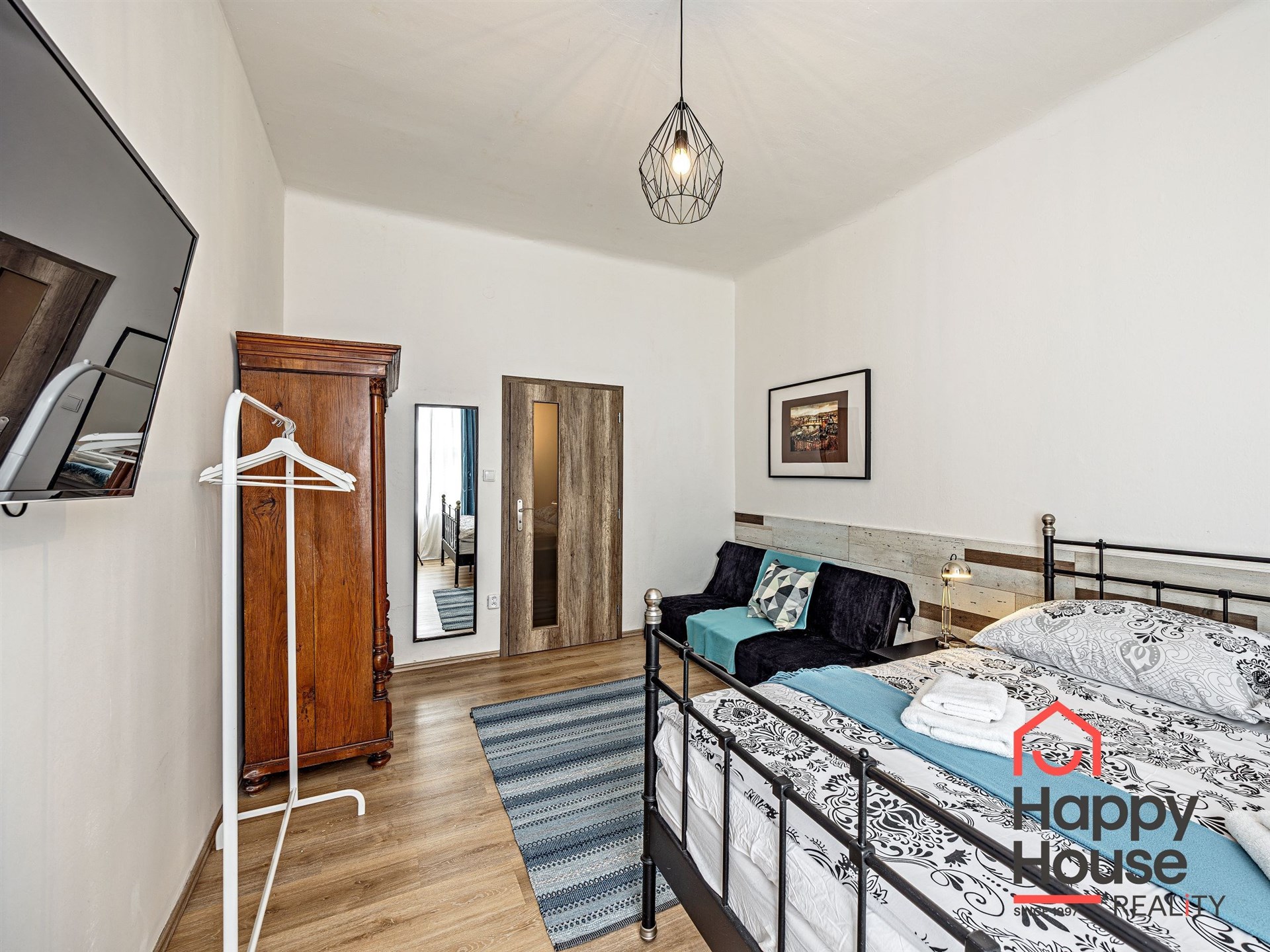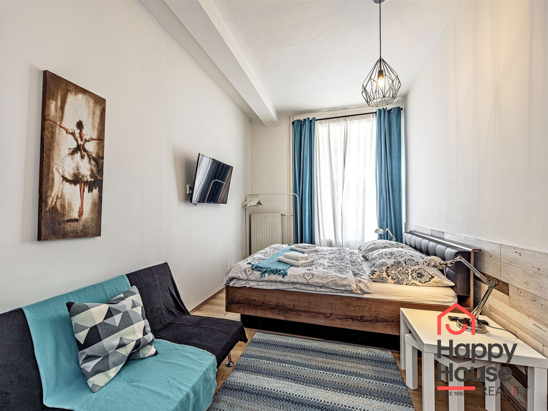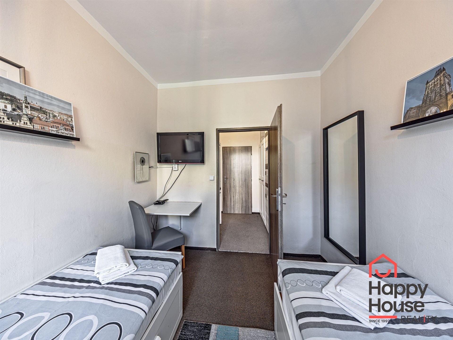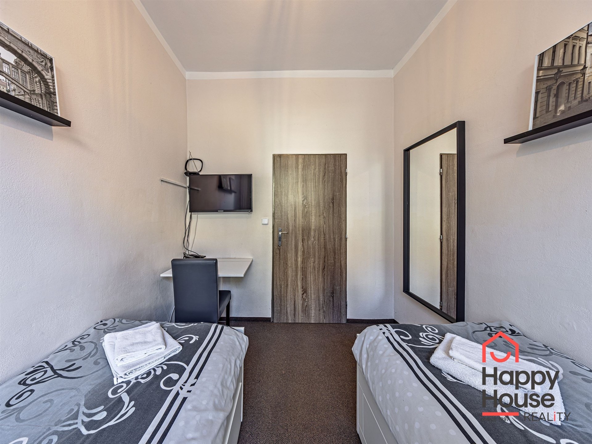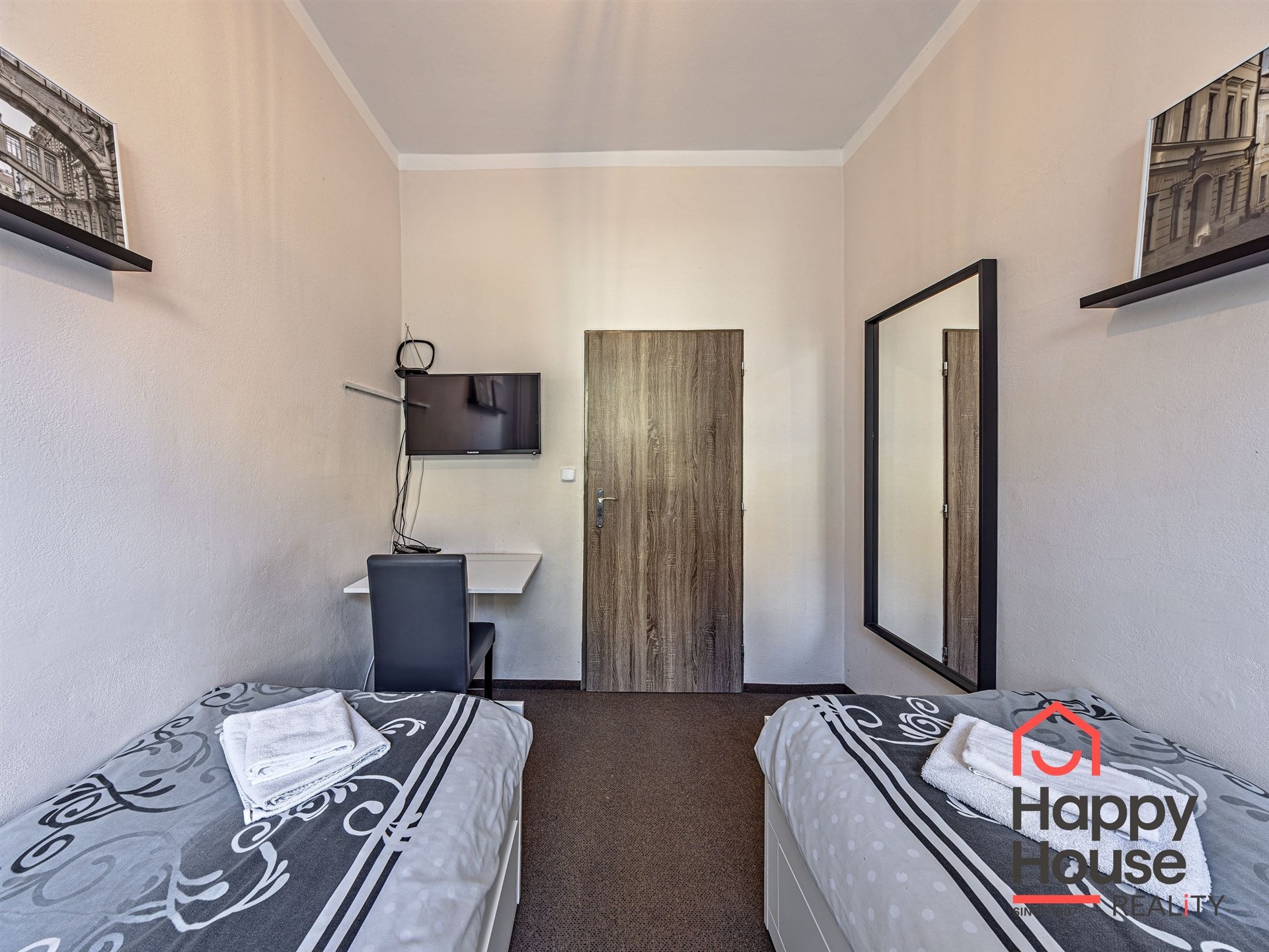 Some apartments have a double bed, some a single bed, or a sofa bed (depending on the studio size). Furniture depends on room size - wardrobes, chests, writing and dressing tables.