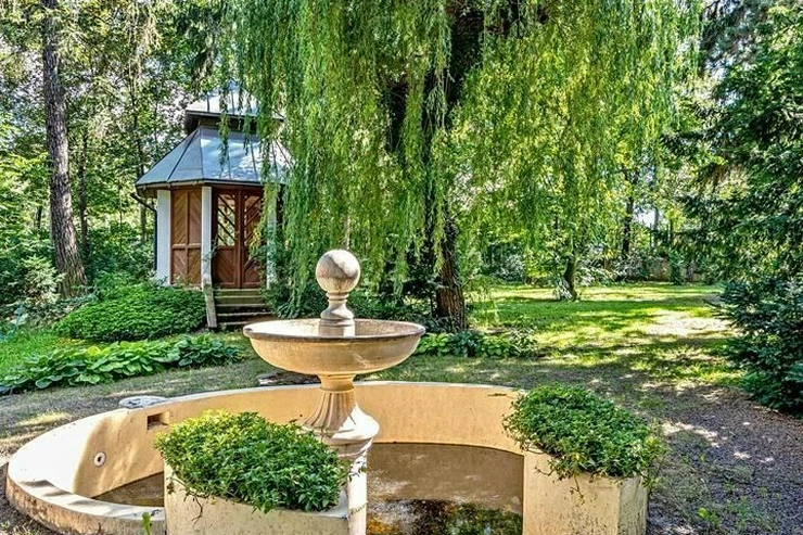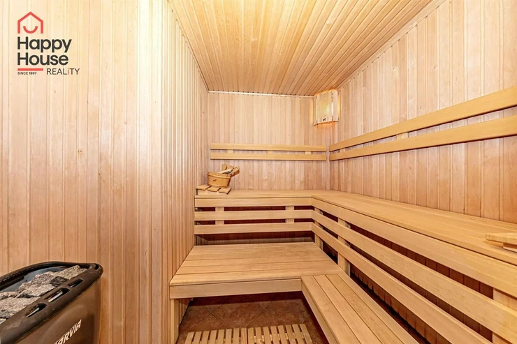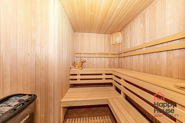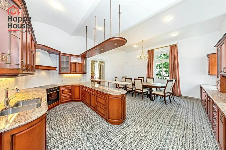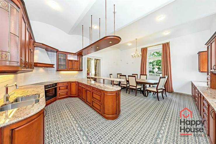 The villa is partially furnished and offers 7 bedrooms, 5 bathrooms, a living room, 3 kitchens, 2 dressing rooms, and technical rooms. On the ground floor, there is an entrance foyer, hall, living room, winter garden, bedroom, fully equipped kitchen with dining area and terrace, utility room, dressing room, bathroom (shower) and a separate toilet. The first floor offers three bedrooms, two bathrooms (bathtub, toilet, and bidet), a kitchen, dressing room, balcony, and a small winter garden. On the second attic floor, there are three bedrooms, a kitchenette, hall, and two bathrooms (one with a bathtub, toilet, and bidet, the second with a shower and toilet). In the basement, there's a pool, sauna, bathroom (shower and toilet), laundry room, technical facilities, gym/playroom, wine cellar, utility room, and access to the garden. Preserved original features and original wooden staircase, high ceilings, wood floors, inlaid parquet, tiles, stone, as well as wooden paneling and shutters, stucco, three tiled stoves, storage spaces, gas boilers, video intercom, alarm, satellite reception. The house is partially furnished and additional furniture can be rented. Parking for two cars in the garage and four in front of the house. The property is protected by a security service.