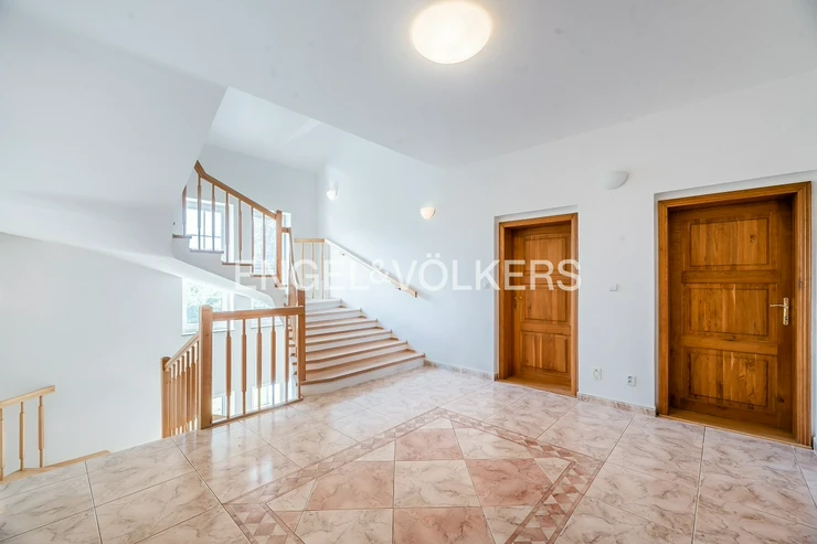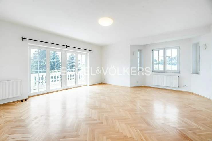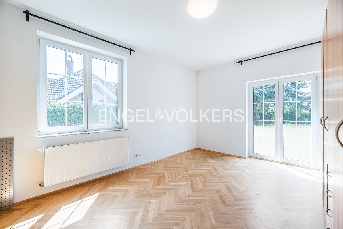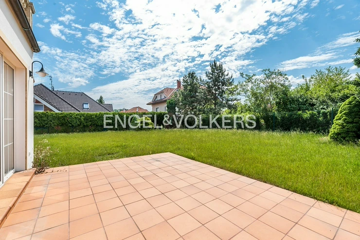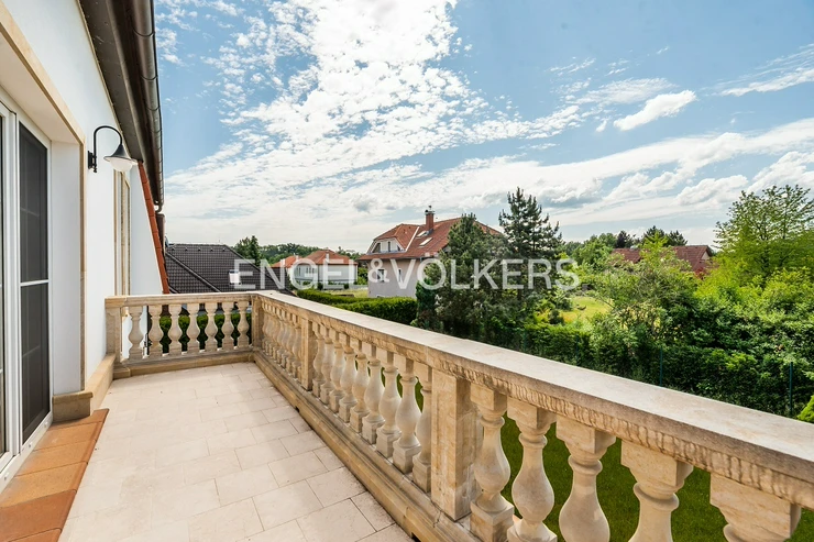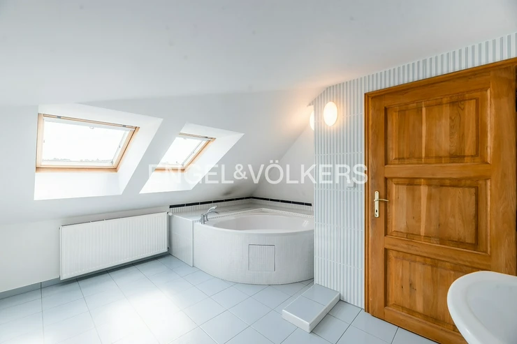 A luxurious villa in Průhonice with a layout of 7+kt. The villa with a built-up area of 210 sqm offers six bedrooms, four bathrooms with toilet, balcony, terrace, and double garage. The villa is surrounded by a beautiful garden. On the plot of 747 sqm, there is also the possibility of parking two vehicles.