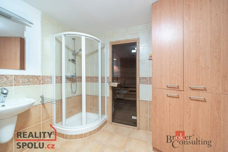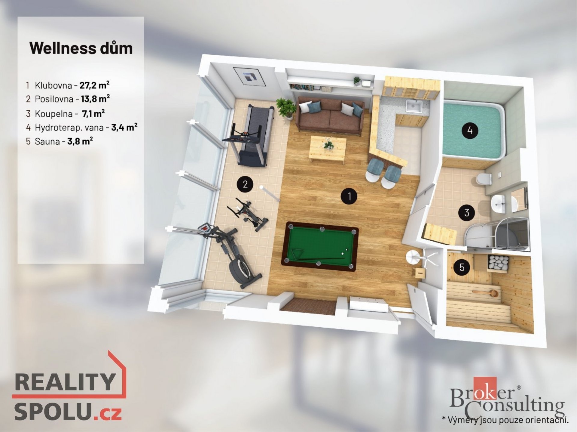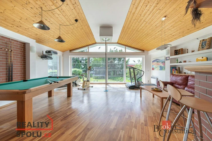 Součástí je také Welness dům, ve kterém je vířivka, sauna, billiard, tělocvična, elektrické rolety a dokonce i výčepní set. Dále také kurt s umělým povrchem (možnost využít i jako víceúčelové hřiště). Vedle tenisového kurtu se nachází 2 velké garáže, do kterých se vejde až 8 aut. Obě garáže disponují vodovodní přípojkou a třífázovou elektřinou (400 V), což přináší nadstandardní komfort zejména pro uživatele elektromobilů. Součástí pronájmu je pouze jedna garáž. Vedle garáží je další zahrada s ohništěm a vlastní vodárnou, která poskytuje vlastní zdroj užitkové vody pro automatické zavlažování zahrady a zároveň může sloužit jako vinný sklípek.