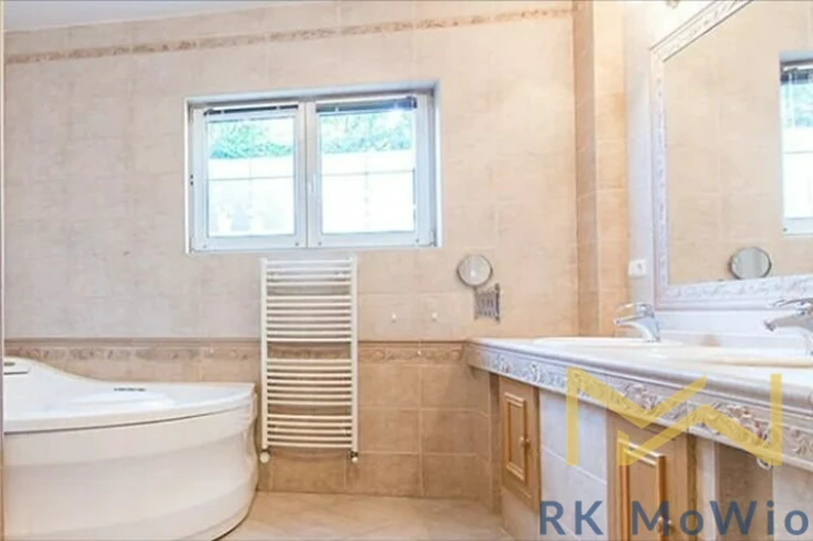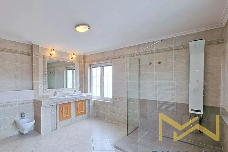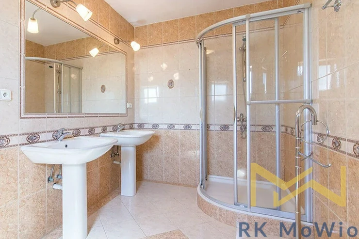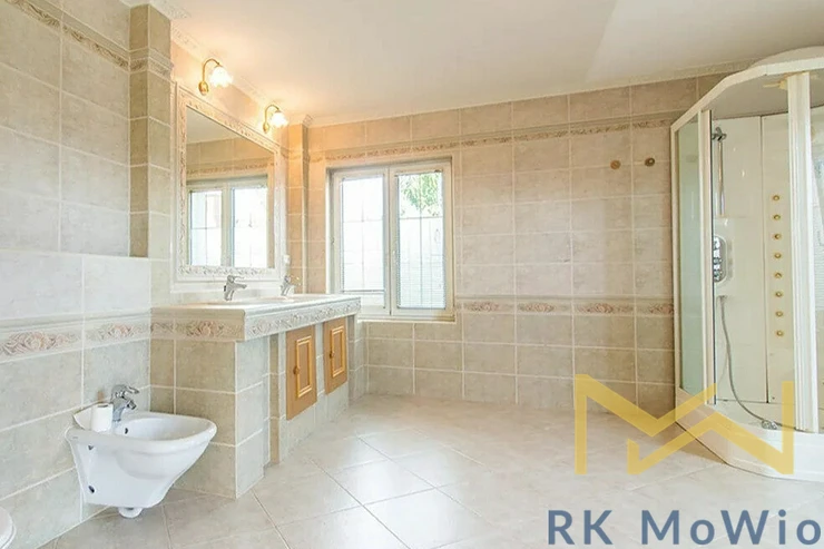 The ground floor includes an entrance hall, a spacious living room with a bay window and fireplace, a separate kitchen and dining room, a master bedroom, one bathroom (with corner bathtub, double washbasin, bidet, and toilet), and a guest toilet. The first floor features a gallery, four bedrooms, two bathrooms (one with shower and washbasin, the other with shower, double washbasin, bidet, and toilet), a walk-in closet, an extra separate toilet, and a balcony. The basement includes a multifunctional room, laundry room, and utility room. Amenities: fully equipped kitchen (fridge with freezer, gas hob, extractor hood, dishwasher, built-in electric and microwave ovens), built-in wardrobes, gas boiler, washing machine and dryer connection, alarm system, wooden floors, and tiles. The property includes two garage parking spaces and additional parking on the plot.