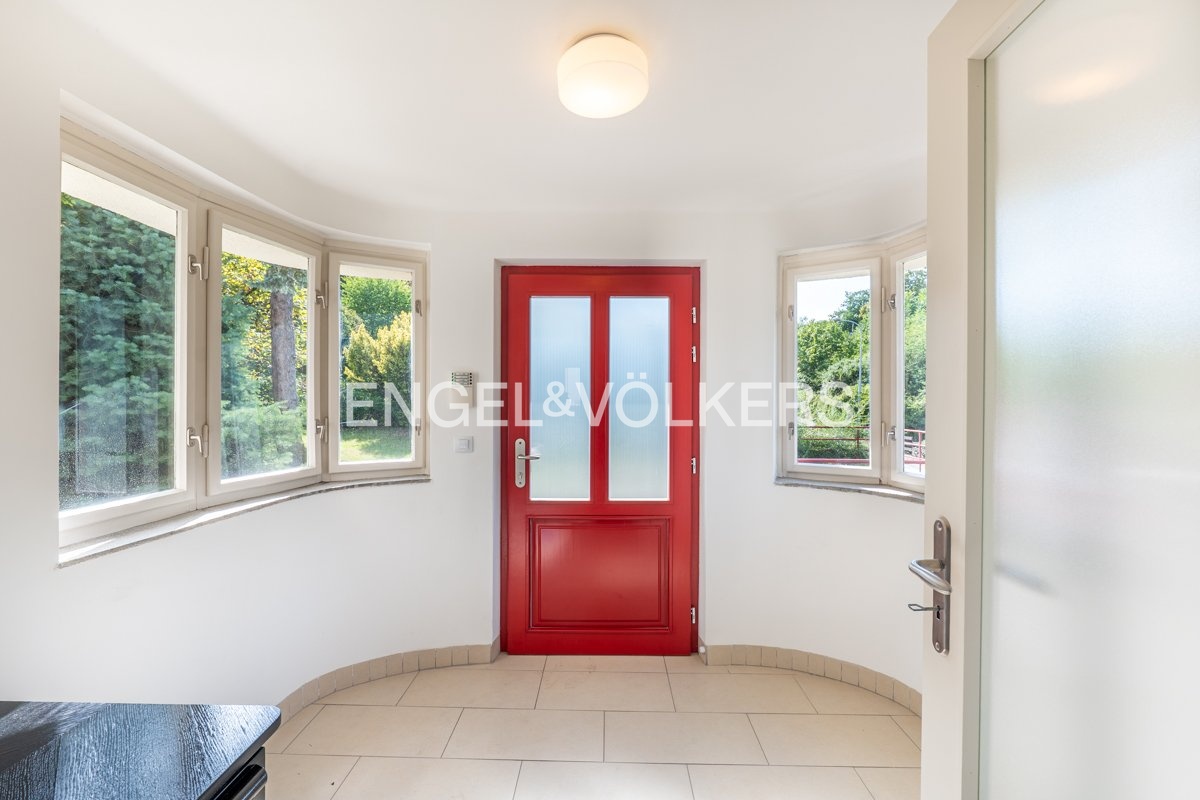 The villa features air conditioning, parquet floors, tiles, original wooden staircases, an alarm system, a videophone, satellite reception, and LAN connections throughout the house. Comfortable living is ensured by a heated driveway and access road, a two-car garage with ample storage space and direct access to the house.