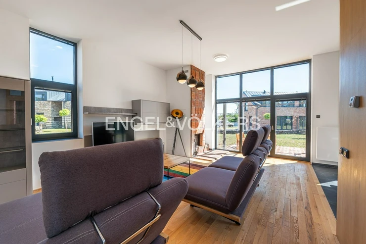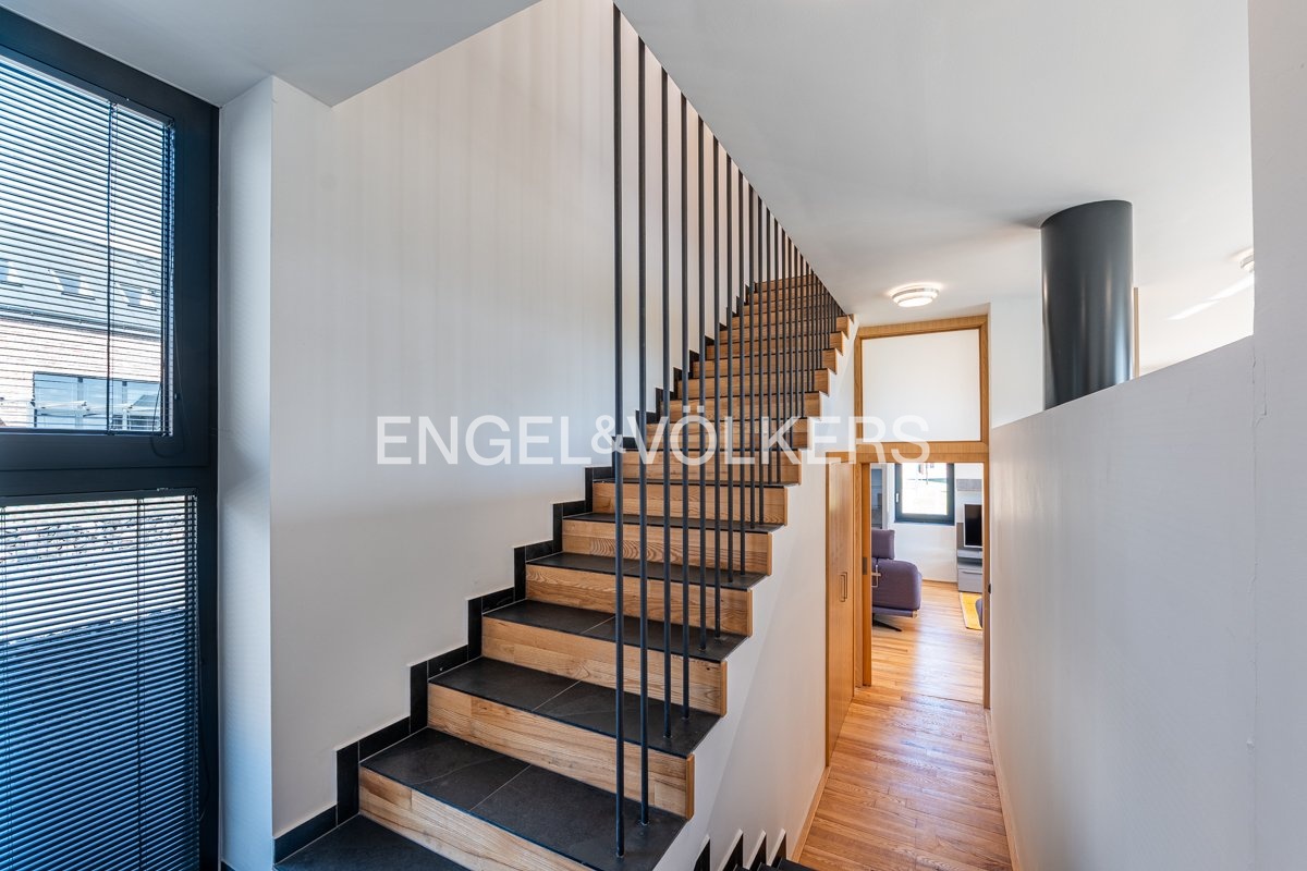 The house is fully furnished with high-quality furniture and finished to a very high standard: ash and natural slate floors, aluminum windows with triple glazing, external blinds, air conditioning, heat pump, warm-air fireplace, Villeroy & Boch sanitary ware, and Miele kitchen appliances. Two garage parking spaces are available for tenants.