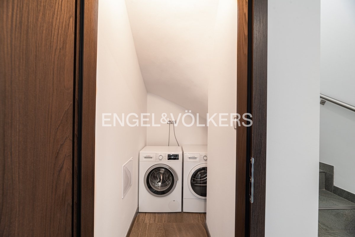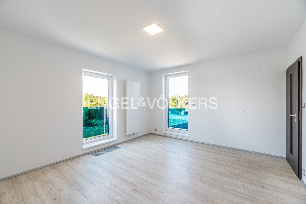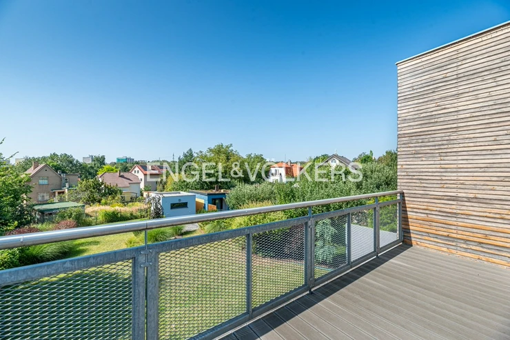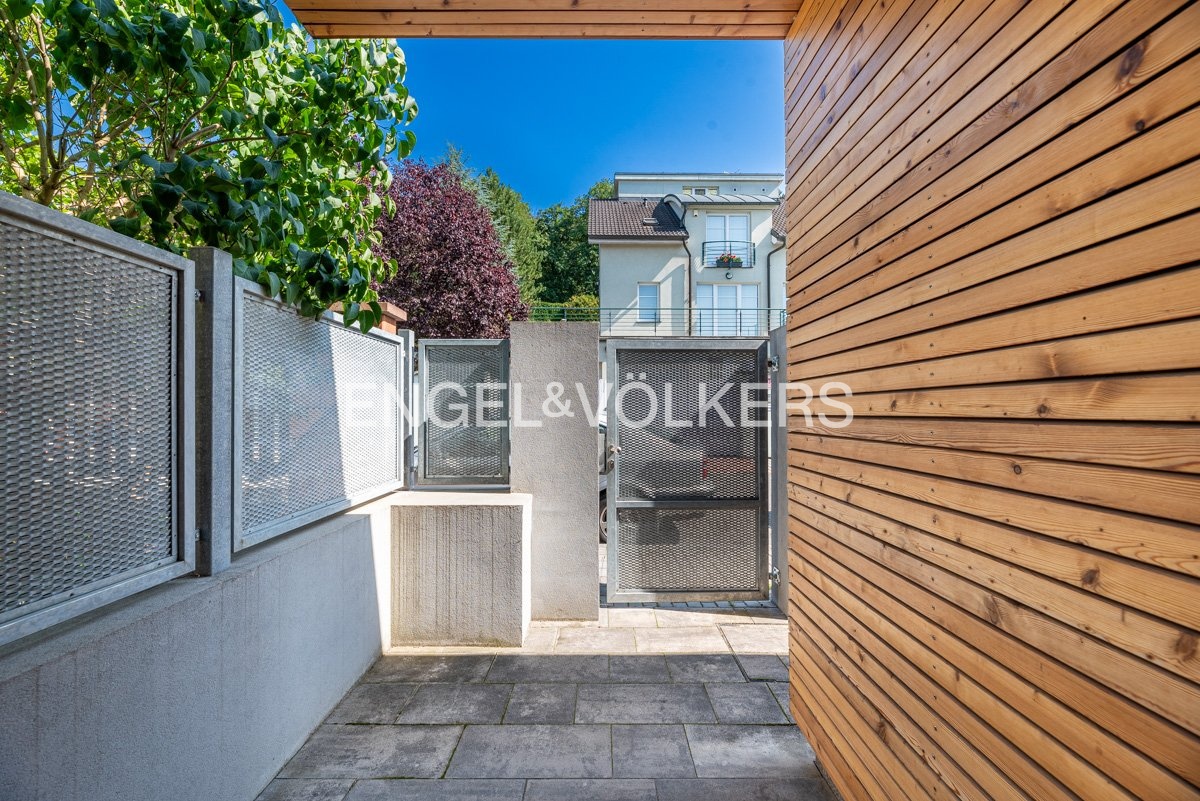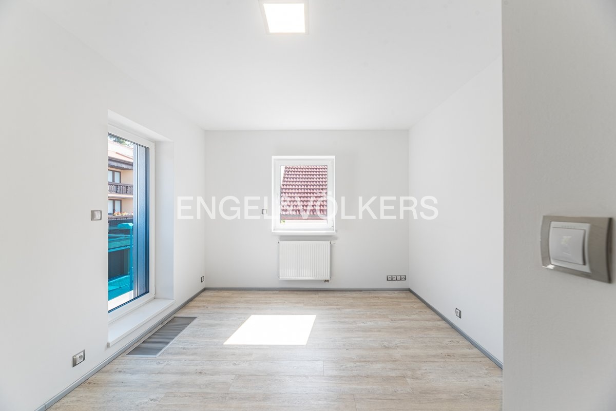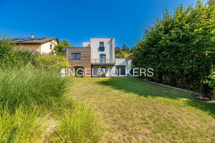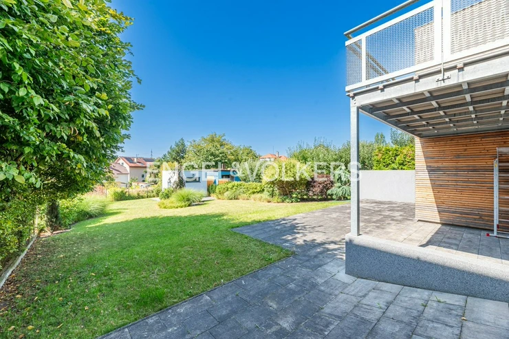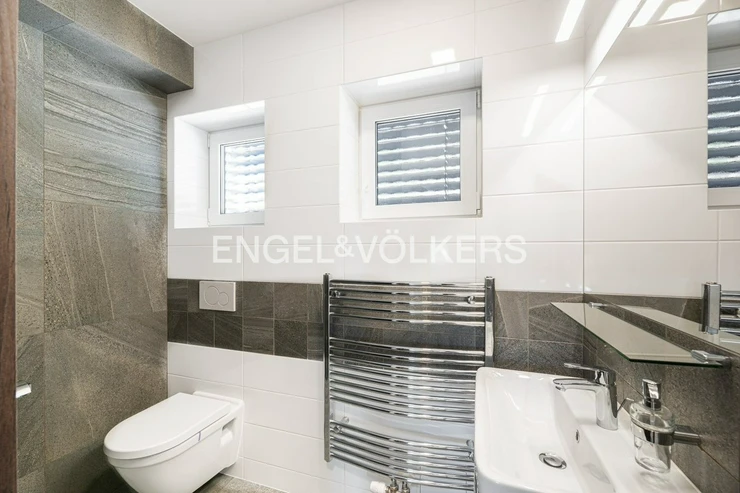 Na Vyšině Street is located at the edge of the Modřanská rokle, this residential area is very quiet, bright and, as the name suggests, offers nice views. The three-storey new building from 2018 is composed of two apartment units that have a common entrance and together there are 5 bedrooms and 2 living rooms with kitchens equipped with quality Bosch appliances. Bedrooms and other rooms have plenty of sockets, including network connections (internet + TV). Bathrooms are lined with neutral tiles and completed with quality sanitary equipment. There are 3 bathrooms in the house and 1 separate toilet with a bidet shower. In front of the house there is a place for 2 cars and a garage is accessible through a large west-facing garden with access from the ground floor which is ideal for summer barbecues. There is also a shed with a mower space in the garden. Due to the excellent insulation and triple glazing in the windows, the house has the energy label A, which is also connected with the minimum costs for the operation of the house, where the amount for charges and energy is CZK 5 000 + internet. The house is completely secured by an alarm system, including a shed in the garden. Private and extra security benefits come with metal electrically operated blinds.