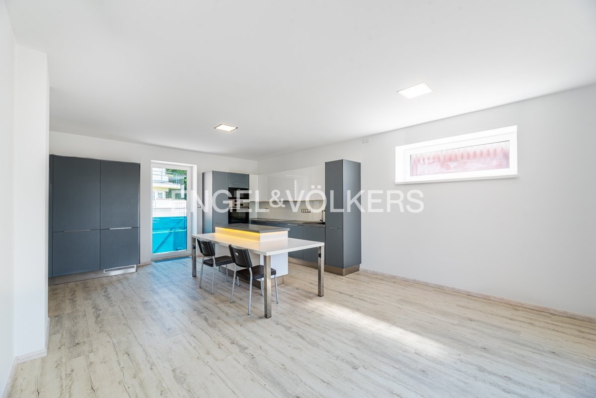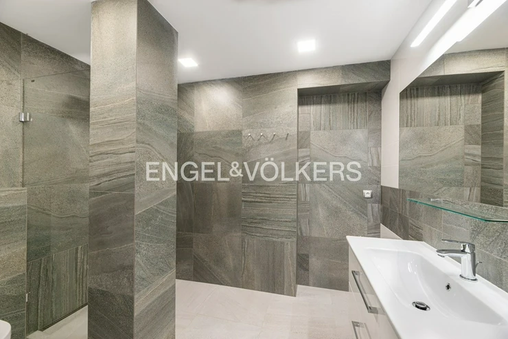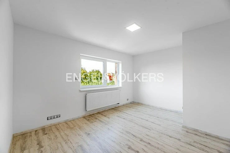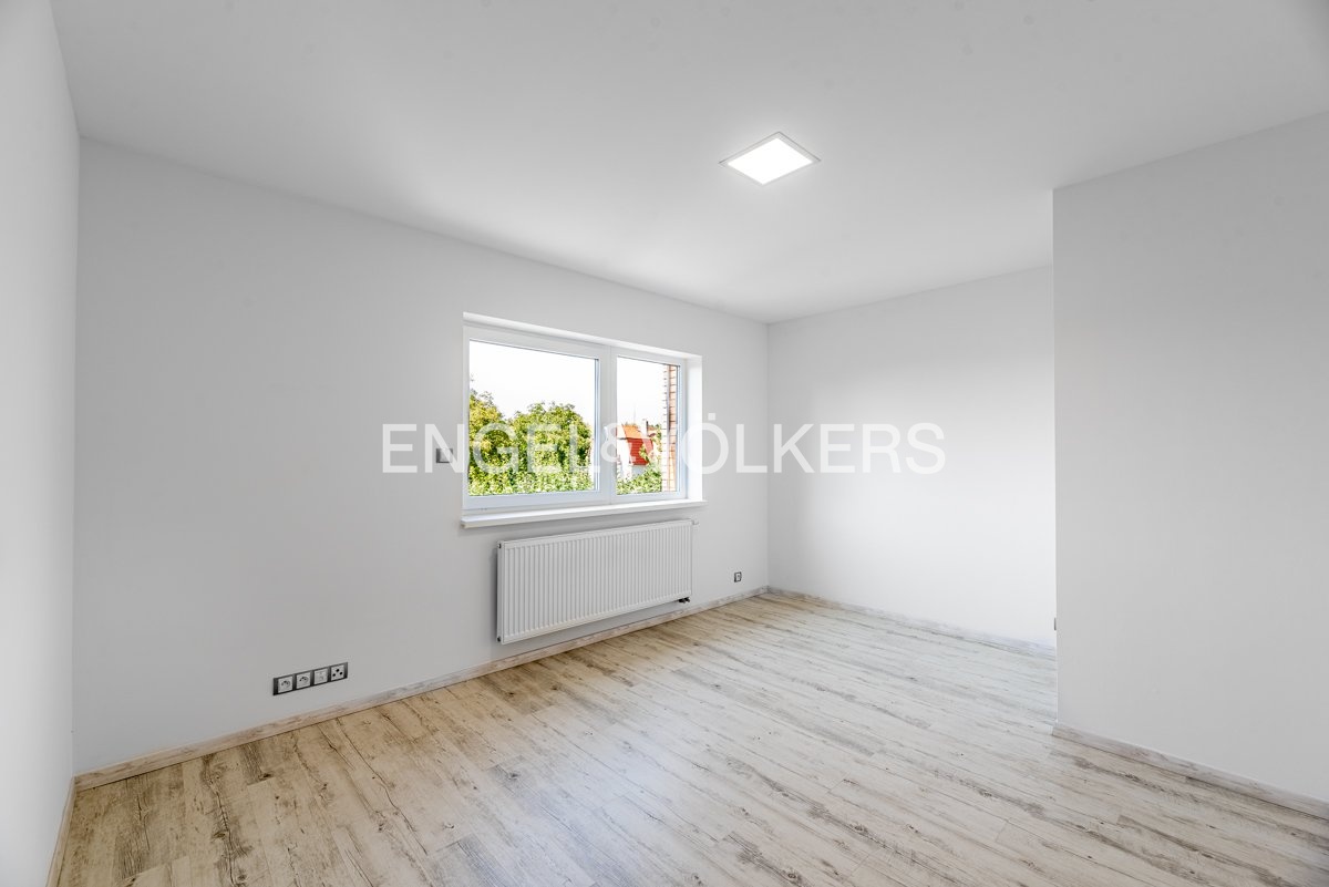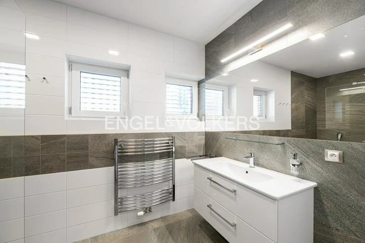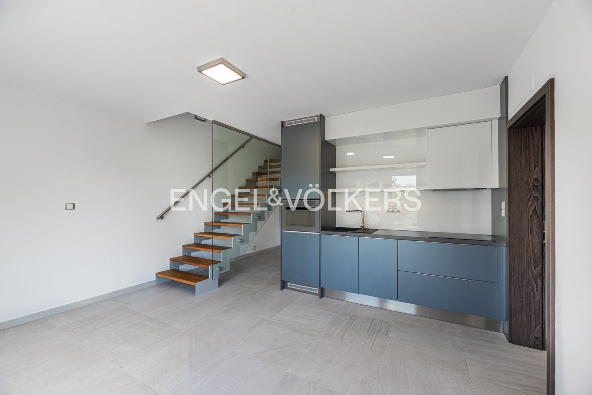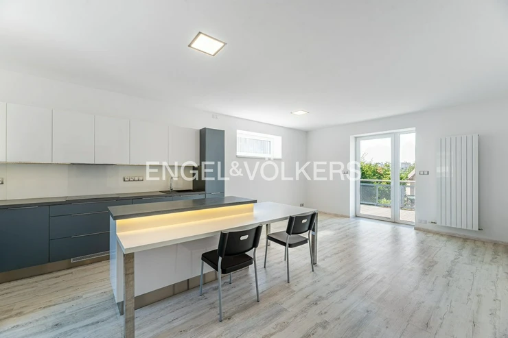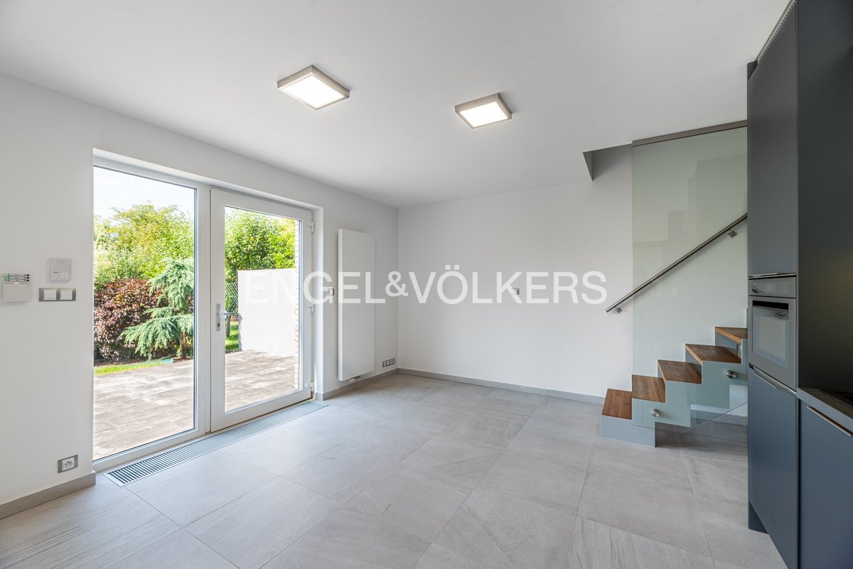 Na Vyšině Street is located at the edge of the Modřanská rokle, this residential area is very quiet, bright and, as the name suggests, offers nice views. The three-storey new building from 2018 is composed of two apartment units that have a common entrance and together there are 5 bedrooms and 2 living rooms with kitchens equipped with quality Bosch appliances. Bedrooms and other rooms have plenty of sockets, including network connections (internet + TV). Bathrooms are lined with neutral tiles and completed with quality sanitary equipment. There are 3 bathrooms in the house and 1 separate toilet with a bidet shower. In front of the house there is a place for 2 cars and a garage is accessible through a large west-facing garden with access from the ground floor which is ideal for summer barbecues. There is also a shed with a mower space in the garden. Due to the excellent insulation and triple glazing in the windows, the house has the energy label A, which is also connected with the minimum costs for the operation of the house, where the amount for charges and energy is CZK 5 000 + internet. The house is completely secured by an alarm system, including a shed in the garden. Private and extra security benefits come with metal electrically operated blinds.