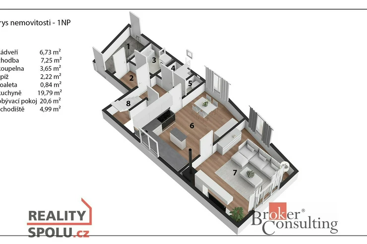Interiér je plně obyvatelný a připravený k nastěhování. Dispozičně je dům velmi praktický. V přízemí se nachází předsíň, chodba, samostatné WC, koupelna/technická místnost, kuchyně s jídelním koutem a neprůchozí obývací pokoj orientovaný směrem do zahrady. V patře pak ložnice, pokoj a koupelna s WC. V podkroví je dalších 60m2, které je možno využít jako další skladovací prostor. A sklep? Ten má dům také.