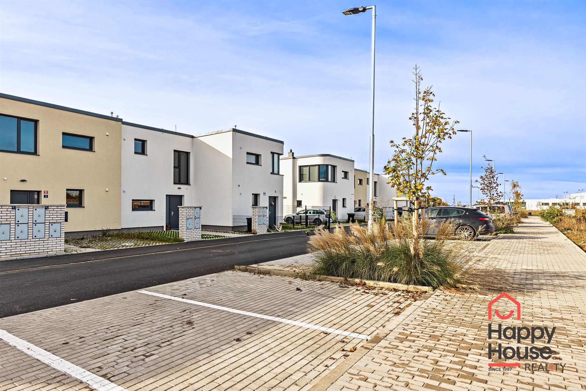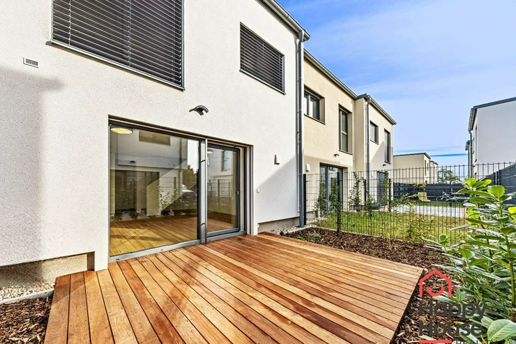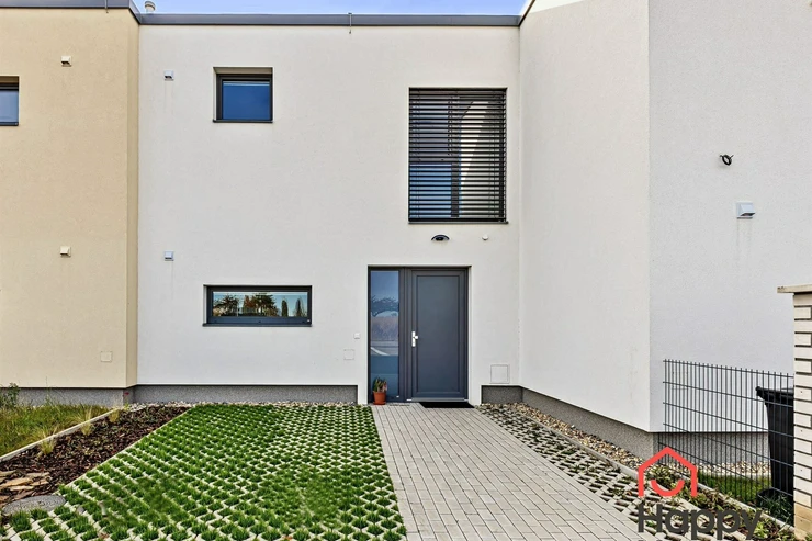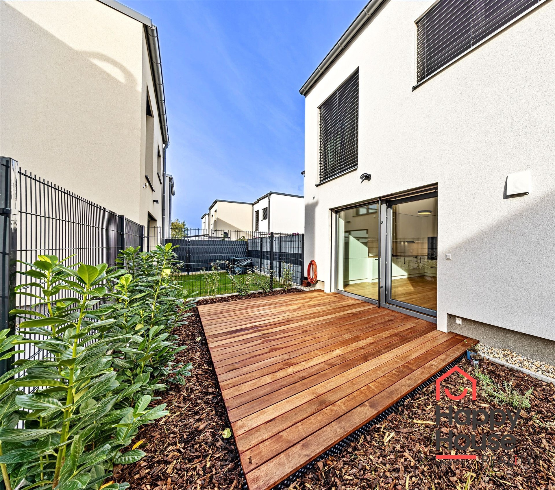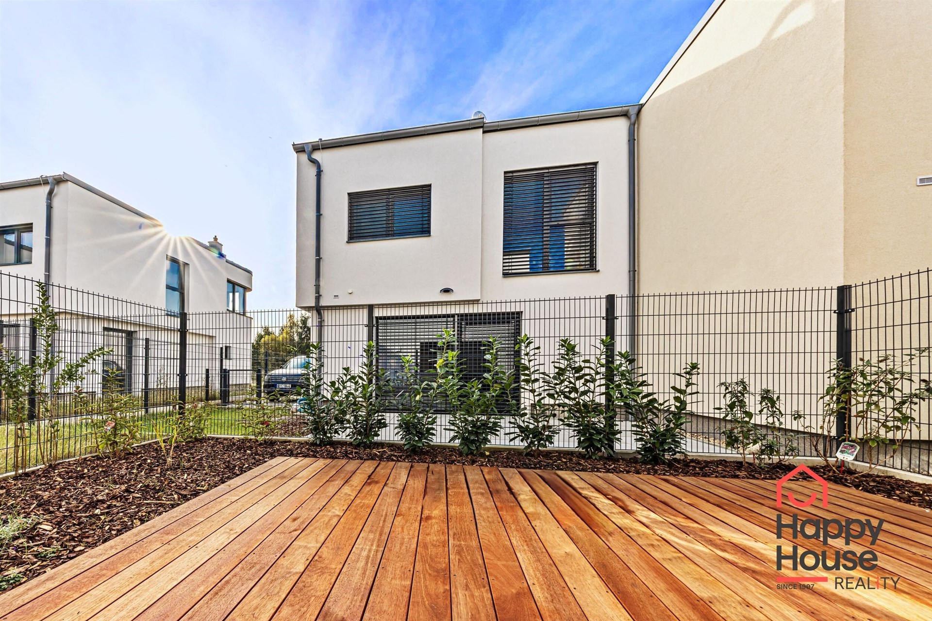 We offer for rent a new modern two-storey terraced family house 4+kitchenette with 3 bedrooms (105.2 sqm of usable area) which offers 2 parking spaces on its own plot in front of the house. South-facing garden (58.7 sqm) with a terrace made of tropical wood and freshly planted bushes. A street and a field facing to the north, peripheral development project in a newly emerging district of Residence Kolovraty in Prague 10.