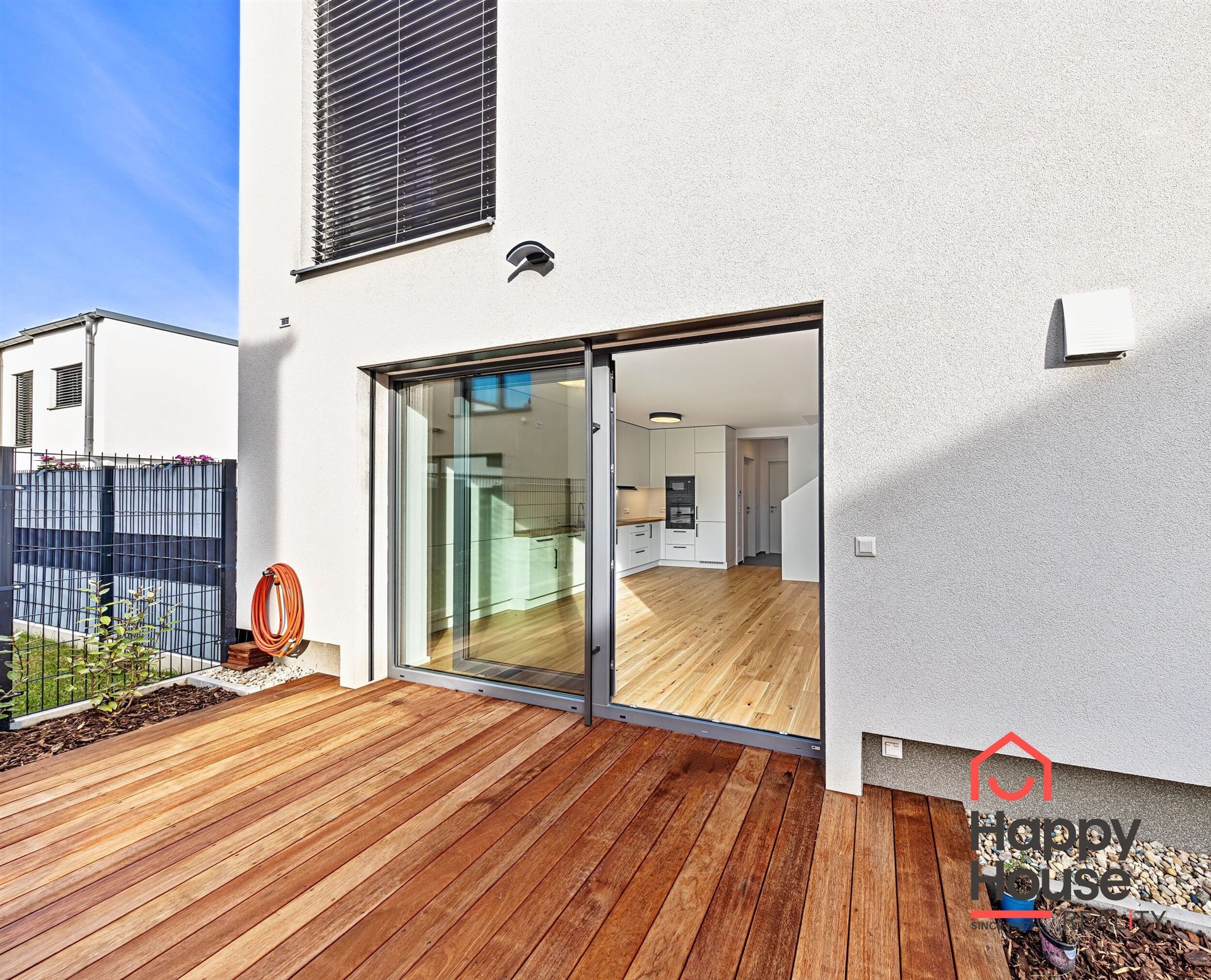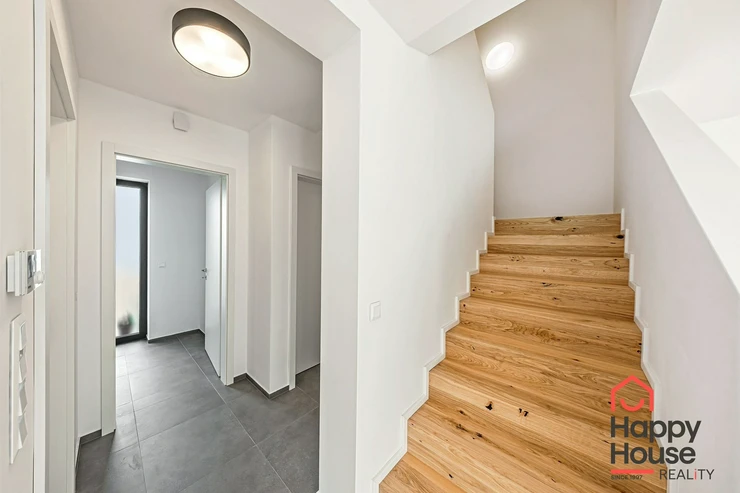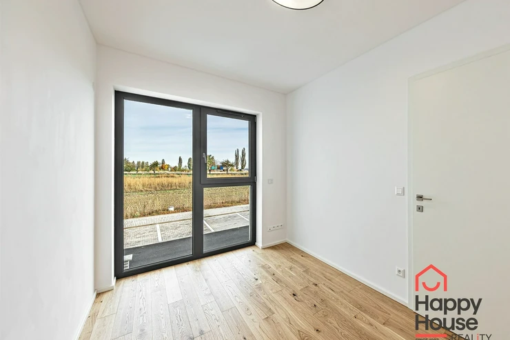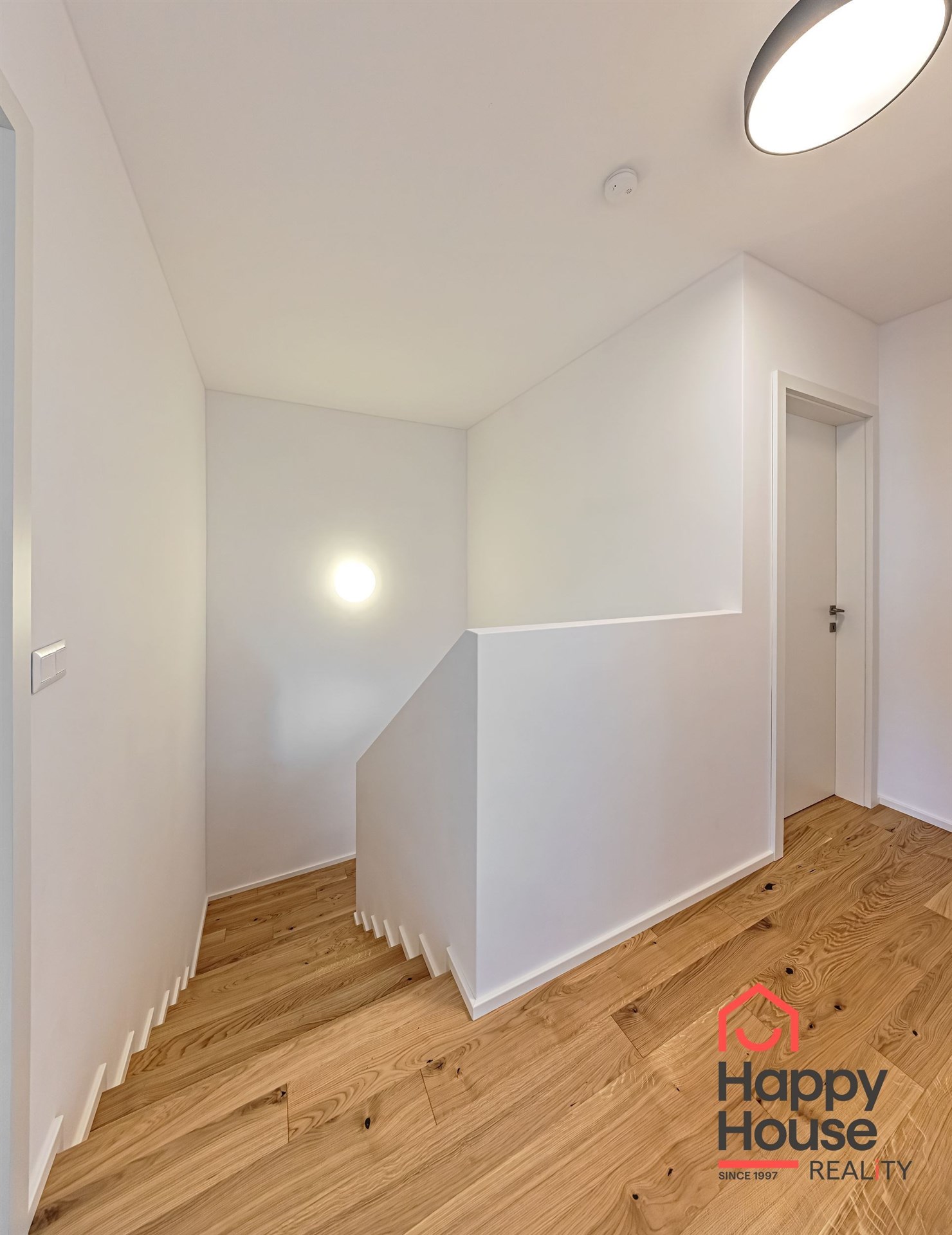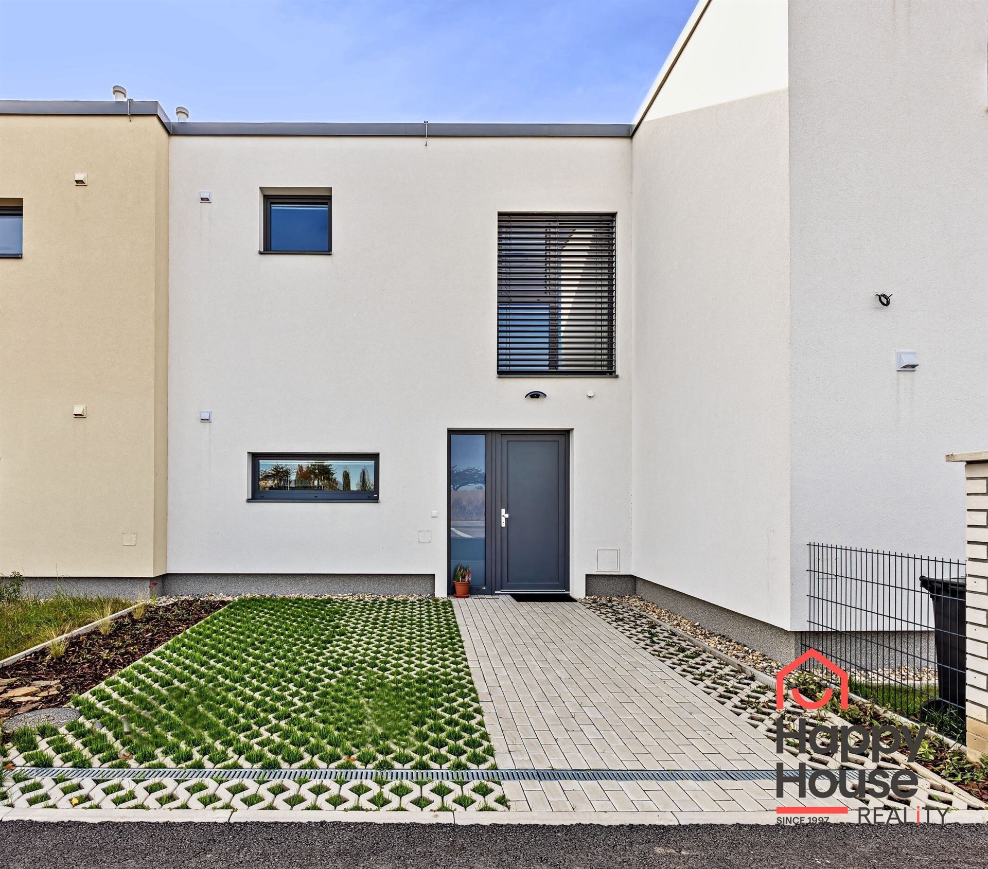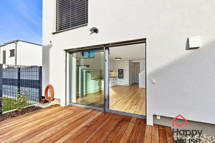 We offer for rent a new modern two-storey terraced family house 4+kitchenette with 3 bedrooms (105.2 sqm of usable area) which offers 2 parking spaces on its own plot in front of the house. South-facing garden (58.7 sqm) with a terrace made of tropical wood and freshly planted bushes. A street and a field facing to the north, peripheral development project in a newly emerging district of Residence Kolovraty in Prague 10.