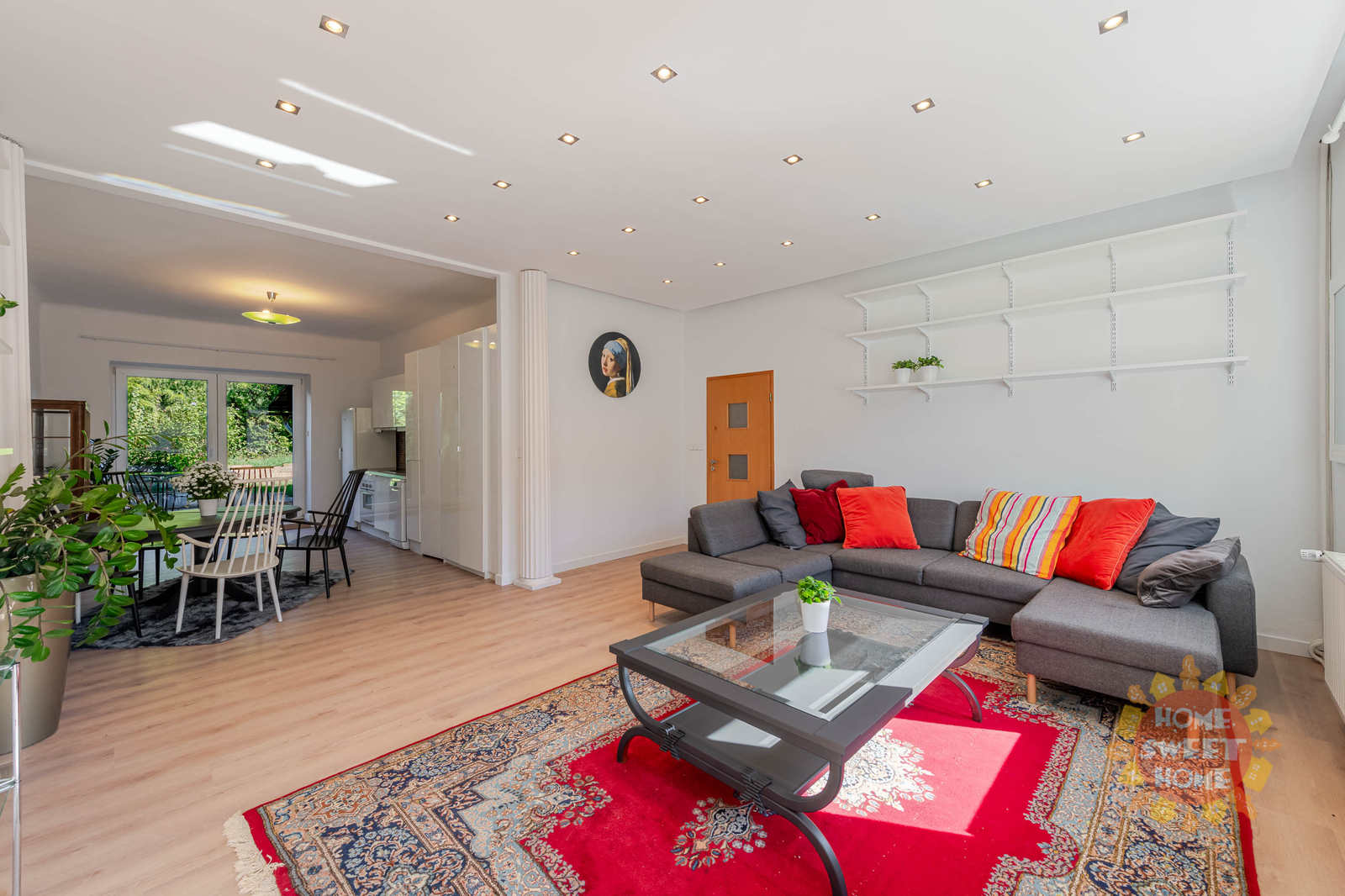 Ground floor: fully equipped kitchen (fridge with freezer, ceramic hob, dishwasher, electric oven), living area, toilet and storage room. From the living room there is direct access to a terrace and a private garden (approx. 50 m²) with seating both in the open air and under a covered pergola.