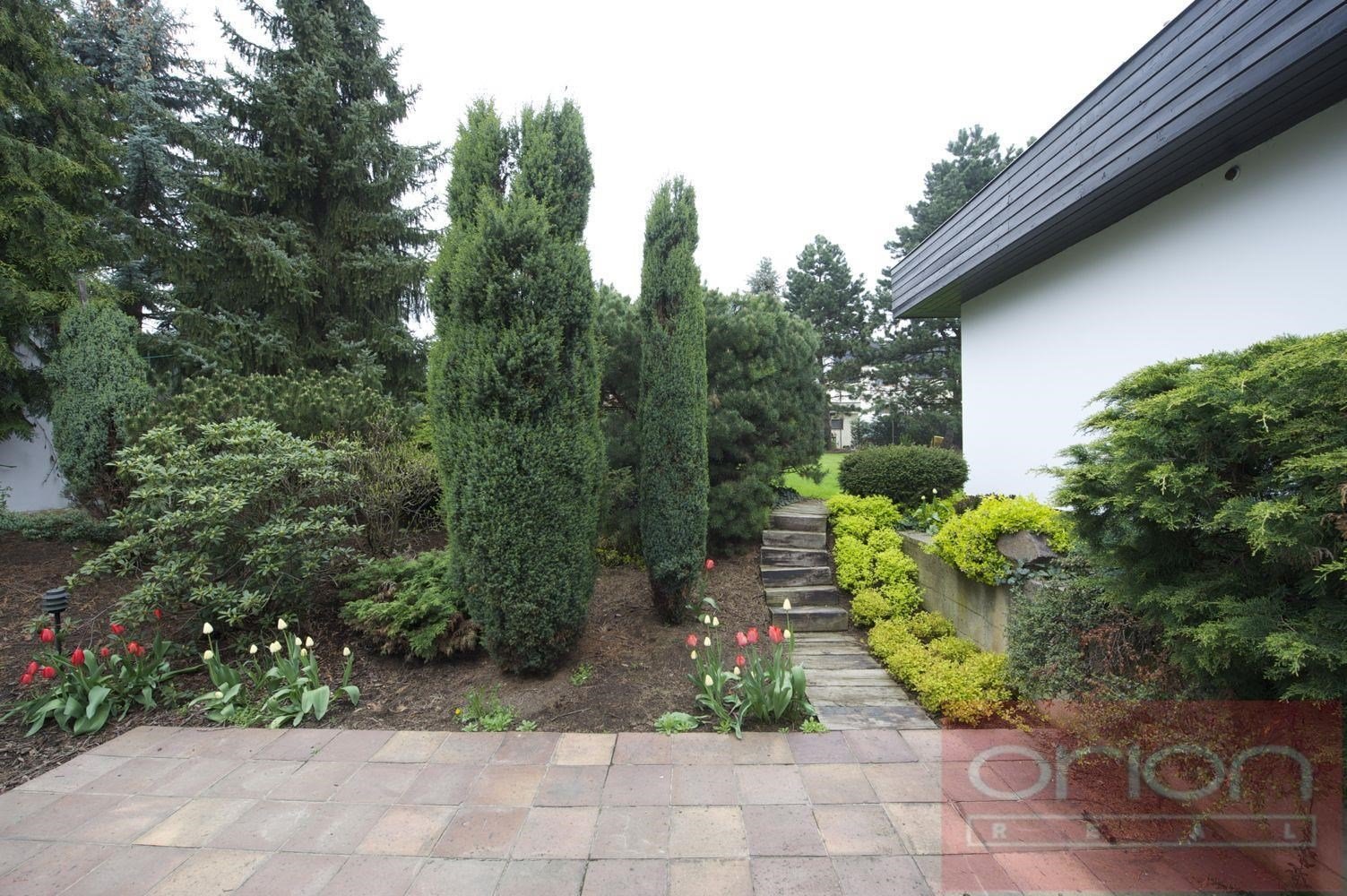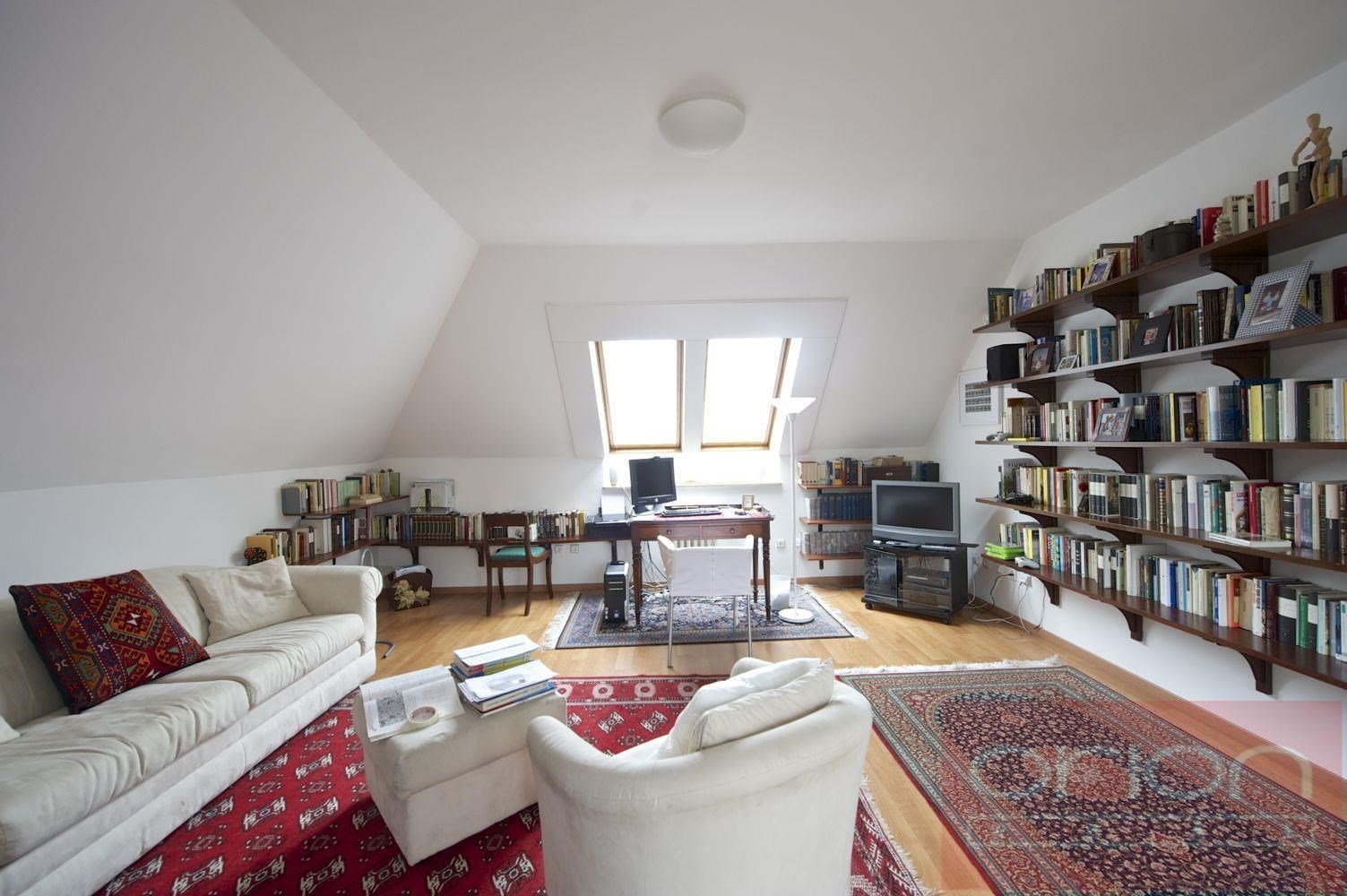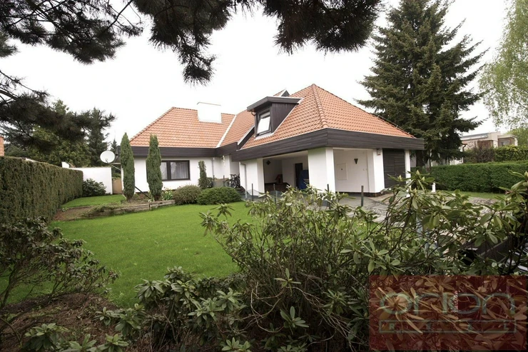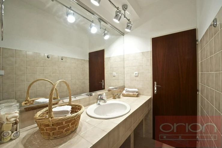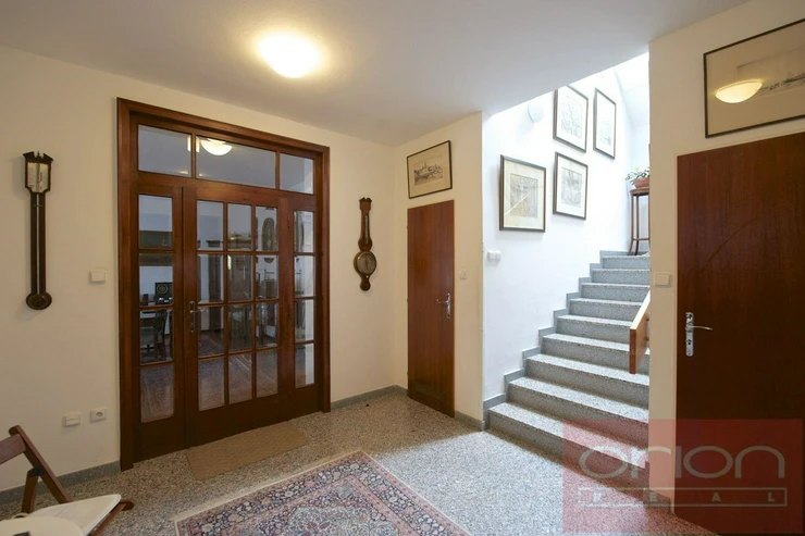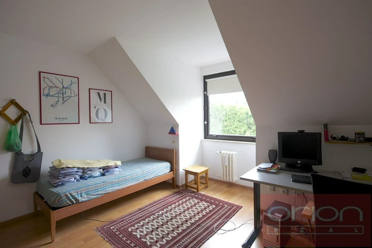We offer for rent an unfurnished five bedroom family house with a well-kept garden of 1000 sqm in a quiet location of Prague 4 - Kunratice near the British International School. The house has a total area of 417 sqm and offers an entrance hall, a spacious living room with dining room and fireplace (61 sqm), a fully equipped kitchen with new Bosch appliances, 5 bedrooms with built-in wardrobes, the master bedroom has its own bathroom, 4 other bathrooms, 2 dressing rooms, a fitness room and a wine cellar, a laundry room. The floors are parquet and tiled. The house is equipped with a security system, satellite dish, telephone lines, internet. There is a garage for 2 cars, a shelter for 1 car + two additional parking spaces on the property.