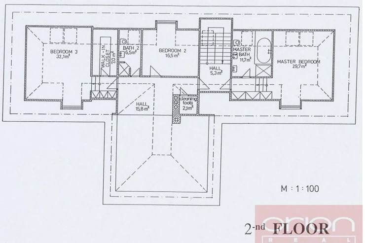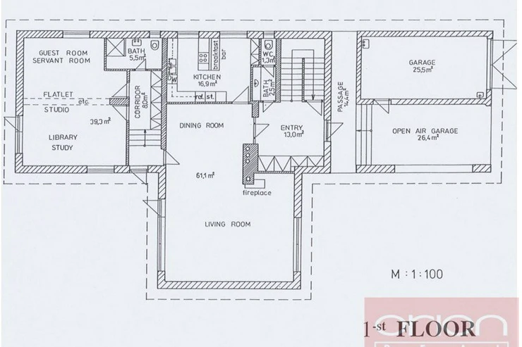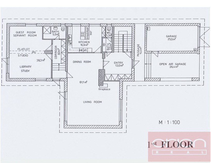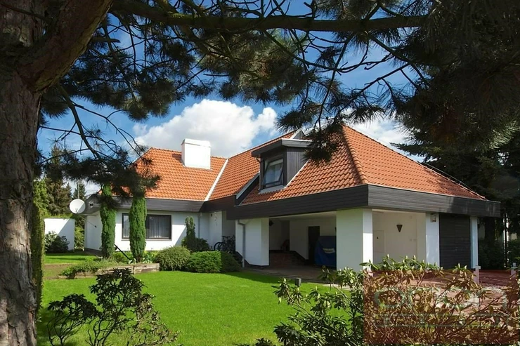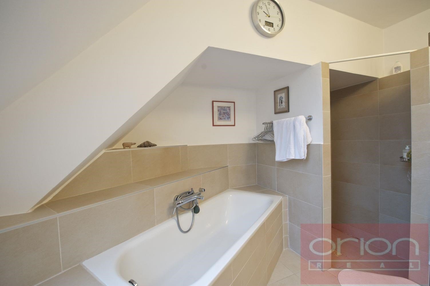 We offer for rent an unfurnished five bedroom family house with a well-kept garden of 1000 sqm in a quiet location of Prague 4 - Kunratice near the British International School. The house has a total area of 417 sqm and offers an entrance hall, a spacious living room with dining room and fireplace (61 sqm), a fully equipped kitchen with new Bosch appliances, 5 bedrooms with built-in wardrobes, the master bedroom has its own bathroom, 4 other bathrooms, 2 dressing rooms, a fitness room and a wine cellar, a laundry room. The floors are parquet and tiled. The house is equipped with a security system, satellite dish, telephone lines, internet. There is a garage for 2 cars, a shelter for 1 car + two additional parking spaces on the property.