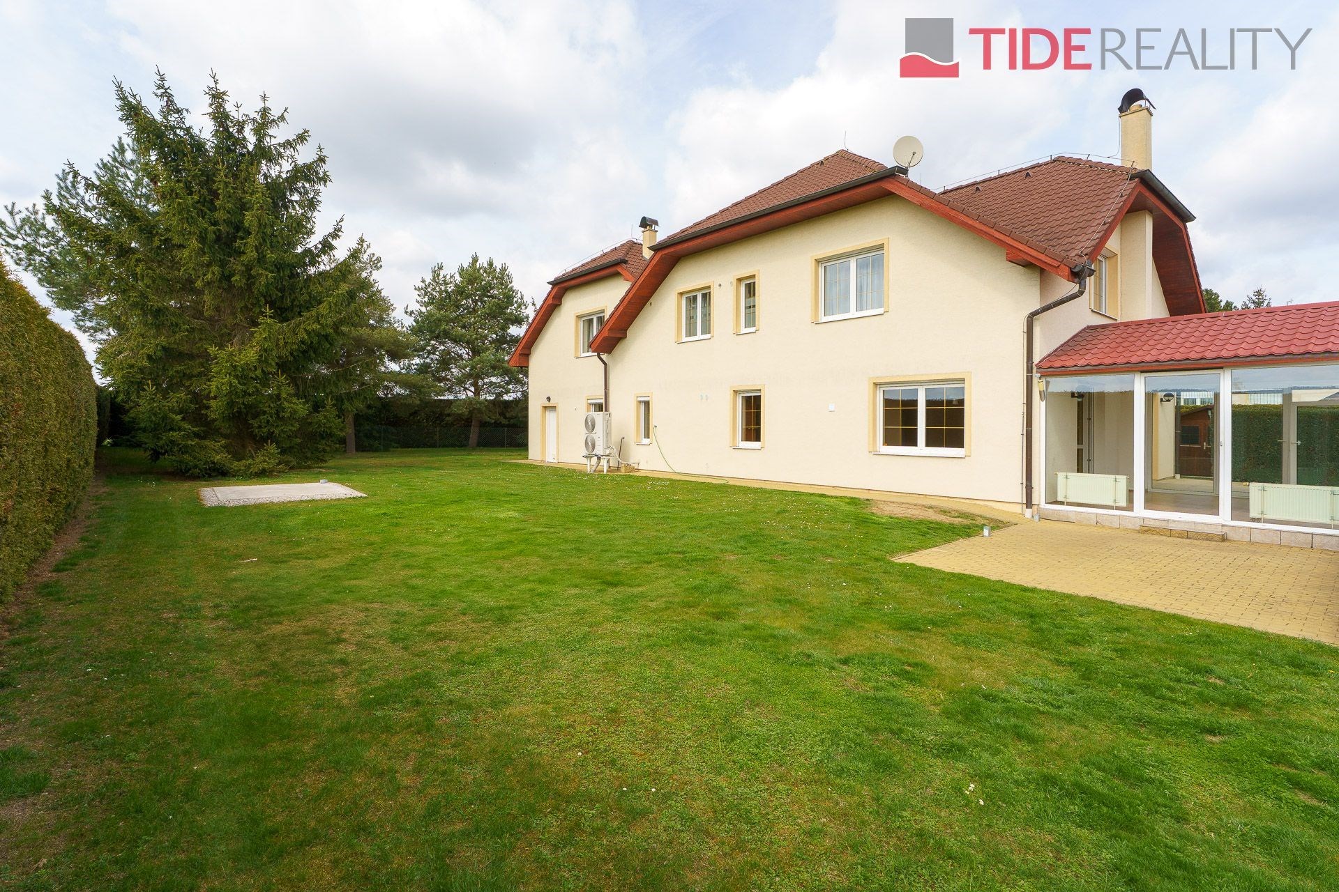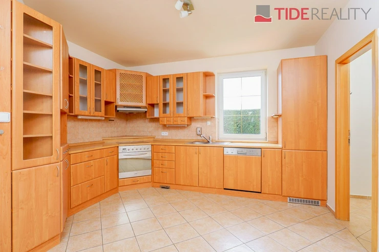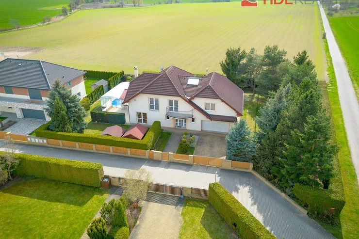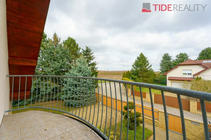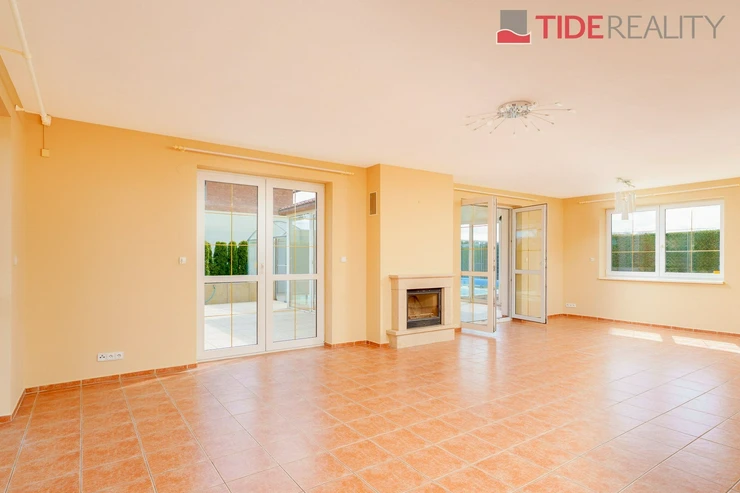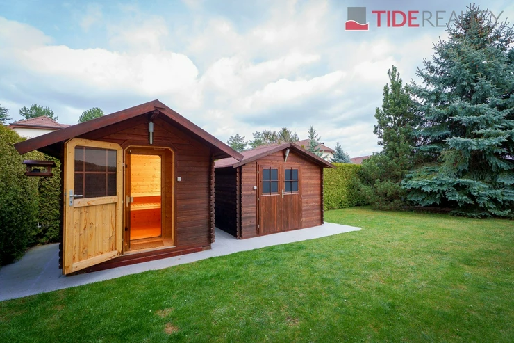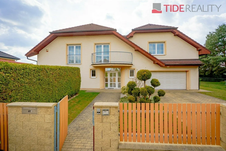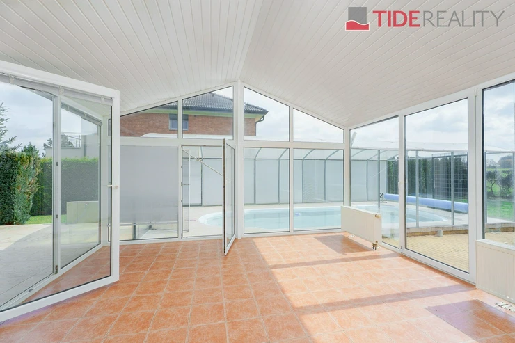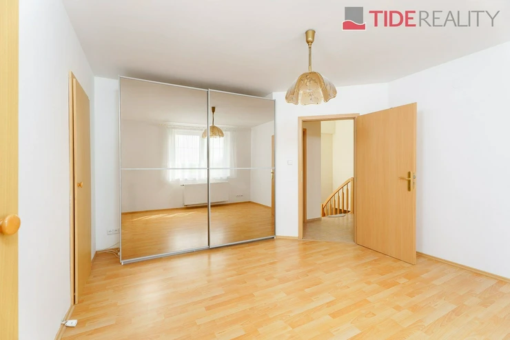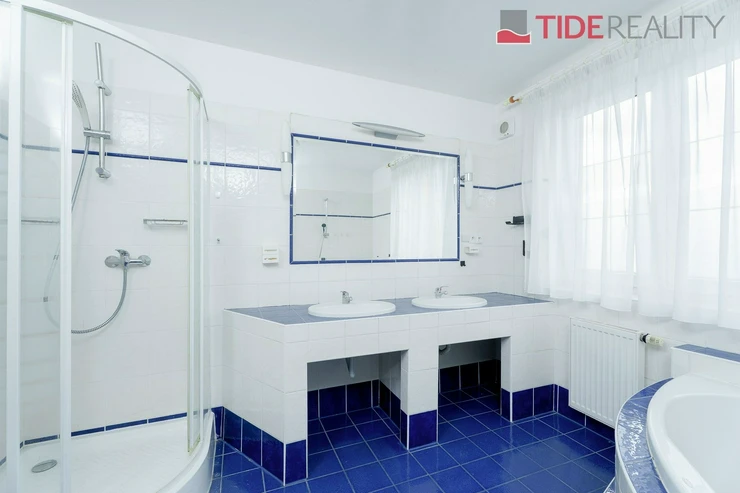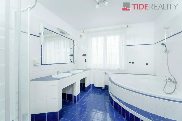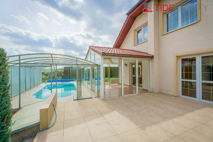 We are offering for rent a very spacious house suitable for a large family, with a total usable area of 290 m2 and a well-maintained garden of 560 m2. Spread over two above-ground floors are 5 bedrooms, a living room with a fireplace connected to a large conservatory and a covered heated swimming pool with a counter-current system, a fully equipped kitchen, a total of 3 bathrooms (one en-suite), and a separate laundry room. The house is equipped with built-in wardrobes and ample additional storage space. The house is heated through underfloor heating connected to an efficient heat pump, which reduces overall energy costs. There is a sauna on the property with necessary facilities. The garden is equipped with an automatic irrigation system. Garage for 2 cars, additional parking possible on the property in front of the house. The house is located in a quiet residential area just a few steps from nature and also within a short distance from Průhonice Park. Energy performance rating class C.