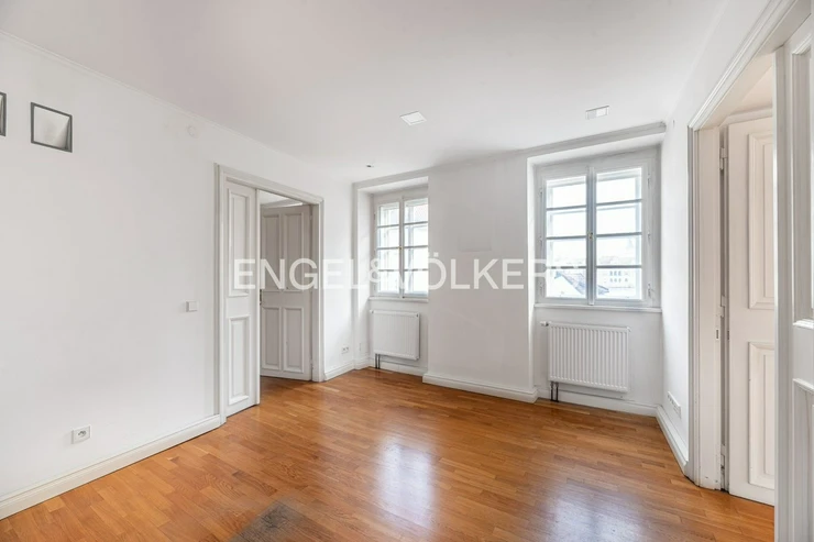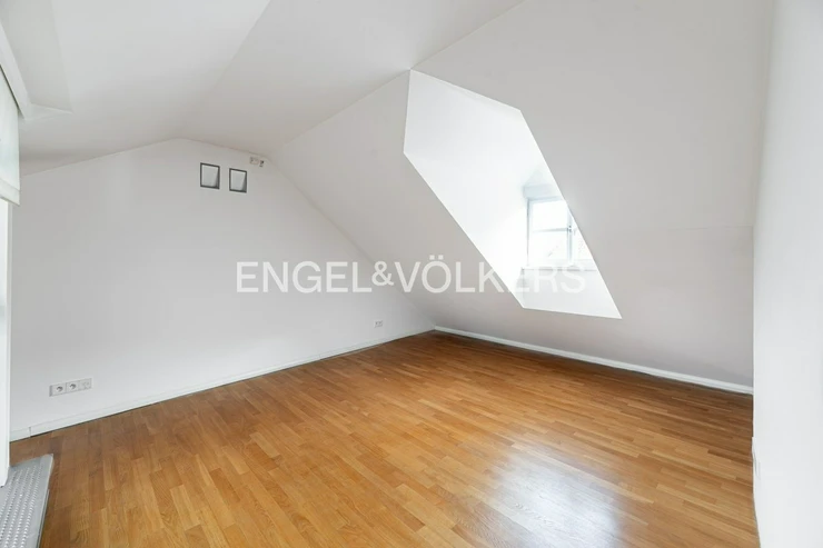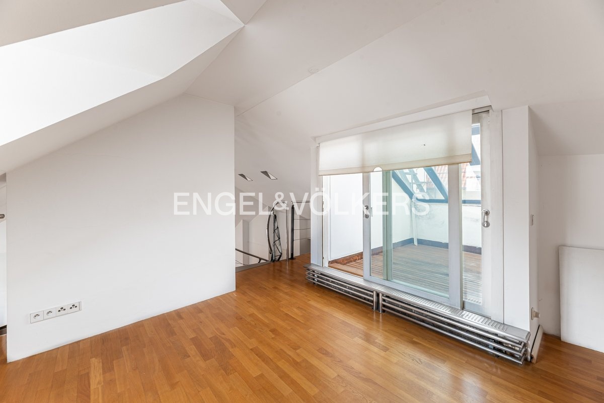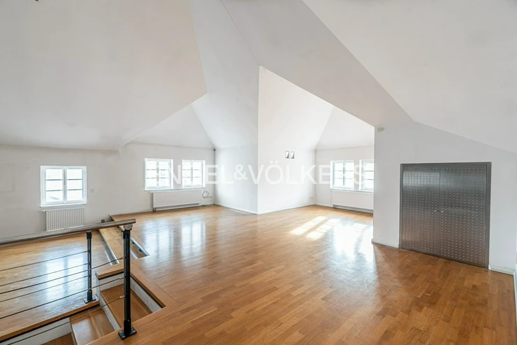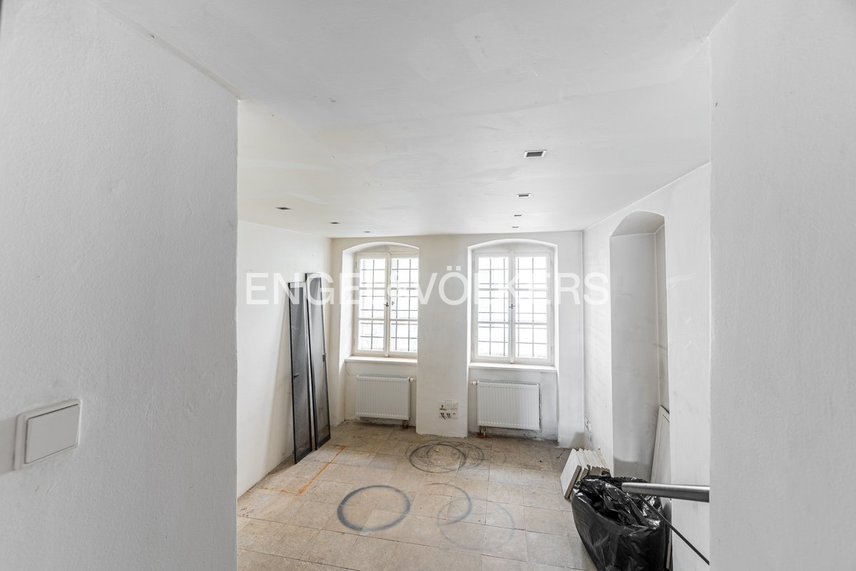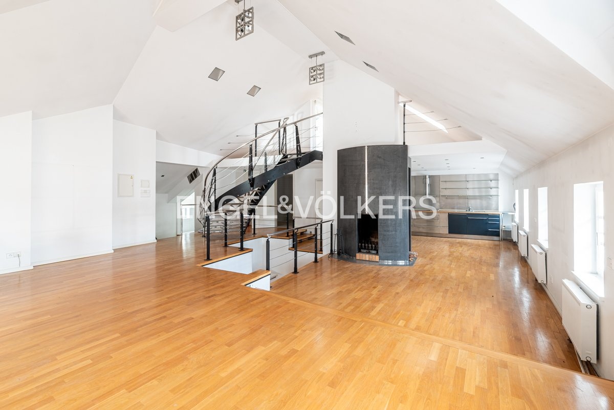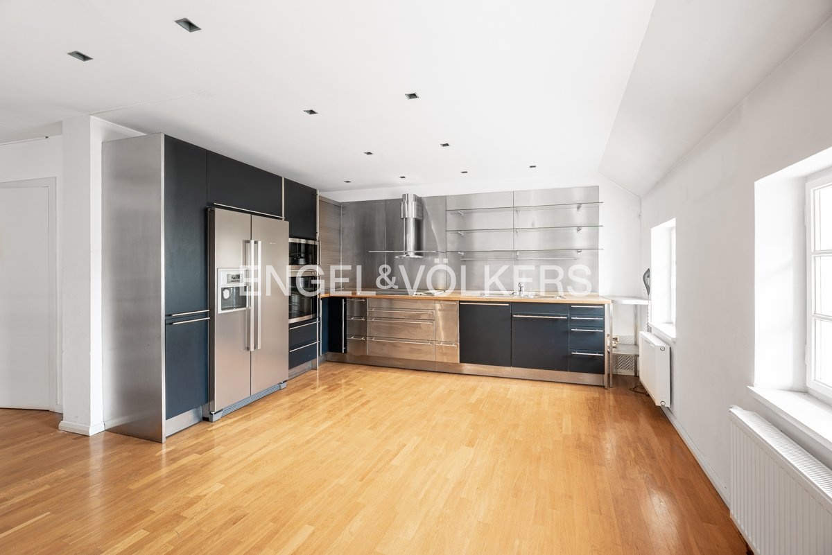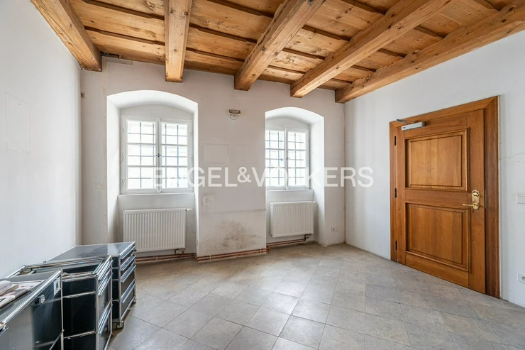 Wooden beams, attic character, and plenty of light create a unique atmosphere for living in a historic building.