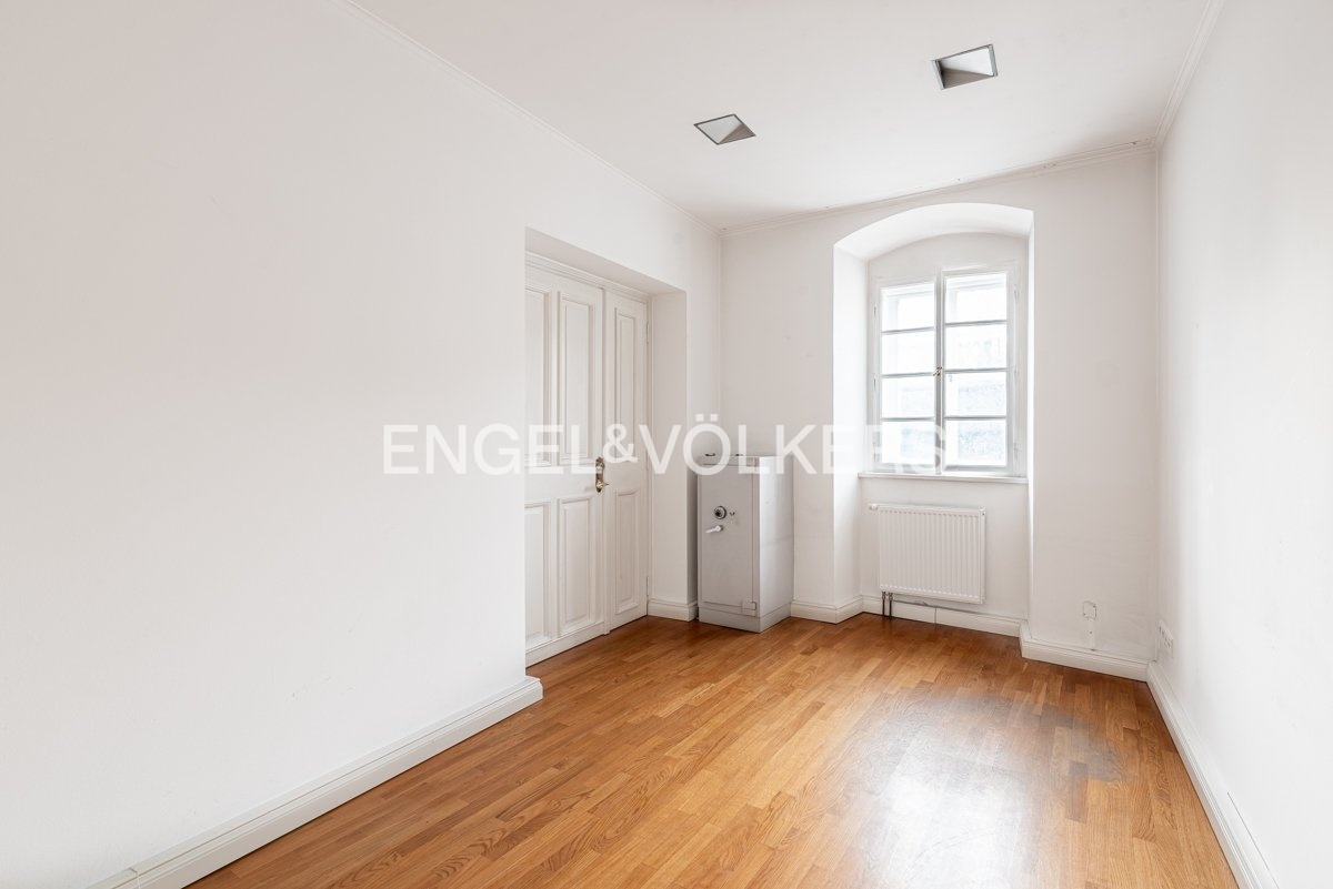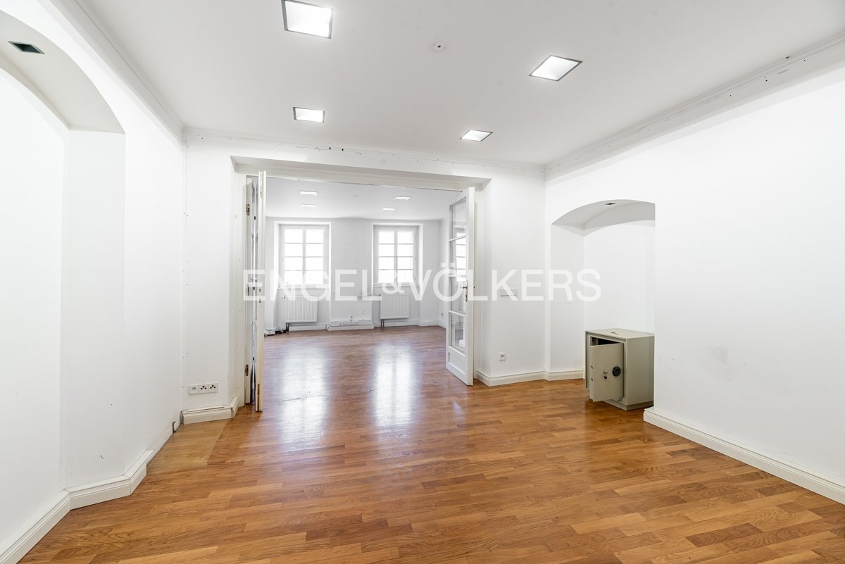 The upper floors feature a stylish maisonette apartment that can serve as a management residence, diplomatic housing, or an exclusive private apartment.