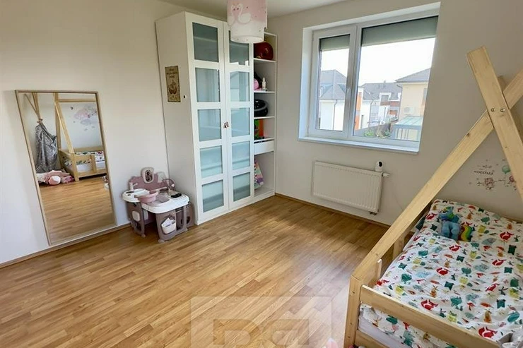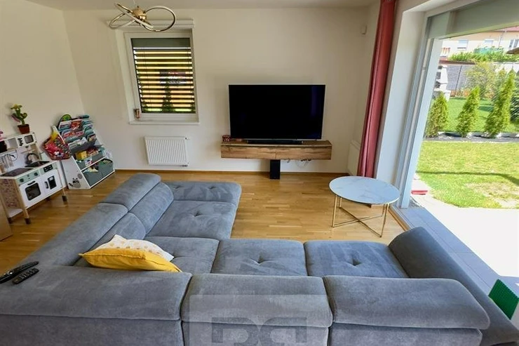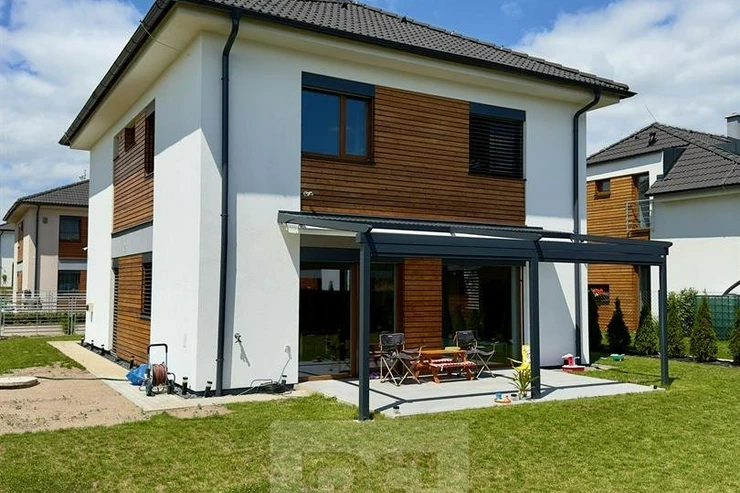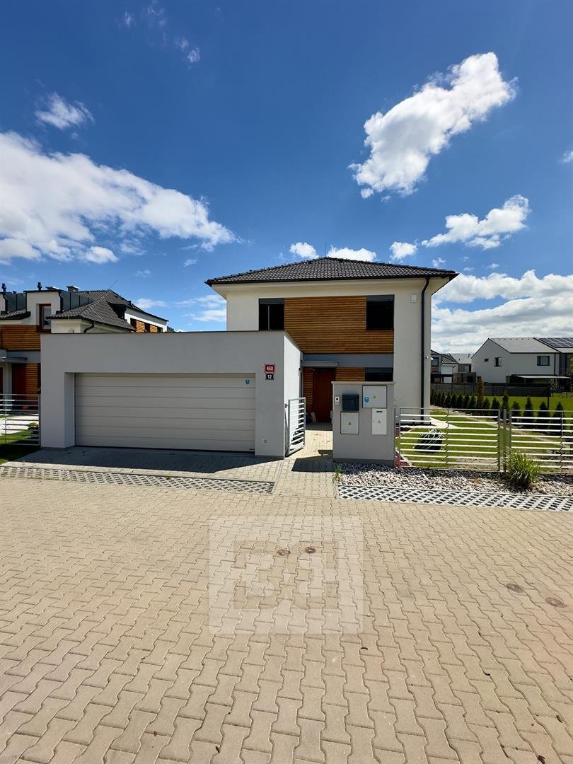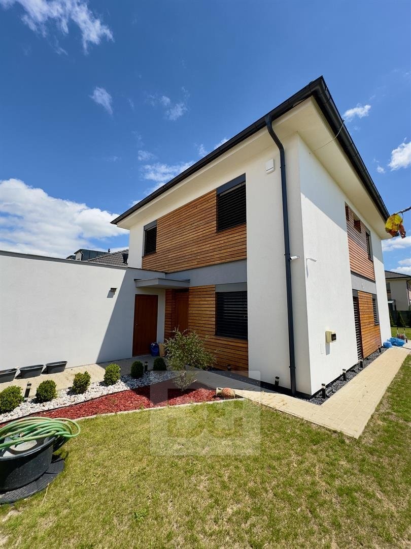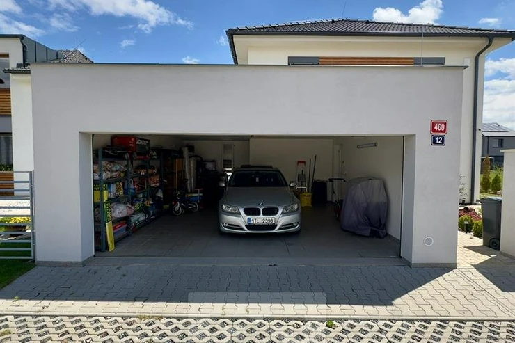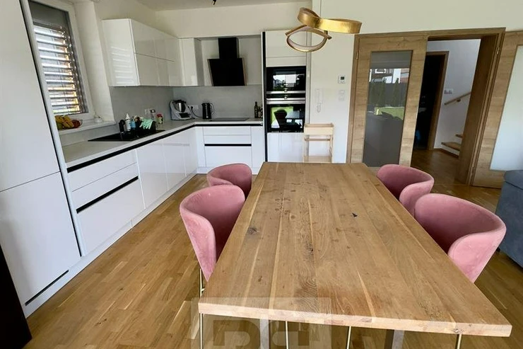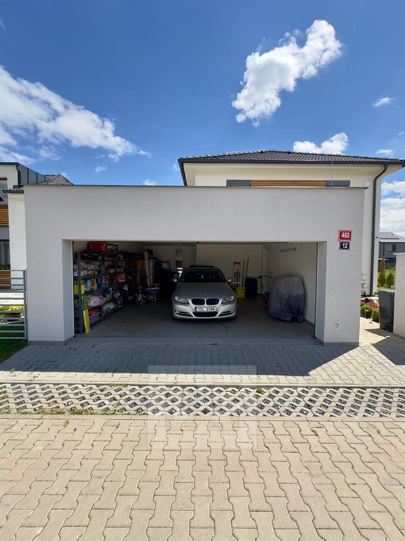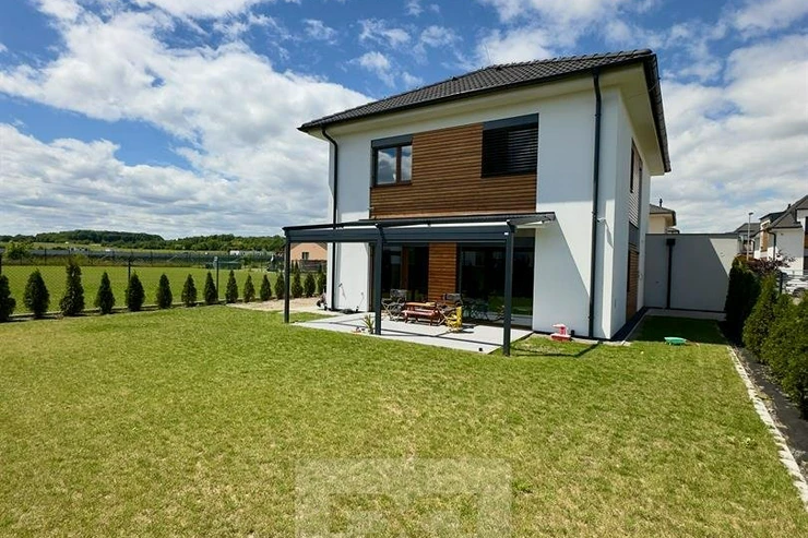 We offer you a one-story family house for rent with a living area of 144 m² and a garden of 350 m², in Borová street - Zlonín village. The ground floor consists of an entrance hall, a bathroom with a shower and a toilet, a washing machine and a dryer are available, a guest room with equipment (see photo), a storage room in the area under the stairs and a living room with a kitchenette fully equipped with built-in appliances. The American fridge and other equipment remain, except for the TV, sofa and coffee table. From the living room you can access the 17 m² terrace with an electric awning and shading, and the 350 m² garden with a 14 m³ rainwater tank. We go up the stairs to the first floor, which consists of a hall, a separate toilet, a bathroom with a bathtub, two offices that will remain empty, tables and chairs can be left under agreement, a bedroom with a spacious wardrobe and a children's room. The house has a garage of 37 m². The shelving, second fridge, grill, water softener and garden equipment remain here. Window blinds installed in the windows, a smart home controlled by a mobile application, a second water meter for utility water, which is 50% cheaper.