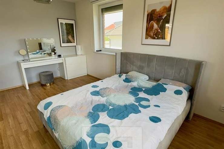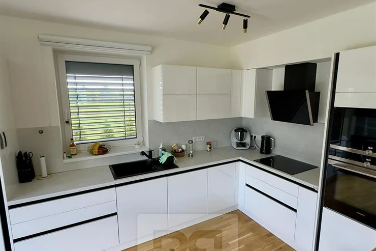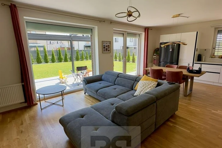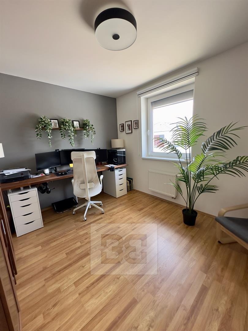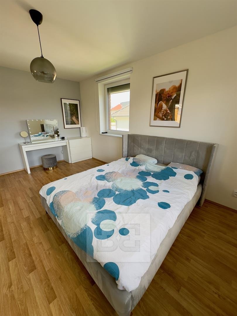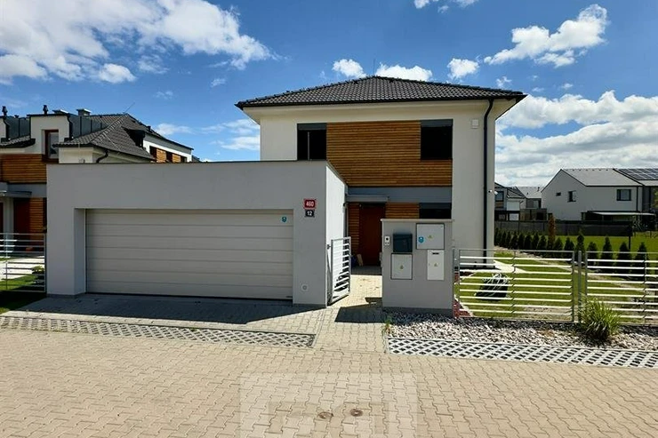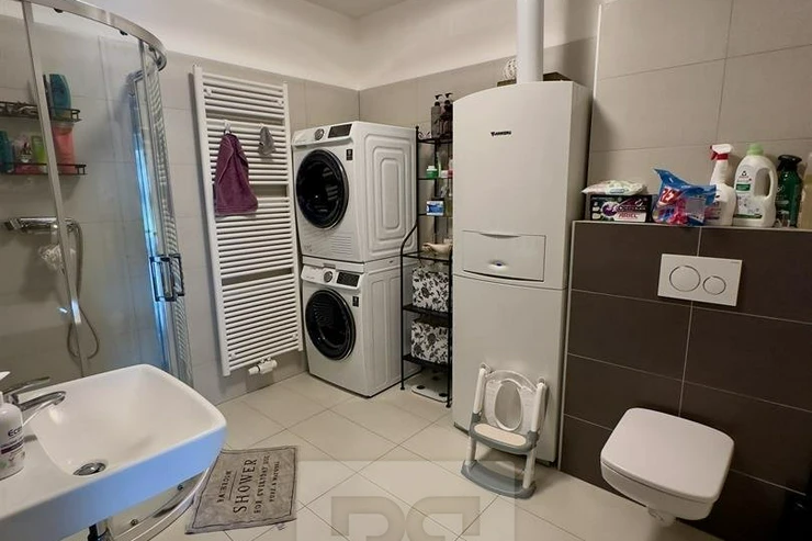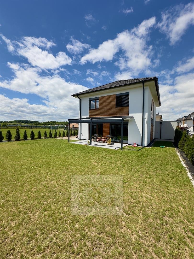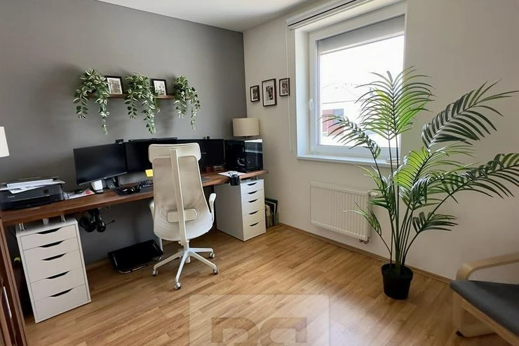 We offer you a one-story family house for rent with a living area of 144 m² and a garden of 350 m², in Borová street - Zlonín village. The ground floor consists of an entrance hall, a bathroom with a shower and a toilet, a washing machine and a dryer are available, a guest room with equipment (see photo), a storage room in the area under the stairs and a living room with a kitchenette fully equipped with built-in appliances. The American fridge and other equipment remain, except for the TV, sofa and coffee table. From the living room you can access the 17 m² terrace with an electric awning and shading, and the 350 m² garden with a 14 m³ rainwater tank. We go up the stairs to the first floor, which consists of a hall, a separate toilet, a bathroom with a bathtub, two offices that will remain empty, tables and chairs can be left under agreement, a bedroom with a spacious wardrobe and a children's room. The house has a garage of 37 m². The shelving, second fridge, grill, water softener and garden equipment remain here. Window blinds installed in the windows, a smart home controlled by a mobile application, a second water meter for utility water, which is 50% cheaper.