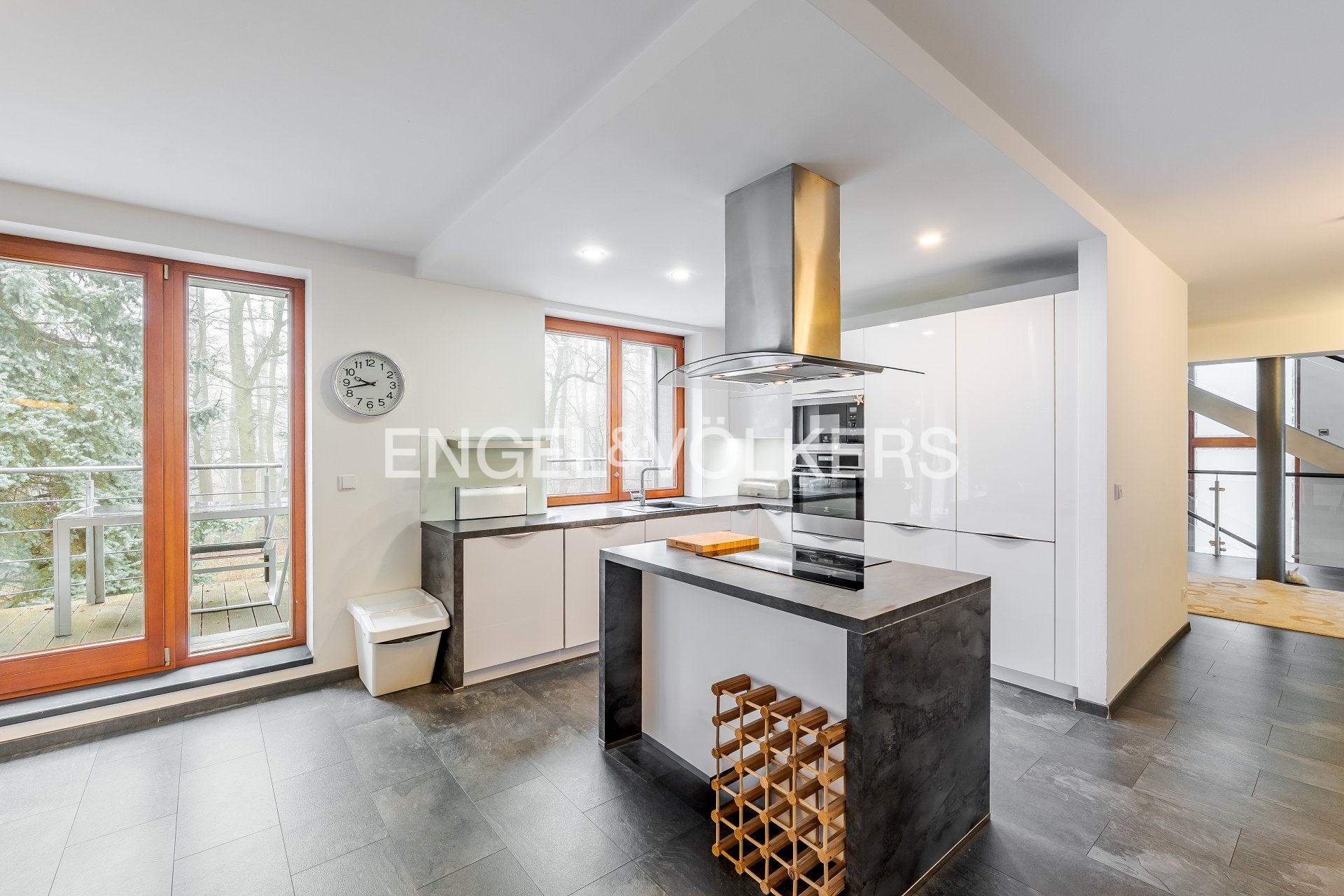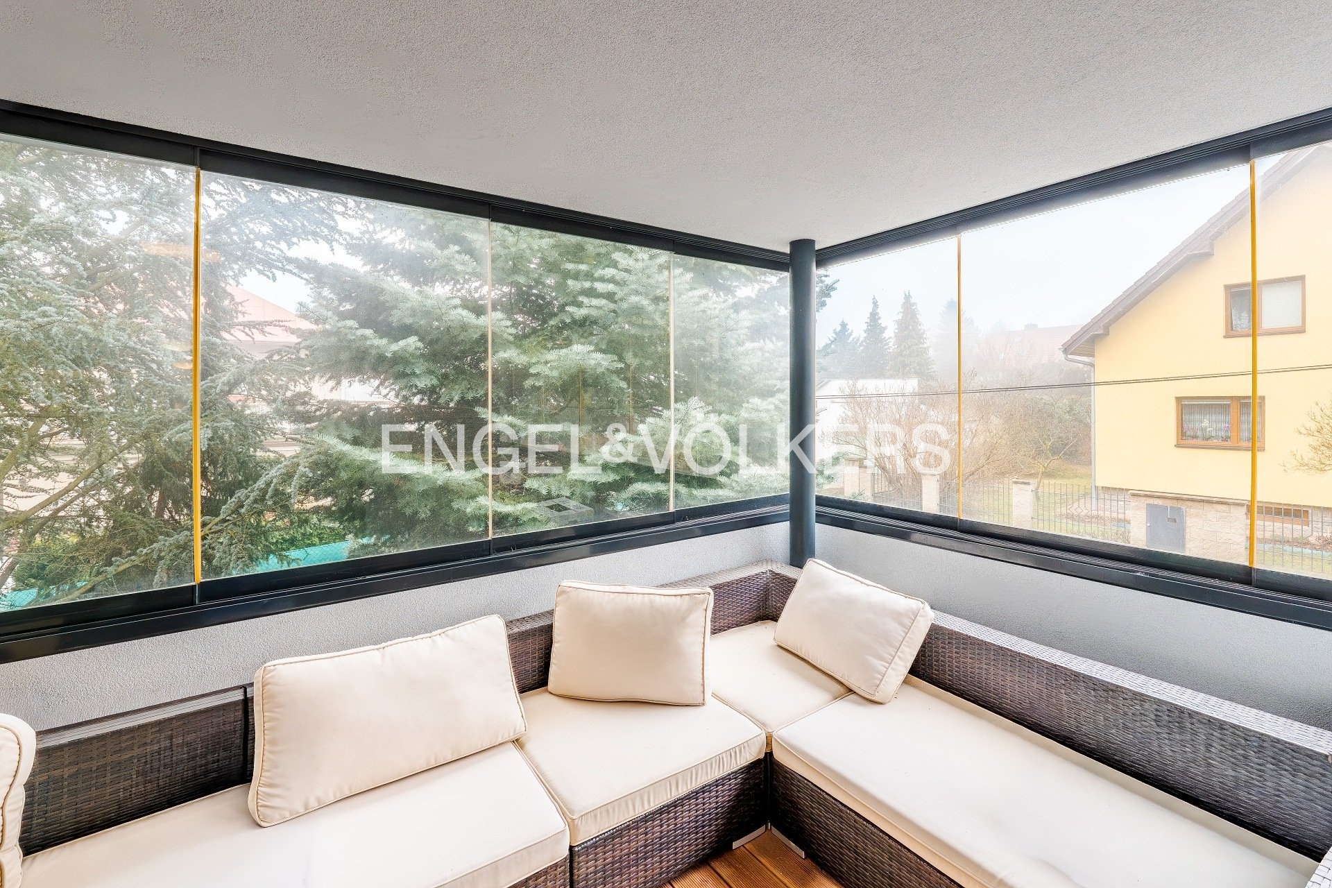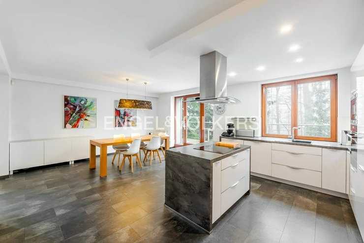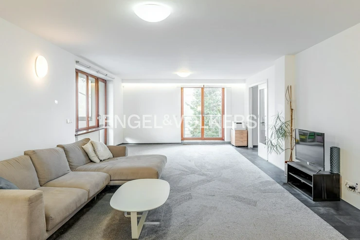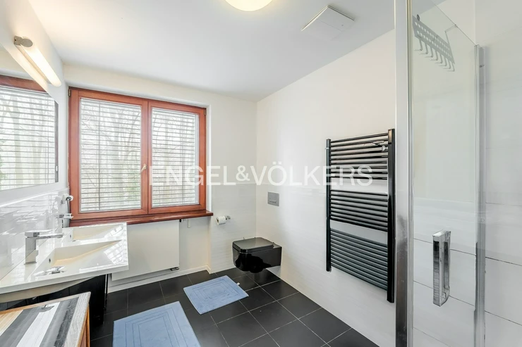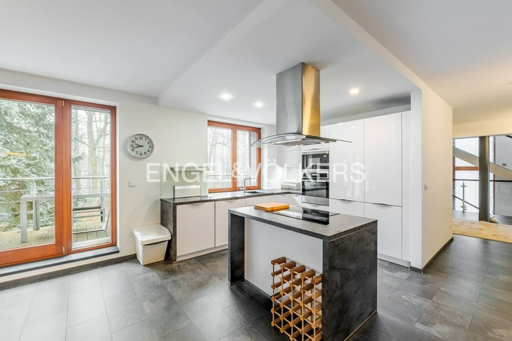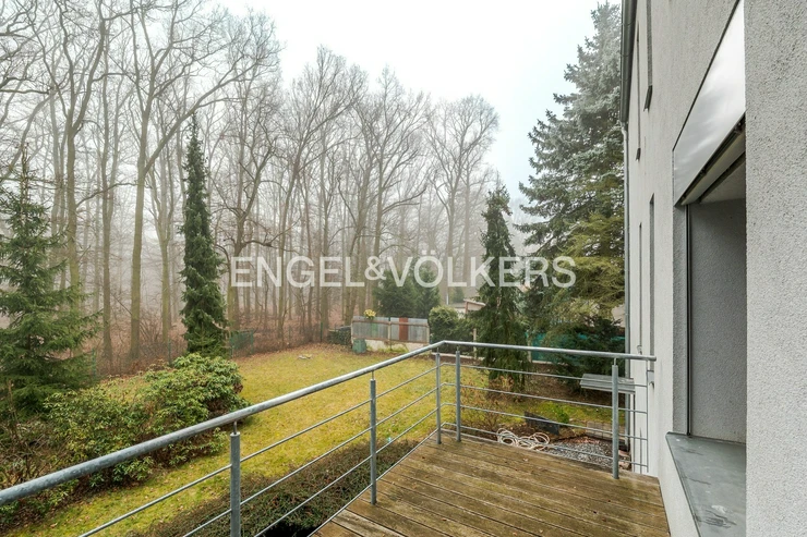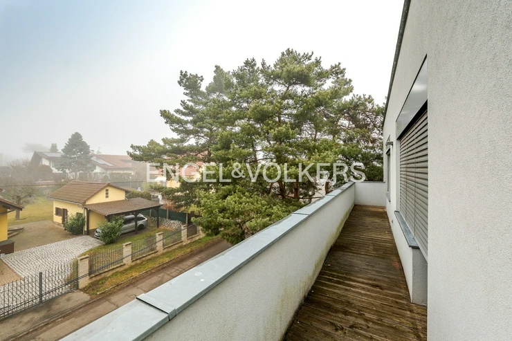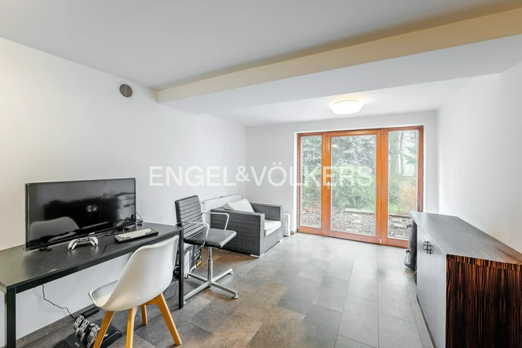 The house offers generous outdoor spaces in the form of loggias and terraces, a pleasant garden, electric blinds, a practical layout, and plenty of privacy for all household members. It is situated in a quiet residential area, popular for its combination of nature, full civic amenities, and good accessibility to the center of Prague. The surrounding area has all the necessary infrastructure – Kunratice Forest, shops, services, restaurants, and smaller shopping centers like OC Kunratice. The location is served by bus lines (e.g., 154, 177, 193, or 203), providing quick connections to metro line C.