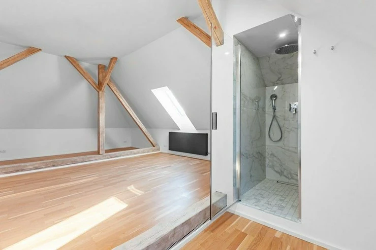 The layout includes 3 floors and a basement, on the 1st floor there is an entrance hall, a generous open space of the living room with a dining room and a fully equipped kitchen and direct access to the newly built spacious terrace with access to the garden, a separate toilet, on the 2nd floor there are 2 bedrooms with a large separate bathroom with a bathtub and a shower, another toilet, on the 3rd floor there is a residential attic with an interestinga spacious, unobstructed space with preserved original beams and an interestingly designed bathroom and toilet. This part of the house invites the placement of a relaxation and sleeping area for residents - a master bedroom with an en suite bathroom. The technical facilities of the house are located in the basement, including a bathroom, toilet and two other rooms with windows to the garden.