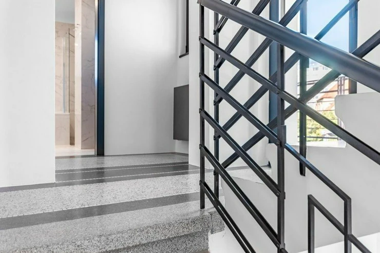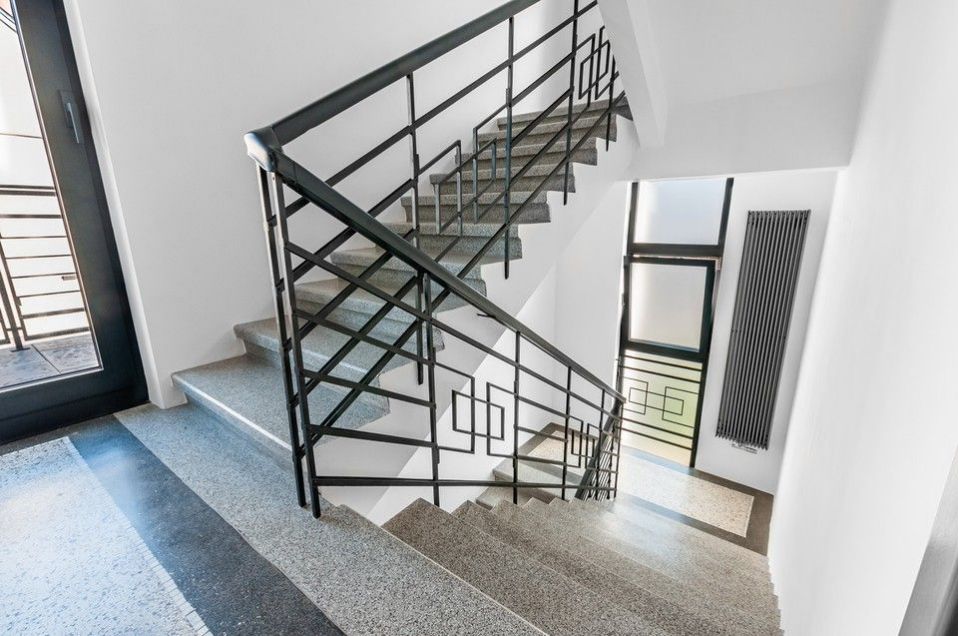 Preserved original elements include, for example, the staircase with windows, the original renovatedterrazzo in the hallways and on the staircase.