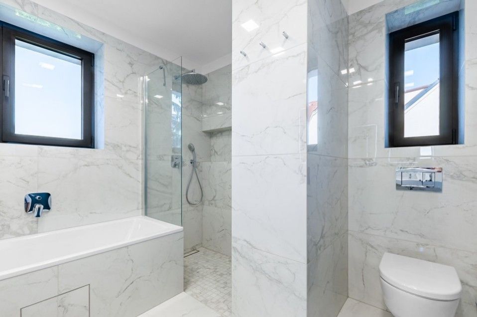 The above-standard new equipment throughout the house includes a fully equipped kitchen with appliances, REYNAERS COATEX aluminum windows with insulating triple glazing, massive REYNAERS COATEX aluminum entrance doors, interior doors painted in a gray design, the original restored staircase, wooden floors, underfloor heating in the bathrooms, a new gas boiler, top-quality bathrooms with tiles in a gray marble decor, artificial irrigation throughout the entire garden, a rainwater tank, a completely new fence with ornate custom-made fittings, a remote-controlled entrance gate drive.