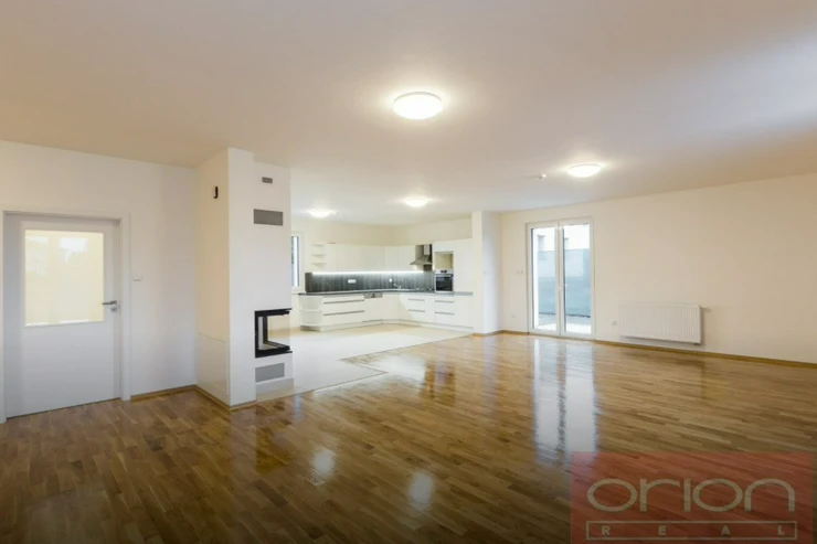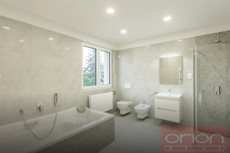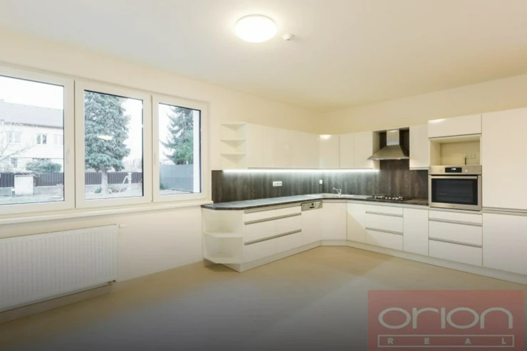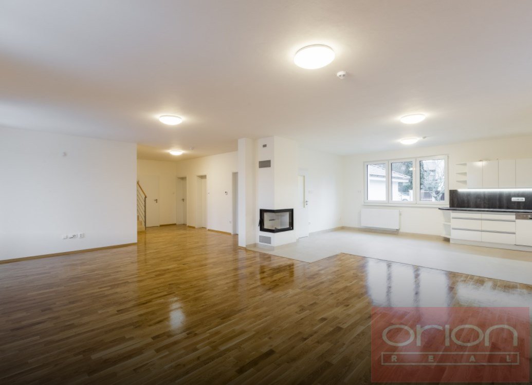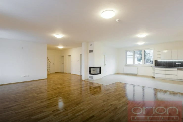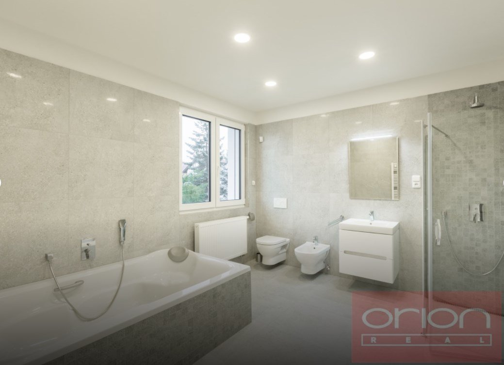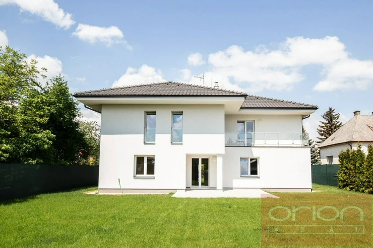 We offer for rent a modern five bedroom family house with a well-kept garden in a quiet location in a development of family houses in Újezd u Průhonice. The house has a total area of 260 sqm and offers on the ground floor an entrance hall, a fully equipped kitchen with all appliances, a living room with a fireplace and access to the terrace, a bathroom with a bathtub and a shower, a separate toilet, a laundry room and a guest room. In the attic there are 4 bedrooms, two bathrooms with a bathtub and a shower and a terrace. There is a garage for 2 cars. The house is equipped with wooden parquet and tiles, an alarm. The 900 sqm garden has an automatic irrigation system. Good access to the city center and international schools. The bus stop is 150 m from the house, by car there is a close access to the D1 highway.