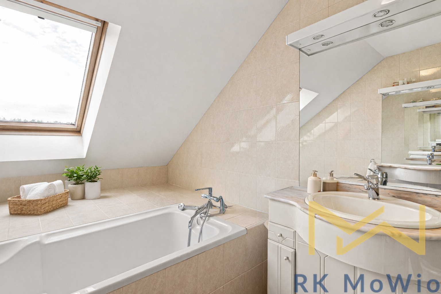 The layout is divided into two floors. The ground floor features an entrance hall, a spacious living room with a fireplace and direct access to the terrace and garden, a dining area, a fully equipped kitchen with a pantry, a bedroom, a bathroom (jacuzzi bathtub, shower, washbasin), a laundry room, a walk-in closet, and a separate toilet. The upper floor offers three bedrooms with walk-in closets, an additional living room with a kitchenette and bar suitable as a family room or guest room, two bathrooms (bathtub or shower, washbasin, bidet, toilet), and a separate toilet. The layout allows for a practical separation of living and private areas. The property also includes a well-maintained garden with a terrace, providing space for relaxation and family activities.