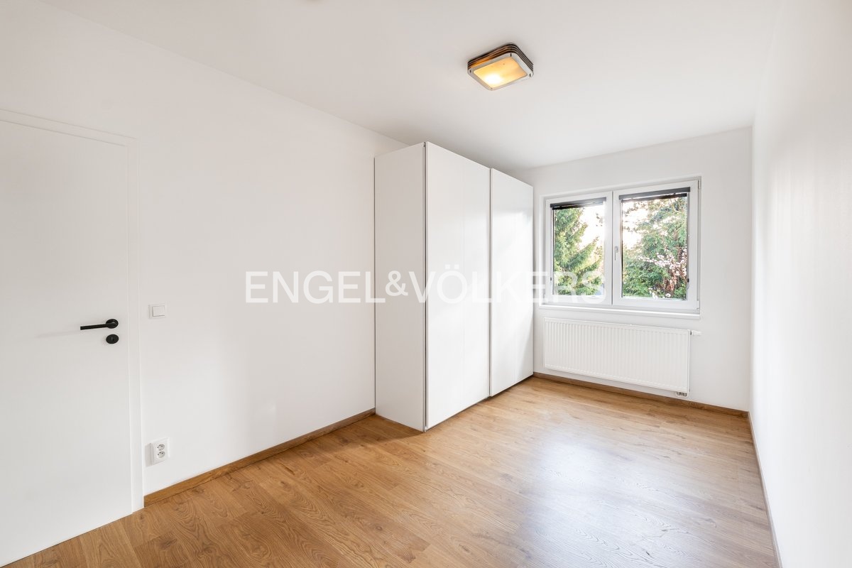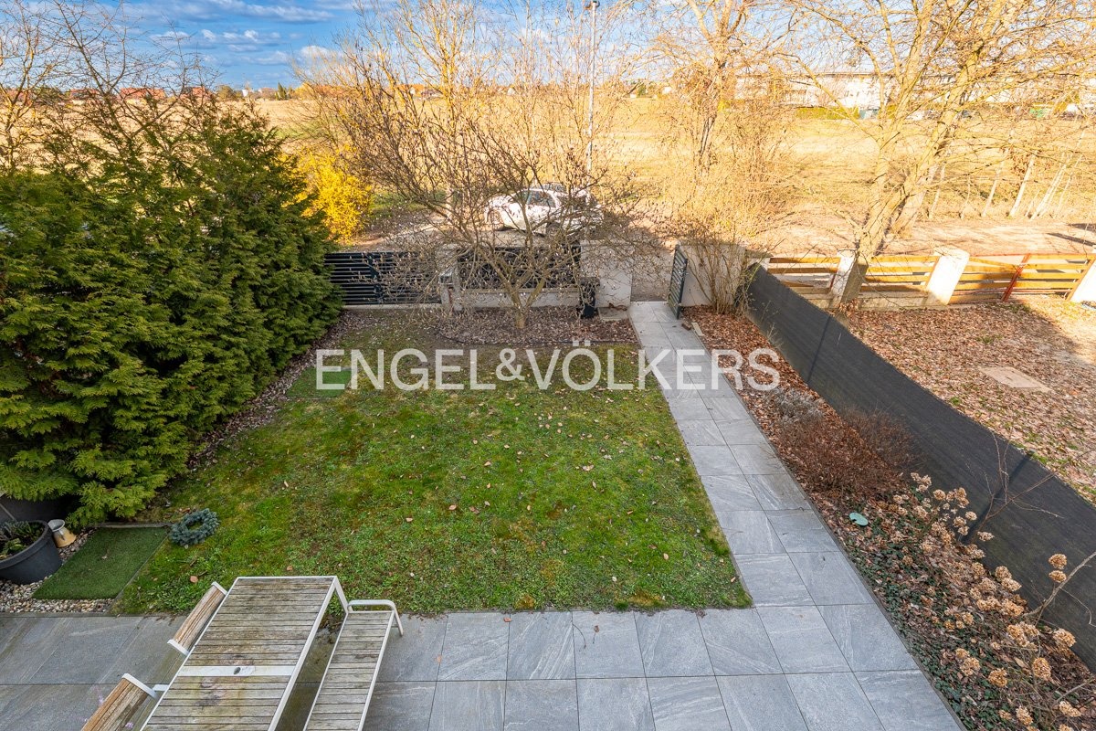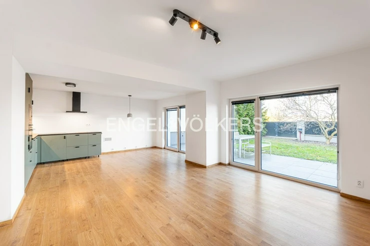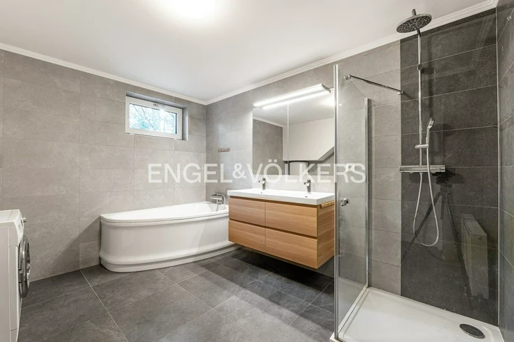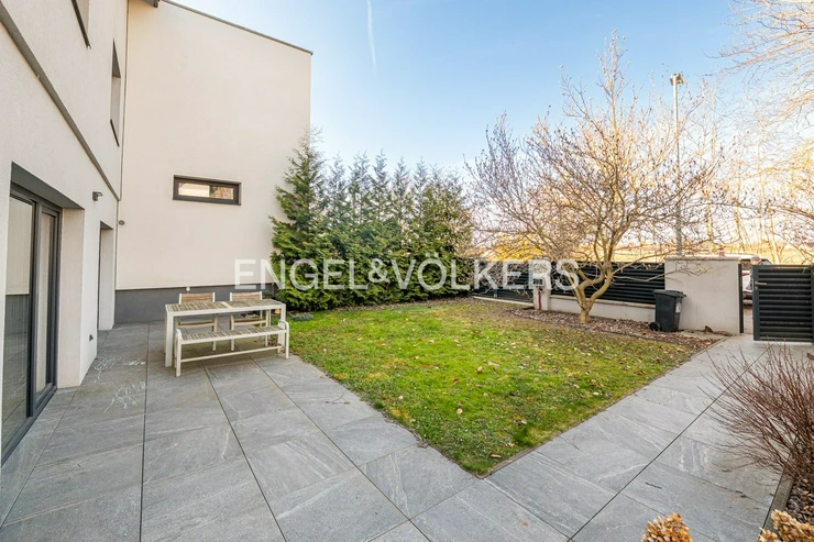 Generously designed private villa with a beautiful garden inspired by style of an American architect F.L. Wright. Large garden, 2 car-garage and swimming pool with the relax zone belong to the elegantly designed villa with layout 7+1 and to the studio apartment with bathroom and separate entrance. Representative entrance hall with the entrance to the workroom, open living room to the dining room, library with a fireplace and the entrance to the garden in the ground floor. Fully equipped kitchen with the access to the technical room and to the separate studio apartment. The first floor provides four separate ensuite bedrooms. The master bedroom with the access to the balcony overlooking the garden provides large cloakroom with built-in wardrobes and direct access to the luxury bathroom. Quiet residential location with all public amenities and rich of sport opportunities.