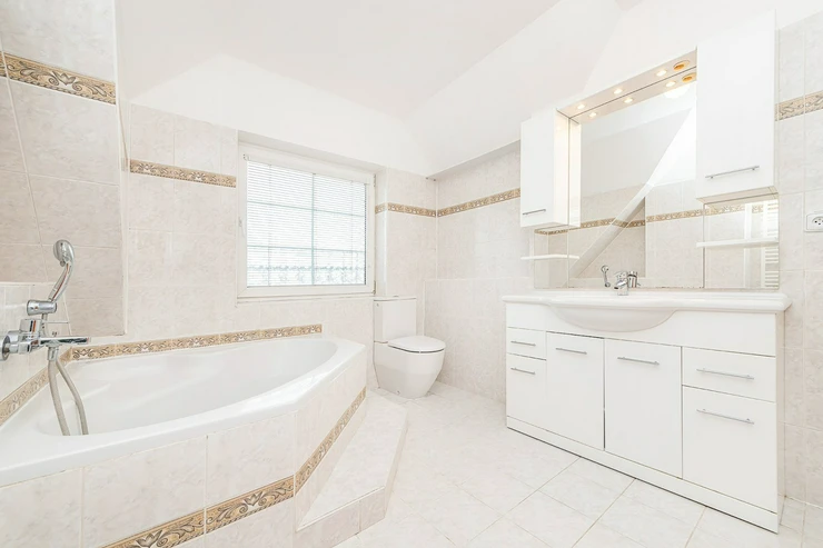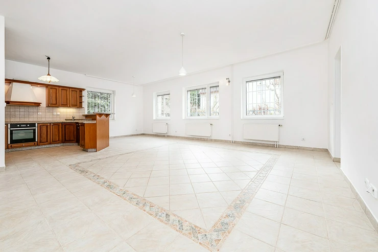 The house has a total area of 300 m² and features an entrance hall, a living room connected to a fully equipped kitchen and dining area with access to a terrace, 5 bedrooms, 4 bathrooms, three additional rooms in the residential basement, and a laundry room with a washing machine and dryer.The property is equipped with built-in wardrobes, parquet and tiled floors, an alarm system, and internet connection. A well-maintained garden and a garage for two cars are also available.